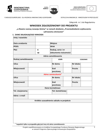Załącznik nr 1 do Regulaminu WNIOSEK ZGŁOSZENIOWY DO PROJEKTU „e-Rawicz szansą rozwoju Gminy” w ramach działania „Przeciwdziałanie wykluczeniu cyfrowemu eInclusion” 1. DANE SKŁADAJĄCEGO WNIOSEK Imię i nazwisko Data urodzenia Miejsce PESEL Wiek Płeć K M Rodzaj, seria i nr dokumentu tożsamości Adres zameldowania Rodzaj zameldowania stałe czasowe Ulica Nr domu Nr lokalu Miejscowość Kod pocztowy Poczta Adres zamieszkania1 Ulica Nr domu Nr lokalu Miejscowość Kod pocztowy Poczta Dane kontaktowe Tel. stacjonarny Tel. komórkowy Adres e-mail Krótkie uzasadnienie udziału w projekcie 1 wypełnić tylko w przypadku gdy jest inny niż adres zameldowania Projekt współfinansowany ze środków Europejskiego Funduszu Rozwoju Regionalnego w ramach Programu Operacyjnego Innowacyjna Gospodarka 1 2. DANE OSOBY/DZIECKA NIEPEŁNOSPRAWNEGO ZGŁASZANEGO DO PROJEKTU (posiadającego orzeczenie o stopniu niepełnosprawności/orzeczenie o niepełnosprawności) Oświadczenie o stopniu niepełnosprawności/orzeczenie o niepełnosprawności1 Stopień (orzeczenie o niepełnospra wności) Rodzaj niepełnospra wności ZNACZNY WAŻNE DO …………………………… UMIARKOWANY BEZTERMINOWE W PRZYPADKU DZIECI Z ORZECZONĄ NIEPEŁNOSPRAWNOŚCIĄ schorzenie narządu ruchu upośledzenie umysłowe schorzenie narządu wzroku schorzenie narządu słuchu inne (proszę wpisać jakie) …………………………………………………………...………………………………………….. 1 wypełnić jeśli dotyczy (jeśli dotyczy należy załączyć kserokopię orzeczenia) Projekt współfinansowany ze środków Europejskiego Funduszu Rozwoju Regionalnego w ramach Programu Operacyjnego Innowacyjna Gospodarka 2 Oświadczenie Oświadczam, że: 1. Moje gospodarstwo domowe spełnia kryterium dochodowe upoważniające do otrzymania wsparcia w ramach systemu pomocy społecznej(art. 8 ust. 1 pkt. 2 ustawy z dnia 12 marca 2004 r. o pomocy społecznej (j.t. Dz. U. z 2015, poz.163 ) /wsparcia w ramach świadczeń rodzinnych (z art. 3,5, 24 ust 6-7, art. 16a ustawy dnia 28.11.2013 o świadczeniach rodzinnych Dz. U. z 2013 poz. 1456 z póź zm.) 2. W moim gospodarstwie domowym wychowywane są dzieci i młodzież, znajdująca się w trudnej sytuacji materialnej i społecznej uprawniającej do uzyskania stypendiów socjalnych (szkolnych), typowana do otrzymania wsparcia we współpracy z ośrodkiem pomocy społecznej. 3. W moim gospodarstwie domowym mieszka(ją) dzieci(ko)/ osoba z ważnym orzeczeniem o niepełnosprawności 4. Moje gospodarstwo domowe jest rodziną zastępczą 5. Moje gospodarstwo jest rodzinnym domem dziecka 6. Jestem samotnym rodzicem. 7. Jestem rodziną wielodzietną ( 3 i więcej dzieci) 8. Oświadczam, iż zapoznałem(am) się z Regulaminem rekrutacji i uczestnictwa w projekcie „e-Rawicz szansą rozwoju Gminy” akceptuję jego postanowienia i zobowiązuje się do jego przestrzegania. 9. Oświadczam, że zostałem(am) poinformowany(a), że niniejszy Projekt jest współfinansowany ze środków Unii Europejskiej z Europejskiego Funduszu Rozwoju Regionalnego w ramach Programu Operacyjnego Innowacyjna Gospodarka. 10. Zobowiązuję się do przedłożenia wszelkich informacji, dokumentów oraz oświadczeń niezbędnych do prawidłowej realizacji projektu. 11. Przyjmuję do wiadomości, że złożenie Wniosku Zgłoszeniowego nie jest jednoznaczne z przyjęciem mnie do Projektu. 12. Przyjmuję do wiadomości, że decyzja Komisji Rekrutacyjnej jest ostateczna i nie służy od niej odwołanie. 13. Przyjmuję do wiadomości, że w przypadku ograniczeń technicznych uniemożliwiających podłączenie do posesji Internetu szerokopasmowego mogę zostać wykluczony z uczestnictwa w projekcie, nawet w przypadku spełnienia wszystkich pozostałych warunków uczestnictwa. 14. Zgodnie z Ustawą o ochronie danych osobowych z dnia 29.08.1997r., /Dz. U. nr 133 poz. 883 z późn. zm./ wyrażam zgodę na przetwarzanie moich danych osobowych dla potrzeb procesu rekrutacji, realizacji, ewaluacji, monitoringu i sprawozdawczości projektu „eRawicz szansą rozwoju Gminy” realizowanego przez Gminę Rawicz w ramach Programu Projekt współfinansowany ze środków Europejskiego Funduszu Rozwoju Regionalnego w ramach Programu Operacyjnego Innowacyjna Gospodarka 3 Operacyjnego Innowacyjna Gospodarka. Zostałem(am) poinformowany(na) o prawie dostępu do przetwarzanych przez realizatorów projektu moich danych osobowych wraz z prawem do żądania ich zmian, uzupełnienia lub usunięcia. 15. Świadomy(a) odpowiedzialności karnej przewidzianej w art. 233 ustawy z dnia 6 czerwca 1997 r. Kodeks karny /Dz. U. Nr 88, poz. 553 z poźn. zm./ oświadczam, że wszystkie dane zawarte we Wniosku Zgłoszeniowym oraz w załącznikach są zgodne z prawdą. ……………………….…….……………………………………….. /miejscowość, data/ .………………………………………………………… /czytelny podpis Wnioskodawcy/ Uwaga: do formularza zgłoszeniowego należy dołączyć: 1. w przypadku korzystania ze świadczeń pomocy społecznej lub świadczeń rodzinnych zaświadczenia o korzystaniu ze świadczeń wydane przez MGOPS w Rawiczu 2.w przypadku nie korzystania ze świadczeń pomocy społecznej lub świadczeń rodzinnych zaświadczenie o dochodach o jakich mowa w pkt. 2 Informacji oraz jeśli dotyczy: 3. potwierdzenie o pobieraniu stypendium (decyzja lub zaświadczenie z MGOPS w Rawiczu) 3. kserokopię orzeczenia o niepełnosprawności lub stopniu niepełnosprawności Projekt współfinansowany ze środków Europejskiego Funduszu Rozwoju Regionalnego w ramach Programu Operacyjnego Innowacyjna Gospodarka 4 OŚWIADCZENIE O WYSOKOŚCI DOCHODÓW Ja, niżej podpisany(a) .................................................................................. zamieszkały(a) (imię i nazwisko Wnioskodawcy) ....................................................................................