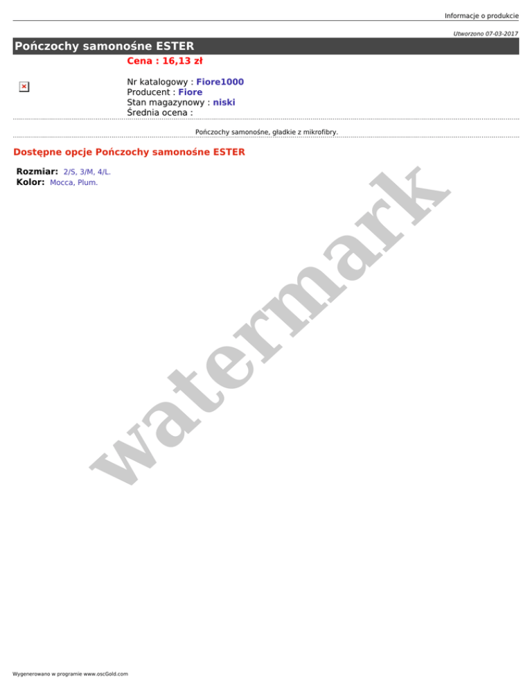 Informacje o produkcie Utworzono 07-03-2017 Pończochy samonośne ESTER Cena : 16,13 zł Nr katalogowy : Fiore1000 Producent : Fiore Stan magazynowy : niski Średnia ocena : Pończochy samonośne, gładkie z mikrofibry. Dostępne opcje Pończochy samonośne ESTER w at er m ar k Rozmiar: 2/S, 3/M, 4/L. Kolor: Mocca, Plum. Wygenerowano w programie www.oscGold.com