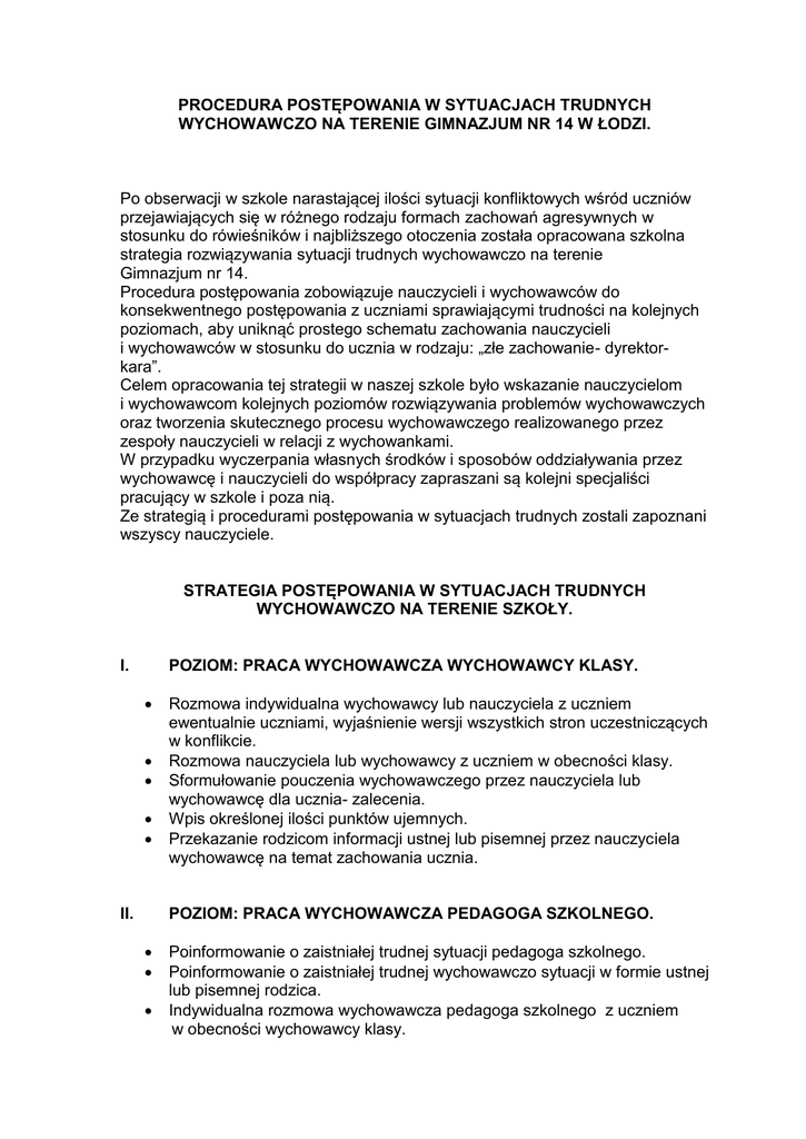 PROCEDURA POSTĘPOWANIA W SYTUACJACH TRUDNYCH WYCHOWAWCZO NA TERENIE GIMNAZJUM NR 14 W ŁODZI. Po obserwacji w szkole narastającej ilości sytuacji konfliktowych wśród uczniów przejawiających się w różnego rodzaju formach zachowań agresywnych w stosunku do rówieśników i najbliższego otoczenia została opracowana szkolna strategia rozwiązywania sytuacji trudnych wychowawczo na terenie Gimnazjum nr 14. Procedura postępowania zobowiązuje nauczycieli i wychowawców do konsekwentnego postępowania z uczniami sprawiającymi trudności na kolejnych poziomach, aby uniknąć prostego schematu zachowania nauczycieli i wychowawców w stosunku do ucznia w rodzaju: „złe zachowanie- dyrektorkara”. Celem opracowania tej strategii w naszej szkole było wskazanie nauczycielom i wychowawcom kolejnych poziomów rozwiązywania problemów wychowawczych oraz tworzenia skutecznego procesu wychowawczego realizowanego przez zespoły nauczycieli w relacji z wychowankami. W przypadku wyczerpania własnych środków i sposobów oddziaływania przez wychowawcę i nauczycieli do współpracy zapraszani są kolejni specjaliści pracujący w szkole i poza nią. Ze strategią i procedurami postępowania w sytuacjach trudnych zostali zapoznani wszyscy nauczyciele. STRATEGIA POSTĘPOWANIA W SYTUACJACH TRUDNYCH WYCHOWAWCZO NA TERENIE SZKOŁY. I. POZIOM: PRACA WYCHOWAWCZA WYCHOWAWCY KLASY. II. Rozmowa indywidualna wychowawcy lub nauczyciela z uczniem ewentualnie uczniami, wyjaśnienie wersji wszystkich stron uczestniczących w konflikcie. Rozmowa nauczyciela lub wychowawcy z uczniem w obecności klasy. Sformułowanie pouczenia wychowawczego przez nauczyciela lub wychowawcę dla ucznia- zalecenia. Wpis określonej ilości punktów ujemnych. Przekazanie rodzicom informacji ustnej lub pisemnej przez nauczyciela wychowawcę na temat zachowania ucznia. POZIOM: PRACA WYCHOWAWCZA PEDAGOGA SZKOLNEGO. Poinformowanie o zaistniałej trudnej sytuacji pedagoga szkolnego. Poinformowanie o zaistniałej trudnej wychowawczo sytuacji w formie ustnej lub pisemnej rodzica. Indywidualna rozmowa wychowawcza pedagoga szkolnego z uczniem w obecności wychowawcy klasy. Rozmowa wychowawcza rodzica z dzieckiem w obecności pedagoga oraz wychowawcy (wezwanie rodzica do szkoły- rozmowa ostrzegawcza). Sytuacje wyjątkowo trudne- zwołanie nadzwyczajnego posiedzenia zespołu wychowawczego i opracowanie wspólnej strategii postępowania (ewentualnie wniosek o udzielenie wyższego stopnia kary zgodnie ze statutem szkoły). Spotkanie wychowawcze z klasą pedagoga szkolnego i wychowawcy klasy oraz rodziców. Wypracowanie klasowych sposobów rozwiązywania sytuacji konfliktowych w klasie (interwencja klasy jako zespołu) na godzinie wychowawczej z udziałem pedagoga (cykl spotkań) i wychowawcy klasy. Spotkania wychowawcze w przypadku braku poprawy z zaproszoną osoba- specjalistą np. psychologiem, kuratorem sadowym. Zgłoszenie sytuacji wyjątkowo trudnej wychowawczo do dyrektora szkoły (w przypadku wyczerpania dostępnych środków wychowawczych). III.POZIOM: PRACA WYCHOWAWCZA DYREKTORA SZKOŁY. Zapoznanie z przebiegiem dotychczasowych udokumentowanych działań wychowawcy i pedagoga. Rozmowa indywidualna dyrektora z uczniem (uczniami). Rozmowa indywidualna rodzica w obecności dyrektora szkoły z uczniem. Spotkanie dyrektora szkoły z zespołem klasowym i uczniami w przypadku konfliktu wewnątrzklasowego (rozmowa wychowawcza). Opracowanie wspólnych form wychowawczych w stosunku do uczniów np.: o Sprawozdania wychowawcze. o Samoocena ucznia. o Pochwała. Udzielenie regulaminowych kar zapisanych w statucie szkoły i WZO. IV. W PRZYPADKU CIĘŻKIEGO NARUSZENIA OBOWIĄZKÓW UCZNIA SZKOŁA STOSUJE PROCEDURY POSTEPOWANIA USTALONE PRZEZ INSTYTYCJE WSPÓŁPRACUJACE Z OŚWIATĄ (POLICJA, STRAŻ MIEJSKA, SĄD). Postanowienia końcowe: 1. Procedura wchodzi w życie z dniem 25.10.2010 roku po zapoznaniu i akceptacji Rady Pedagogicznej Publicznego Gimnazjum nr 14. 2. Procedurę opracowały: i. Dyrektor Publicznego Gimnazjum nr 14 Renata Lipińska ii. Pedagog szkolny Anetta Sibińska.
