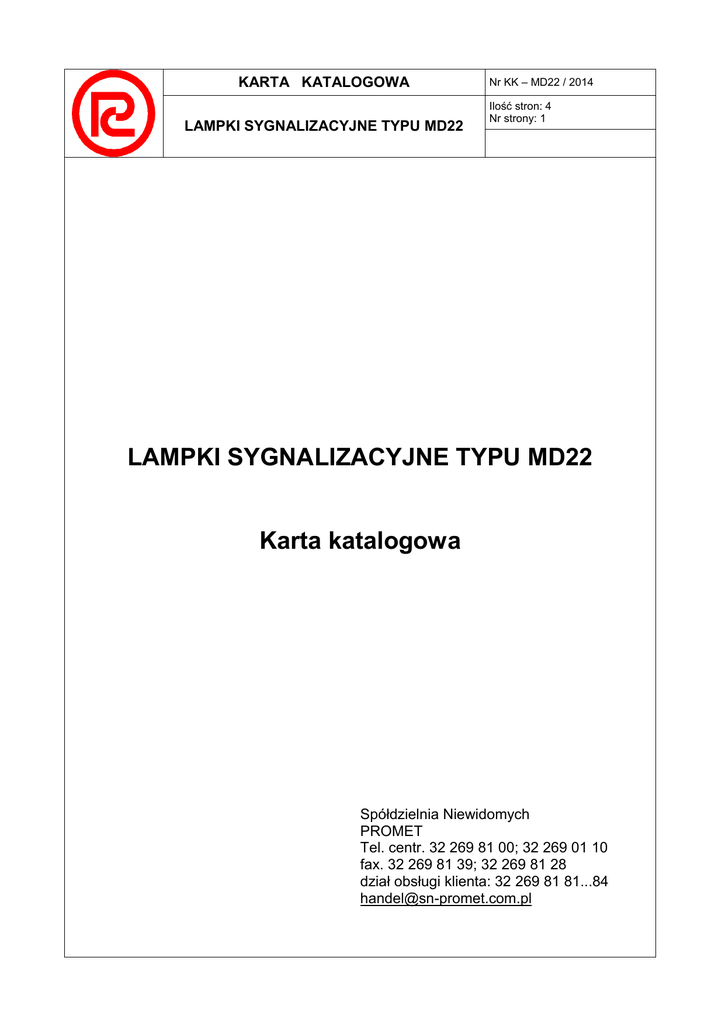 KARTA KATALOGOWA LAMPKI SYGNALIZACYJNE TYPU MD22 Nr KK – MD22 / 2014 Ilość stron: 4 Nr strony: 1 LAMPKI SYGNALIZACYJNE TYPU MD22 Karta katalogowa Spółdzielnia Niewidomych PROMET Tel. centr. 32 269 81 00; 32 269 01 10 fax. 32 269 81 39; 32 269 81 28 dział obsługi klienta: 32 269 81 81...84 [email protected] SN PROMET Strona 2 Stron 4 Nr KK – MD22 / 2014 Dane techniczne Napięcie zasilania Us Moc znamionowa Ps Rodzaj elementu świecącego Maksymalna grubość pulpitu Przekroje przewodów zasilających Stopień ochrony: - część nadpulpitowa - część podpulpitowa Temperatura pracy Wyrób zgodny z normą PN-EN 60947-5-1 24-230V AC/DC max 1W LED 6mm 0,75-1,5 mm2 LY 1-1,5 mm2 DY IP 66/67 IP 20 -40 … +50C Przeznaczenie, budowa i montaż Lampki sygnalizacyjne typu MD22 z korpusami z tworzywa sztucznego są przeznaczone do wbudowania w znormalizowane otwory Ø22,5 mm wykonane w pulpitach, tablicach sterowniczo-sygnalizacyjnych lub bezpośrednio w korpusach maszyn i urządzeń. Mogą być użytkowane w różnych strefach klimatycznych, w dowolnym położeniu, w warunkach środowiska przemysłowego o stopniu zanieczyszczenia 2. Lampki sygnalizacyjne typu MD22 mają obudowę z tworzywa sztucznego w kolorze niebieskim, natomiast część nadpulpitową stanowi metalowa nakrętka oraz klosz (płaski lub sferyczny) wykonany z przezroczystego poliwęglanu. Przewody podłączane są do lampki za pomocą zacisków śrubowych. W celu montażu korpus lampki wraz z uszczelką należy włożyć do otworu montażowego od strony czołowej pulpitu, a następnie wsunąć na korpus i nakręcić do oporu nakrętkę mocującą pod pulpitem. W przypadku demontażu, należy odkręcić i zdjąć nakrętkę mocującą, a następnie wyjąć korpus wraz z uszczelką z otworu montażowego. SN PROMET Strona 3 Nr KK – MD22 / 2014 Stron 4 LAMPKI SYGNALIZACYJNE ŚWIECĄCE ŚWIATŁEM CIĄGŁYM Rodzaj z kloszem płaskim IP Oznaczenie lampki 66/67 MD22Pc MD22Pz MD22Pg MD22Pn MD22Pb z kloszem sferycznym 66/67 MD22Sc MD22Sz MD22Sg MD22Sn MD22Sb Kolor klosza Masa [g] czerwony 20 zielony żółty niebieski bezbarwny czerwony zielony żółty niebieski bezbarwny 22 LAMPKI SYGNALIZACYJNE BŁYSKAJĄCE Rodzaj z kloszem płaskim z kloszem sferycznym IP Oznaczenie lampki 66/67 MD22PBc MD22PBz MD22PBg MD22PBn MD22PBb 65 MD22SBc MD22SBz MD22SBg MD22SBn MD22SBb Kolor klosza Masa [g] czerwony 20 zielony żółty niebieski bezbarwny czerwony zielony żółty niebieski bezbarwny 22 SN PROMET Strona 4 Stron 4 Nr KK – MD22 / 2014 Wymiary gabarytowe Lampka sygnalizacyjna typu MD22P… Lampka sygnalizacyjna typu MD22S…