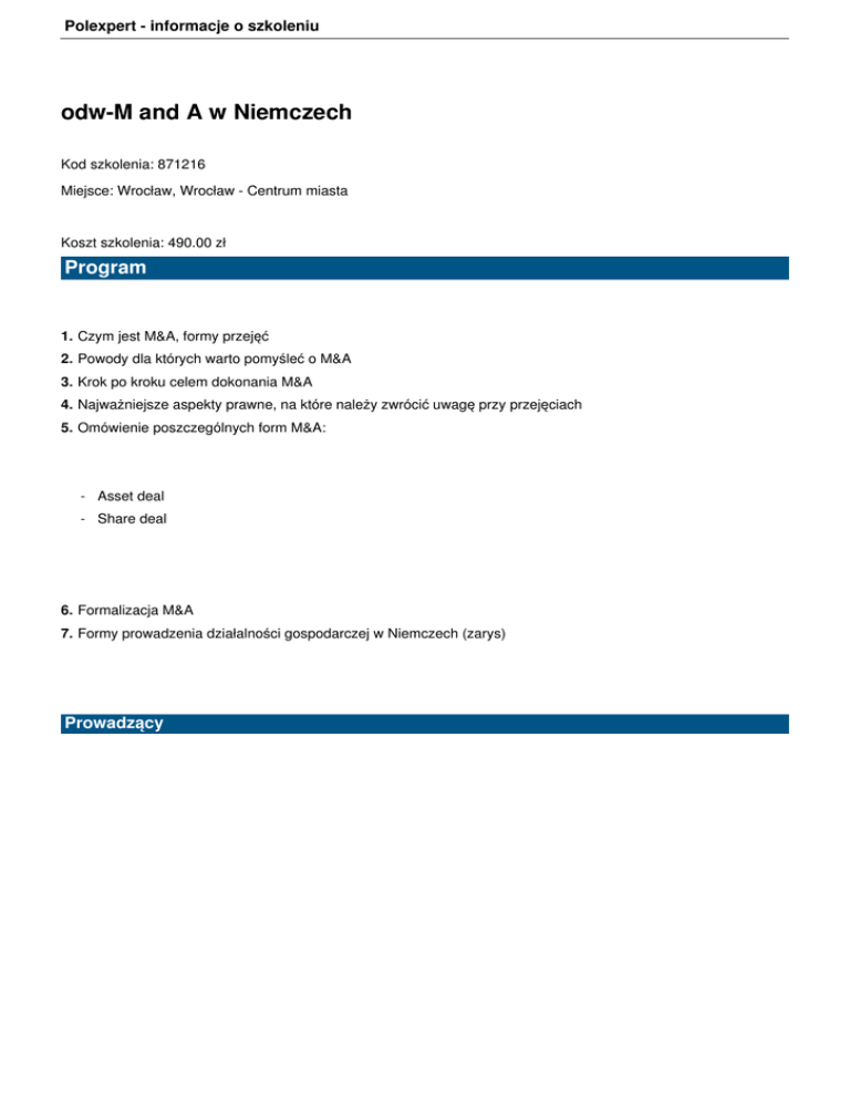 Polexpert - informacje o szkoleniu odw-M and A w Niemczech Kod szkolenia: 871216 Miejsce: Wrocław, Wrocław - Centrum miasta Koszt szkolenia: 490.00 zł Program 1. Czym jest M&A, formy przejęć 2. Powody dla których warto pomyśleć o M&A 3. Krok po kroku celem dokonania M&A 4. Najważniejsze aspekty prawne, na które należy zwrócić uwagę przy przejęciach 5. Omówienie poszczególnych form M&A: - Asset deal - Share deal 6. Formalizacja M&A 7. Formy prowadzenia działalności gospodarczej w Niemczech (zarys) Prowadzący