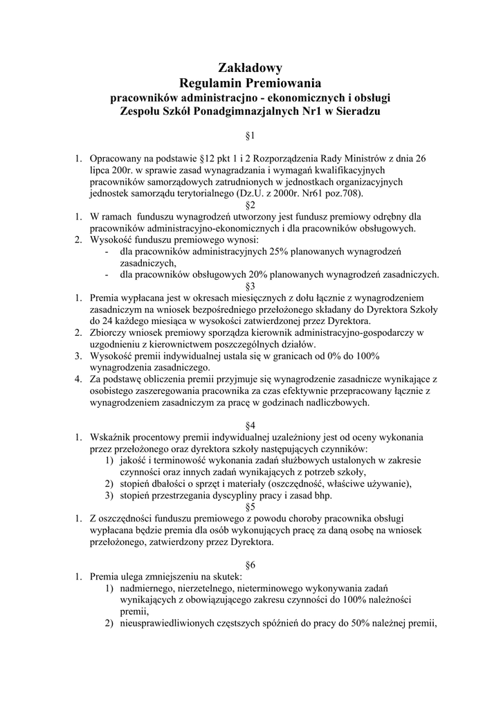 Zakładowy Regulamin Premiowania pracowników administracjno - ekonomicznych i obsługi Zespołu Szkół Ponadgimnazjalnych Nr1 w Sieradzu §1 1. Opracowany na podstawie §12 pkt 1 i 2 Rozporządzenia Rady Ministrów z dnia 26 lipca 200r. w sprawie zasad wynagradzania i wymagań kwalifikacyjnych pracowników samorządowych zatrudnionych w jednostkach organizacyjnych jednostek samorządu terytorialnego (Dz.U. z 2000r. Nr61 poz.708). §2 1. W ramach funduszu wynagrodzeń utworzony jest fundusz premiowy odrębny dla pracowników administracyjno-ekonomicznych i dla pracowników obsługowych. 2. Wysokość funduszu premiowego wynosi: - dla pracowników administracyjnych 25% planowanych wynagrodzeń zasadniczych, - dla pracowników obsługowych 20% planowanych wynagrodzeń zasadniczych. §3 1. Premia wypłacana jest w okresach miesięcznych z dołu łącznie z wynagrodzeniem zasadniczym na wniosek bezpośredniego przełożonego składany do Dyrektora Szkoły do 24 każdego miesiąca w wysokości zatwierdzonej przez Dyrektora. 2. Zbiorczy wniosek premiowy sporządza kierownik administracyjno-gospodarczy w uzgodnieniu z kierownictwem poszczególnych działów. 3. Wysokość premii indywidualnej ustala się w granicach od 0% do 100% wynagrodzenia zasadniczego. 4. Za podstawę obliczenia premii przyjmuje się wynagrodzenie zasadnicze wynikające z osobistego zaszeregowania pracownika za czas efektywnie przepracowany łącznie z wynagrodzeniem zasadniczym za pracę w godzinach nadliczbowych. §4 1. Wskaźnik procentowy premii indywidualnej uzależniony jest od oceny wykonania przez przełożonego oraz dyrektora szkoły następujących czynników: 1) jakość i terminowość wykonania zadań służbowych ustalonych w zakresie czynności oraz innych zadań wynikających z potrzeb szkoły, 2) stopień dbałości o sprzęt i materiały (oszczędność, właściwe używanie), 3) stopień przestrzegania dyscypliny pracy i zasad bhp. §5 1. Z oszczędności funduszu premiowego z powodu choroby pracownika obsługi wypłacana będzie premia dla osób wykonujących pracę za daną osobę na wniosek przełożonego, zatwierdzony przez Dyrektora. §6 1. Premia ulega zmniejszeniu na skutek: 1) nadmiernego, nierzetelnego, nieterminowego wykonywania zadań wynikających z obowiązującego zakresu czynności do 100% należności premii, 2) nieusprawiedliwionych częstszych spóźnień do pracy do 50% należnej premii, 3) nie przestrzeganie zasad współżycia społecznego powodującego zatargi miedzy pracownikami i stworzenie sytuacji konfliktowych do 50% należnej premii, 4) samowolne opuszczanie stanowiska pracy bez usprawiedliwienia do 100% należnej premii. 5. Pracownicy obsługi za zwolnienia lekarskie (z wyjątkiem zwolnień z tytułu wypadku przy pracy): do 5 dni – 5% należnej premii 6-10 dni – 10% należnej premii powyżej 10 dni – całkowicie pozbawia premii. 6. Inne nie objęte w/w punktami wg uznania przełożonego lub Dyrektora Szkoły. §7 1. Pracownik zostaje pozbawiony całkowicie premii na skutek: 1) spożywania alkoholu w godzinach pracy, 2) świadomego zniszczenia mienia szkolnego, 3) lekceważenia przepisów bhp i p.poż, 4) nieusprawiedliwionej nieobecności w pracy, 5) kradzieży mienia społecznego, 6) działania na szkodę szkoły. §8 1. Regulamin wchodzi w życie z dniem podjęcia uchwały. 2. Jednocześnie traci ważność poprzedni regulamin premiowania pracowników administracyjno-ekonomicznych i obsługi. §9 1. Regulamin pozytywnie został zaopiniowany przez Związki zawodowe działające na terenie Zespołu Szkół Ponadgimnazjalnych Nr1 w Sieradzu. Zatwierdził: