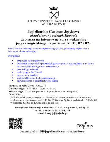 Jagiellońskie Centrum Językowe akredytowany członek Eaquals zaprasza na intensywne kursy wakacyjne języka angielskiego na poziomach: B1, B2 i B2+ Jeżeli chcesz rozwinąć swoje umiejętności językowe, już dzisiaj zapisz się na intensywny kurs wakacyjny. Oferujemy: 30 godzin 45 minutowych ćwiczenie wszystkich sprawności językowych, ze szczególnym naciskiem na rozwijanie umiejętności komunikacji powtórkę gramatyki małe grupy - do 12 osób przyjazną atmosferę wykwalifikowaną kadrę akademicką zaświadczenie o uczestnictwie w kursie Terminy kursów: 27.06 -7.07.2016 Godziny zajęć: 16.00 -19.15 (pon, wt, śr, cz) Miejsce zajęć: JCJ ul. Krupnicza 2 ( naprzeciwko Teatru Bagatela) Cena: 400zł Jeśli nie jesteś pewny swojego poziomu językowego zapraszamy na rozmowę z lektorem w czerwcowe piątki: 10.06, 17.06 oraz 24.06 w godzinach 12.00-14.00 w siedzibie JCJ UJ ul. Krupnicza 2, pokój 101. Szczegółowe informacje w siedzibie JCJ, ul. Krupnicza 2, pokój 101. tel. 012 421-36-11 012 426-13-65 e-mail:[email protected] Jesteśmy też na FB/jagiellonskie.centrum.jezykowe