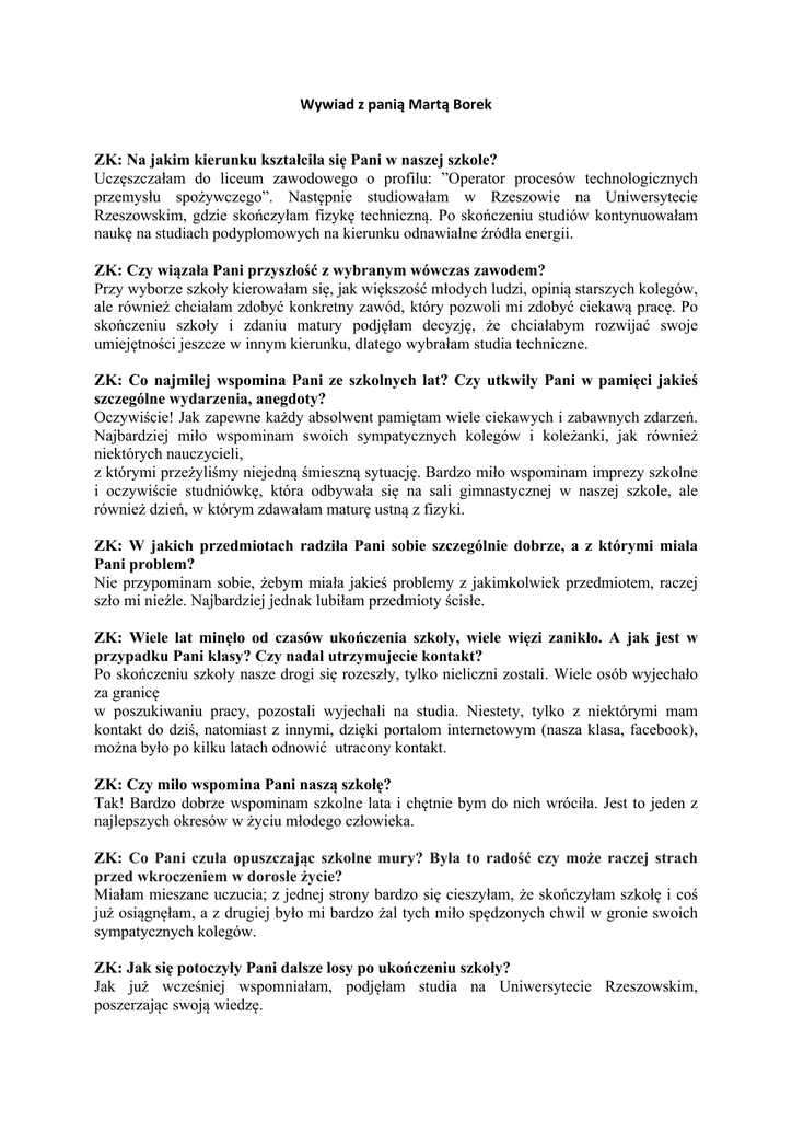 Wywiad z panią Martą Borek ZK: Na jakim kierunku kształciła się Pani w naszej szkole? Uczęszczałam do liceum zawodowego o profilu: ”Operator procesów technologicznych przemysłu spożywczego”. Następnie studiowałam w Rzeszowie na Uniwersytecie Rzeszowskim, gdzie skończyłam fizykę techniczną. Po skończeniu studiów kontynuowałam naukę na studiach podyplomowych na kierunku odnawialne źródła energii. ZK: Czy wiązała Pani przyszłość z wybranym wówczas zawodem? Przy wyborze szkoły kierowałam się, jak większość młodych ludzi, opinią starszych kolegów, ale również chciałam zdobyć konkretny zawód, który pozwoli mi zdobyć ciekawą pracę. Po skończeniu szkoły i zdaniu matury podjęłam decyzję, że chciałabym rozwijać swoje umiejętności jeszcze w innym kierunku, dlatego wybrałam studia techniczne. ZK: Co najmilej wspomina Pani ze szkolnych lat? Czy utkwiły Pani w pamięci jakieś szczególne wydarzenia, anegdoty? Oczywiście! Jak zapewne każdy absolwent pamiętam wiele ciekawych i zabawnych zdarzeń. Najbardziej miło wspominam swoich sympatycznych kolegów i koleżanki, jak również niektórych nauczycieli, z którymi przeżyliśmy niejedną śmieszną sytuację. Bardzo miło wspominam imprezy szkolne i oczywiście studniówkę, która odbywała się na sali gimnastycznej w naszej szkole, ale również dzień, w którym zdawałam maturę ustną z fizyki. ZK: W jakich przedmiotach radziła Pani sobie szczególnie dobrze, a z którymi miała Pani problem? Nie przypominam sobie, żebym miała jakieś problemy z jakimkolwiek przedmiotem, raczej szło mi nieźle. Najbardziej jednak lubiłam przedmioty ścisłe. ZK: Wiele lat minęło od czasów ukończenia szkoły, wiele więzi zanikło. A jak jest w przypadku Pani klasy? Czy nadal utrzymujecie kontakt? Po skończeniu szkoły nasze drogi się rozeszły, tylko nieliczni zostali. Wiele osób wyjechało za granicę w poszukiwaniu pracy, pozostali wyjechali na studia. Niestety, tylko z niektórymi mam kontakt do dziś, natomiast z innymi, dzięki portalom internetowym (nasza klasa, facebook), można było po kilku latach odnowić utracony kontakt. ZK: Czy miło wspomina Pani naszą szkołę? Tak! Bardzo dobrze wspominam szkolne lata i chętnie bym do nich wróciła. Jest to jeden z najlepszych okresów w życiu młodego człowieka. ZK: Co Pani czuła opuszczając szkolne mury? Była to radość czy może raczej strach przed wkroczeniem w dorosłe życie? Miałam mieszane uczucia; z jednej strony bardzo się cieszyłam, że skończyłam szkołę i coś już osiągnęłam, a z drugiej było mi bardzo żal tych miło spędzonych chwil w gronie swoich sympatycznych kolegów. ZK: Jak się potoczyły Pani dalsze losy po ukończeniu szkoły? Jak już wcześniej wspomniałam, podjęłam studia na Uniwersytecie Rzeszowskim, poszerzając swoją wiedzę. ZK: Czym się Pani zajmuje obecnie? Czy jest Pani zadowolona ze swej pracy? Obecnie pracuję jako nauczycielka w tutejszej szkole. Czy jestem zadowolona? Jak najbardziej, bardzo lubię pracę, w której jest ciągły kontakt z nowymi osobami. Cieszę się bardzo, że dzięki tej pracy mogę się rozwijać i nabywać nowych umiejętności. ZK: Jakie są Pani zainteresowania, pasje? Może ma Pani jakieś marzenia, którymi zechciałaby się Pani z nami podzielić? Bardzo lubię podróżować, kiedy jestem w nowym miejscu czuje że „żyję”. ZK: Co jest Pani życiowym priorytetem? Moim życiowym priorytetem jest rodzinna. ZK: Może zechciałaby Pani przekazać jakąś dobrą myśl, refleksję młodszemu pokoleniu naszej szkoły? Moja sugestia dla uczniów jest taka, żeby nie rezygnowali za szybko ze swoich marzeń mimo różnych przeciwności losu. Pamiętajcie również: „Życie to raj, do którego klucze są w naszych rękach” (Fiodor Dostojewski). ZK: Dziękujemy.