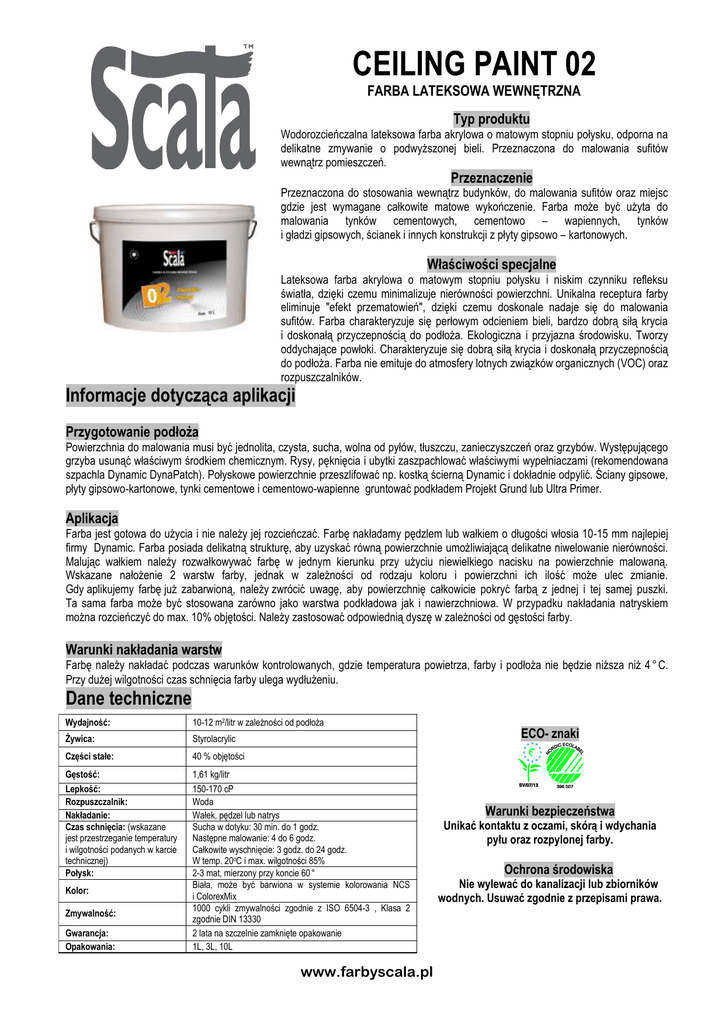 CEILING PAINT 02 FARBA LATEKSOWA WEWNĘTRZNA Typ produktu Wodorozcieńczalna lateksowa farba akrylowa o matowym stopniu połysku, odporna na delikatne zmywanie o podwyższonej bieli. Przeznaczona do malowania sufitów wewnątrz pomieszczeń. Przeznaczenie Przeznaczona do stosowania wewnątrz budynków, do malowania sufitów oraz miejsc gdzie jest wymagane całkowite matowe wykończenie. Farba może być użyta do malowania tynków cementowych, cementowo – wapiennych, tynków i gładzi gipsowych, ścianek i innych konstrukcji z płyty gipsowo – kartonowych. Właściwości specjalne Lateksowa farba akrylowa o matowym stopniu połysku i niskim czynniku refleksu światła, dzięki czemu minimalizuje nierówności powierzchni. Unikalna receptura farby eliminuje "efekt przematowień", dzięki czemu doskonale nadaje się do malowania sufitów. Farba charakteryzuje się perłowym odcieniem bieli, bardzo dobrą siłą krycia i doskonałą przyczepnością do podłoża. Ekologiczna i przyjazna środowisku. Tworzy oddychające powłoki. Charakteryzuje się dobrą siłą krycia i doskonałą przyczepnością do podłoża. Farba nie emituje do atmosfery lotnych związków organicznych (VOC) oraz rozpuszczalników. Informacje dotycząca aplikacji Przygotowanie podłoża Powierzchnia do malowania musi być jednolita, czysta, sucha, wolna od pyłów, tłuszczu, zanieczyszczeń oraz grzybów. Występującego grzyba usunąć właściwym środkiem chemicznym. Rysy, pęknięcia i ubytki zaszpachlować właściwymi wypełniaczami (rekomendowana szpachla Dynamic DynaPatch). Połyskowe powierzchnie przeszlifować np. kostką ścierną Dynamic i dokładnie odpylić. Ściany gipsowe, płyty gipsowo-kartonowe, tynki cementowe i cementowo-wapienne gruntować podkładem Projekt Grund lub Ultra Primer. Aplikacja Farba jest gotowa do użycia i nie należy jej rozcieńczać. Farbę nakładamy pędzlem lub wałkiem o długości włosia 10-15 mm najlepiej firmy Dynamic. Farba posiada delikatną strukturę, aby uzyskać równą powierzchnie umożliwiającą delikatne niwelowanie nierówności. Malując wałkiem należy rozwałkowywać farbę w jednym kierunku przy użyciu niewielkiego nacisku na powierzchnie malowaną. Wskazane nałożenie 2 warstw farby, jednak w zależności od rodzaju koloru i powierzchni ich ilość może ulec zmianie. Gdy aplikujemy farbę już zabarwioną, należy zwrócić uwagę, aby powierzchnię całkowicie pokryć farbą z jednej i tej samej puszki. Ta sama farba może być stosowana zarówno jako warstwa podkładowa jak i nawierzchniowa. W przypadku nakładania natryskiem można rozcieńczyć do max. 10% objętości. Należy zastosować odpowiednią dyszę w zależności od gęstości farby. Warunki nakładania warstw Farbę należy nakładać podczas warunków kontrolowanych, gdzie temperatura powietrza, farby i podłoża nie będzie niższa niż 4°C. Przy dużej wilgotności czas schnięcia farby ulega wydłużeniu. Dane techniczne Wydajność: 10-12 m2/litr w zależności od podłoża Żywica: Styrolacrylic Części stałe: 40 % objętości Gęstość: Lepkość: Rozpuszczalnik: Nakładanie: Czas schnięcia: (wskazane jest przestrzeganie temperatury i wilgotności podanych w karcie technicznej) Połysk: 1,61 kg/litr 150-170 cP Woda Wałek, pędzel lub natrys Sucha w dotyku: 30 min. do 1 godz. Następne malowanie: 4 do 6 godz. Całkowite wyschnięcie: 3 godz. do 24 godz. W temp. 20oC i max. wilgotności 85% 2-3 mat, mierzony przy koncie 60° Biała, może być barwiona w systemie kolorowania NCS i ColorexMix 1000 cykli zmywalności zgodnie z ISO 6504-3 , Klasa 2 zgodnie DIN 13330 2 lata na szczelnie zamknięte opakowanie 1L, 3L, 10L Kolor: Zmywalność: Gwarancja: Opakowania: www.farbyscala.pl ECO- znaki Warunki bezpieczeństwa Unikać kontaktu z oczami, skórą i wdychania pyłu oraz rozpylonej farby. Ochrona środowiska Nie wylewać do kanalizacji lub zbiorników wodnych. Usuwać zgodnie z przepisami prawa.