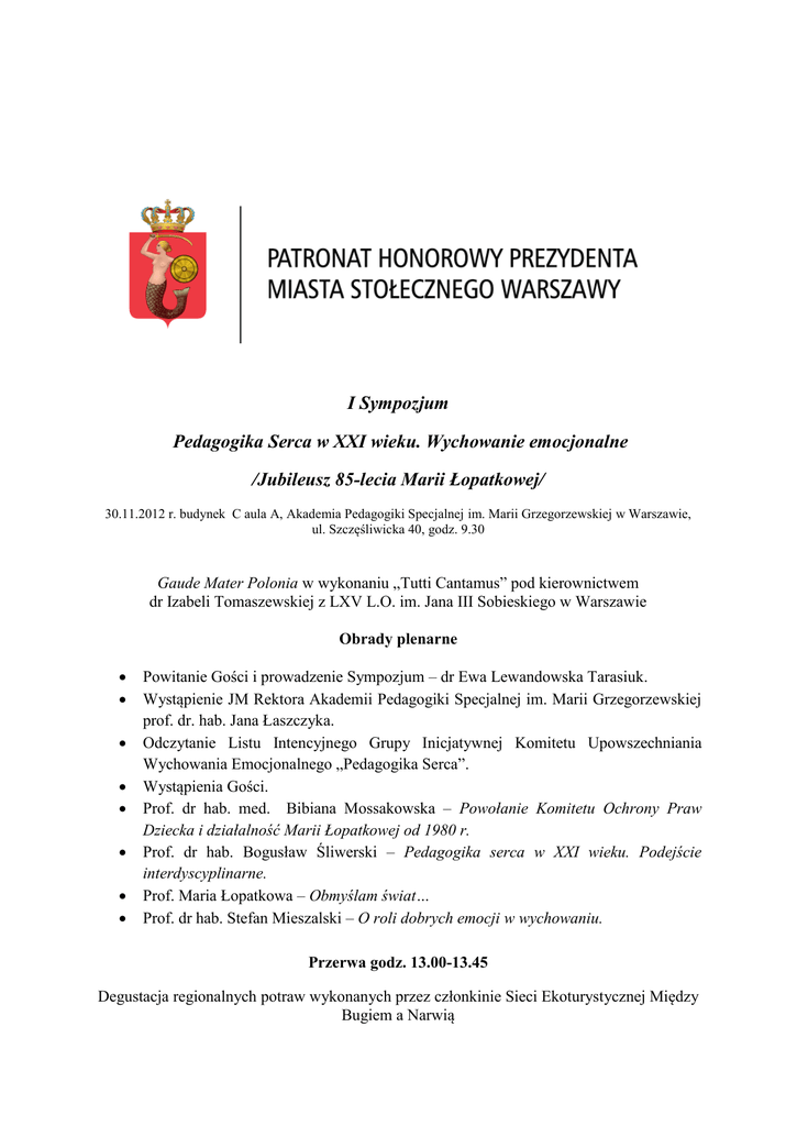 I Sympozjum Pedagogika Serca w XXI wieku. Wychowanie emocjonalne /Jubileusz 85-lecia Marii Łopatkowej/ 30.11.2012 r. budynek C aula A, Akademia Pedagogiki Specjalnej im. Marii Grzegorzewskiej w Warszawie, ul. Szczęśliwicka 40, godz. 9.30 Gaude Mater Polonia w wykonaniu „Tutti Cantamus” pod kierownictwem dr Izabeli Tomaszewskiej z LXV L.O. im. Jana III Sobieskiego w Warszawie Obrady plenarne Powitanie Gości i prowadzenie Sympozjum – dr Ewa Lewandowska Tarasiuk. Wystąpienie JM Rektora Akademii Pedagogiki Specjalnej im. Marii Grzegorzewskiej prof. dr. hab. Jana Łaszczyka. Odczytanie Listu Intencyjnego Grupy Inicjatywnej Komitetu Upowszechniania Wychowania Emocjonalnego „Pedagogika Serca”. Wystąpienia Gości. Prof. dr hab. med. Bibiana Mossakowska – Powołanie Komitetu Ochrony Praw Dziecka i działalność Marii Łopatkowej od 1980 r. Prof. dr hab. Bogusław Śliwerski – Pedagogika serca w XXI wieku. Podejście interdyscyplinarne. Prof. Maria Łopatkowa – Obmyślam świat… Prof. dr hab. Stefan Mieszalski – O roli dobrych emocji w wychowaniu. Przerwa godz. 13.00-13.45 Degustacja regionalnych potraw wykonanych przez członkinie Sieci Ekoturystycznej Między Bugiem a Narwią Panel Jubileuszowy Jedno serce… – etiuda performatywna studentów APS na motywach twórczości Marii Łopatkowej (pod kierunkiem mgr Magdaleny Ostolskiej) Prof. dr hab. Marek Konopczyński – Resocjalizacja. Od przymusu do wspierania rozwoju. Dr Ewa Lewandowska-Tarasiuk – Retoryka miłości. Niedokończone dzieło Andrzeja Szczeklika. Dr nauk med. Arkadiusz Kapliński – Przygotowanie do życia – oczami endokrynologa. Pastor Kościoła Chrześcijan Wiary Ewangelicznej Andrzej Stepanov – O miłosci bez granic. Dr Olga Jauer-Niworowska – Oblicza więzi. Mgr Magdalena Ostolska, mgr Kinga Stanaszek-Bryc i mgr Małgorzata Jakubczak – Pedagogika Serca Marii Łopatkowej nadzieją młodych pokoleń. Dyskusja i podsumowanie. Zakończenie Sympozjum planowane o 16.30. Komitet organizacyjny: Przewodniczący – JM Rektor Akademii Pedagogiki Specjalnej im. Marii Grzegorzewskiej prof. dr. hab. Jan Łaszczyk Prorektor ds. nauki prof. dr hab. Stefan Kwiatkowski Dziekan Wydziału Nauk Pedagogicznych prof. dr hab. Maciej Tanaś Dyrektor Instytutu Pedagogiki prof. dr hab. Franciszek Szlosek Kierownik Zakładu Wychowania Muzycznego i Literackiego prof. dr hab. Szymon Kawalla Kierownik Pracowni Wychowania Literackiego dr Ewa Lewandowska-Tarasiuk Mgr sztuki Małgorzata Szmidt-Kondratiuk, Centrum Pedagogiki Serca Marii Łopatkowej Mgr Małgorzata Jakubczak, doktorantka APS Mgr Magdalena Ostolska, Pracownia Wychowania Literackiego Mgr Kinga Stanaszek-Bryc, Pracownia Wychowania Literackiego Scenografia – mgr Krzysztof Kozina Oprawa muzyczna – mgr sztuki Małgorzata Szmidt-Kondratiuk Oprawa sceniczna – mgr Magdalena Ostolska Prace plastyczne młodzieży z LXV L.O. im. Jana III Sobieskiego w Warszawie, wystawione w foyer przed Aulą (wykonane pod kierunkiem Magdaleny Bibińskiej, koordynacja artystyczna – mgr sztuki Małgorzata Szmidt-Kondratiuk).