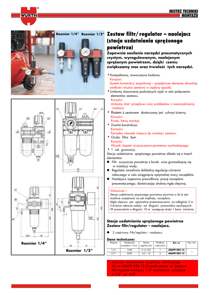 Rozmiar Rozmiar 1/4” Rozmiar 1/2” Rozmiar 1/2” 1/4” Zestaw filtr/regulator – naolejacz (stacja uzdatniania sprężonego powietrza) Zapewnia zasilanie narzędzi pneumatycznych czystym, wyregulowanym, naolejonym sprężonym powietrzem, dzięki czemu zwiększamy moc oraz trwałość tych narzędzi. Kompaktowa, nowoczesna budowa. Korzyści: System konstrukcji zespołowej – pojedyncze elementy dowolnej wielkości można zestawić w żądany sposób. Unikamy stosowania podwójnych nypli w celu połączenia elementów zestawu. Korzyści: Unikamy strat przepływu oraz problemów z nieszczelnością instalacji. Razem z zestawem dostarczany jest uchwyt ścienny. Korzyści: Prosty, łatwy montaż. Zwarta konstrukcja. Korzyści: Potrzeba niewiele miejsca do montażu zestawu. Oczko filtra 5μm. Korzyści Wysoki stopień oczyszczania powietrza wychodzącego. 1 rok gwarancji. Stacja uzdatniania sprężonego powietrza składa się z trzech elementów: ● Filtr oczyszcza powietrze z brudu oraz gromadzącej się w instalacji wody. ● Regulator umożliwia dokładną regulację ciśnienia roboczego w celu osiągnięcia optymalnej mocy narzędzia. ● Naolejacz zapewnia prawidłową pracę narzędzia pneumatycznego, dostarczając drobną mgłę olejową. Wskazówki ! Stacja uzdatniania sprężonego powietrza powinna o ile to jest możliwe znajdować sie jak najbliżej narzędzia. Mgła olejowa jest optymalnie przemieszczana na odległość 5 m. Ciśnienie robocze zależy od długości przewodów zasilających. W przewodzie o długości 10 m występuje strata 1 bara ciśnienia. Stacja uzdatniania sprężonego powietrza Zestaw filtr/regulator – naolejacz. ● 2 częściowy: Filtr/regulator – naolejacz. Dane techniczne: Rozmiar 1/4” Rozmiar 1/2” Wejście Wydajność przepływu 1/min. Zakres regulacji bar Wielkość wykonania Art. nr 1/4" 1220 0 ,5– 8,0 1 A0699 002 14 1/2"* 3200 0,5 – 16 2 A0699 002 12 * - poprzez zastosowanie przyłącza redukującego Art.-nr A0699 838 12 (2 sztuki) można w zestawie filtr/regulator-naolejacz 1/2” zredukować przyłącze z 1/2” na 3/8”. Pak./szt. 1