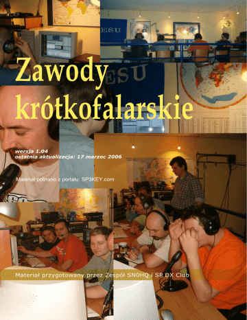 Zawody krótkofalarskie wersja 1.04 ostatnia aktualizacja: 17 marzec 2006 Materiał pobrano z portalu: SP3KEY.com Materiał przygotowany przez Zespół SN0HQ i SP DX Club Spis treści Lista zmian i aktualizacji......................................................... 4 Wstęp .................................................................................. 5 Krótkofalarstwo - krótkie wprowadzenie .................................... 7 Krótkofalarstwo - moje początki ........................................................... 7 Zawody krótkofalarskie. Najczęściej zadawane pytania............... 9 Kategorie uczestnictwa w zawodach ........................................ 13 Single Operator.................................................................................14 Multi Operator ..................................................................................14 SWL ................................................................................................15 Team Contesting ...............................................................................15 Club Competition ..............................................................................15 Łączności w zawodach. Numery kontrolne. Punktacja. Mnożniki ... 16 Łączności w zawodach .......................................................................17 Punktacja i mnożniki za łączności w zawodach.......................................18 Raporty nadawane w zawodach ...........................................................21 Charakterystyka niektórych zawodów oraz sposobów pracy w zawodach ............................................................................ 23 Worked All Europe DX Contest (WAE)...................................................24 European Sprint Contest ....................................................................27 Kalendarze zawodów krótkofalarskich ...................................... 29 Wskazówki dotyczące pracy w zawodach .................................. 31 Single Operator - Two Radio ...............................................................32 Szukanie i wołanie oraz zabawa w DX’a – dwie metody pracy w zawodach 35 Wskazówki dotyczące pracy w zawodach wg. WS1A ...............................36 Praca w zawodach - wskazówki K3ZO...................................................38 Praca w zawodach - wskazówki K8CC ...................................................39 Praca w zawodach - wskazówki K1CC ...................................................40 Co znaczy dB (decybel)? ....................................................................41 Programy komputerowe do pracy w zawodach krótkofalarskich.... 50 SD ..................................................................................................51 CT Log.............................................................................................54 NA Log ............................................................................................56 TR Log.............................................................................................57 WriteLog ..........................................................................................59 Raporty UBN ........................................................................ 62 Wprowadzenie ..................................................................................63 Informacje Komisji CQ WW .................................................................63 Raporty UBN.....................................................................................64 Punkty karne ....................................................................................67 Obliczenia wyniku .............................................................................68 Działania, które mogą podejmować osoby weryfikujące dzienniki (LOGCHECKER)........................................................................................69 Publikacja wyników zawodów w CQ MAGAZINE......................................70 Wnioski ...........................................................................................70 Podziękowania ..................................................................................71 Planowanie okresów snu w dużych zawodach ............................ 72 Praca w zawodach ze stacji o przeciętnym wyposażeniu ............. 78 Praca w zawodach ze stacji o przeciętnym wyposażeniu ..........................79 Komentarz .......................................................................................80 Technika operatorska czy wyposażenie stacji?........................... 84 Zawody na QRP .................................................................... 87 Jak pracować QRP w zawodach............................................................88 Czy w zawodach nadawać „znak/QRP”? ................................................89 Polska Grupa QRP .............................................................................90 DX Cluster ........................................................................... 91 DX Cluster - krótkie wprowadzenie .....................................................92 Czynne korzystanie z DX Cluster’a .......................................................94 Propagacja .......................................................................... 96 Atmosfera ziemska ............................................................................97 Słońce. Plamy słoneczne ....................................................................99 Charakterystyka propagacji na falach krótkich..................................... 100 Prognozy propagacyjne. .................................................................. 102 Współczynniki określajce warunki propagacyjne................................... 102 Strony internetowe z informacjami dotyczącymi propagacji ................... 103 Słownik podstawowych pojęć z dziedziny propagacji.................
