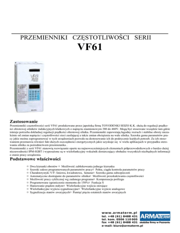 PRZEMIENNIKI CZĘSTOTLIWOŚCI SERII VF61 Zastosowanie Przemienniki częstotliwości serii VF61 produkowane przez japońską firmę TOYODENKI SEIZO K.K. służą do regulacji prędkości obrotowej silników indukcyjnych klatkowych o napięciu znamionowym 380 do 460V. Mogą być stosowane wszędzie tam gdzie istnieje potrzeba dokładnej regulacji prędkości obrotowej silnika. Przemienniki zapewniają łagodny rozruch i stabilne obroty niezależnie od zmian napięcia i częstotliwości sieci zasilającej a także zmian obciążenia na wale silnika. Szeroka gama parametrów pracy jakie można zaprogramować w tych urządzeniach pozwala na dostosowanie ich do praktycznie każdych potrzeb. Za ich stosowaniem przemawia również fakt dużych oszczędności energetycznych jakie uzyskuje się w wielu aplikacjach w przypadku sterowania silnika za pośrednictwem przemiennika . Przemienniki z serii VF61 stanowią rozwiązanie oparte na najnowocześniejszych elementach półprzewodnikowych o bardzo dużej niezawodności IPM-IGBT i wyposażone są w wielofunkcyjny wskaźnik dostarczający obsłudze wszystkich niezbędnych informacji o stanie pracy urządzenia. Podstawowe właściwości ¤ ¤ ¤ ¤ ¤ ¤ ¤ ¤ ¤ Dwa kierunki obrotów ¤ Możliwość zablokowania jednego kierunku Szeroki zakres programowanych parametrów pracy¤ Pełna, ciągła kontrola parametrów pracy Charakterystyki V/F: liniowa, kwadratowa, łamana¤ Szeroka gama zabezpieczeń Automatyczne dostrajanie do parametrów silnika¤ Możliwość przeskakiwania częstotliwości Możliwość pracy cyklicznej wg zadanego programu¤ Kompensacja poślizgu Programowane ograniczenie momentu do 150%¤ Funkcja S Hamowanie prądem stałym ¤ Wielofunkcyjne wejścia sterujące Wielofunkcyjne wyjścia sygnalizacyjne¤ Wielofunkcyjne wyjście analogowe Sygnalizacja stanów awaryjnych ¤ Pamięć pięciu ostatnich stanów awaryjnych www .arma term .pl tel. +48 (61) 8488 431 tel. kom. 0506 110 005 fax +48 (61) 8488 431 siedziba firmy w Poznaniu e-mail: [email protected] Typoszereg mocy Przemienniki serii VF61-XXX44 produkowane są w następującym typoszeregu mocy: Typ przemiennika 2R 3R7 5R5 7R5 11 15 22 30 37 45 55 75 110 160 200 2 Moc silnika kW 2,2 3,7 5,5 7,5 11 15 22 30 37 45 55 75 110 160 200 Moc wyj. kVA 4,2 7 9,9 13 18,3 24,8 35,1 47,6 57,5 70,5 84,6 112 160 229 282 Prąd wyj. A 5,5 9,2 13 17 24 32,5 46 62,5 75,5 92,5 111 146 210 300 370 Napięcie wyj. V 3 fazowe 380V do 460V zgodnie z napięciem wejściowym Napięcie wej. V 3-fazowe 380V do 460V ±10% Częstot. wej. Hz 50Hz do 60Hz z tolerancją ±5% Moc wej. kVA 4,1 7 10,3 14 20,5 28 32 46,1 56,9 69,2 84,6 116 170 247 308 Typ dławika DCL Opcja 2244 304 3744 4544 5544 7544 11044 16044 20044 4 Chłodzenie Chłodzenie wymuszone wewnętrznym wentylatorem Uwaga:Napięcie wyjściowe nie może przekraczać wejściowego napięcia zasilającego. Dostawa przemienników o mocach 22kW do 315kW obejmuje również dławiki DCL. Przy połączeniu równoległym przemienników istnieje możliwość sterowania silnikami o mocy do 1000kW. W zamówieniu należy podać pełne oznaczenie przemiennika np. VF61-2R244; VF61-4544. 250 315 250 351 460 315 457 600 385 485 2504 31544 4 Funkcje sterowania Lp 1 2 3 4 5 6 7 8 9 10 11 12 13 14 15 16 17 18 19 20 21 Parametr Sposób sterowania Zakres częstotliwości wyjściowych Częstotliwość nośna Charakterystyka V/F Opis Modulacja PWM równoważna sinusoidzie, kontrola zależności V/F 0,5÷400Hz 4÷15kHz (programowana) Liniowa, kwadratowa lub łamana. Możliwość zmiany nachylenia charakterystyki od zadanej wartości granicznej. Zakres korygowania napięcia wyjściowego ±30% Korekcja momentu 0÷20% , możliwa praca z automatyczną korekcją momentu Moment początkowy 150% Czasy narastania i zmniejszania 0,1÷3600s, każdorazowo może być wybierane do czterech różnych wartości za poczęstotliwości średnictwem wejścia wielofunkcyjnego Hamowanie prądem stałym Przy zatrzymywaniu poprzez obniżanie częstotliwości możliwe jest hamowanie prądem stałym o programowanym napięciu (0÷20% napięcia znam.) i czasie trwania 0÷5s Start po powrocie nap. zasilającego Zakaz startu lub ponowny automatyczny start po czasie programowanym 0÷5s Przeciążalność 150% znamionowego prądu przemiennika przez czas do 1 minuty Kierunek obrotów silnika Nawrotny. Możliwość wprowadzenia zakazu pracy w jednym z kierunków START/STOP Start od częstotliwości minimalnej lub od aktualnych obrotów silnika. Zatrzymywanie do częstotliwości minimalnej lub swobodnym wybiegiem Hamowanie dynamiczne Dla mocy do 15kW wewnętrzny tranzystor hamujący. Dla większych mocy jako opcja. W obu przypadkach opcjonalne, zewnętrzne rezystory hamujące Przeskakiwanie częstotliwości Mogą być wybrane maksymalnie trzy wartości częstotliwości które będą pomijane Ograniczanie częstotliwości Możliwe jest zaprogramowanie dolnej i górnej dopuszczalnej częstotliwości Częstotliwość manewrowa Zadawana w zakresie 0,5÷30Hz dla obu kierunków obrotu Praca programowa Można zadać do 8 punktów pracy Detekcja momentu Możliwa po wprowadzeniu poprzez monitor parametrów silnika Kompensacja poślizgu Kompensacja poprzez detekcję momentu. Stabilizacja obrotów ±1% (przy zakresie regulacji prędkości 1:10 ) Sprawność przemiennika Większa od 95% w warunkach znamionowych Ograniczenie momentu Praca silnikowa 20÷150%. Praca generatorowa 0÷150% Funkcje wejść i wyjść Lp Parametr 1 Zadawanie częstotliwości 2 3 4 5 6 Opis Z monitora poprzez klawisze góra-dół, lub wpisanie żądanej częstotliwości, zadawanie sekwencji do siedmiu kolejnych częstotliwości. Możliwość zadawania czasów narastania i zmniejszania częstotliwości Poprzez listwę zaciskową: napięcie stałe 0÷10V lub -10÷ +10V lub za pomocą prądu 4÷20 mA (bez separacji), potencjometrem. Poprzez styki góra-dół. Możliwość zadawania czasów narastania i zmniejszania częstotliwości. Możliwość blokowan