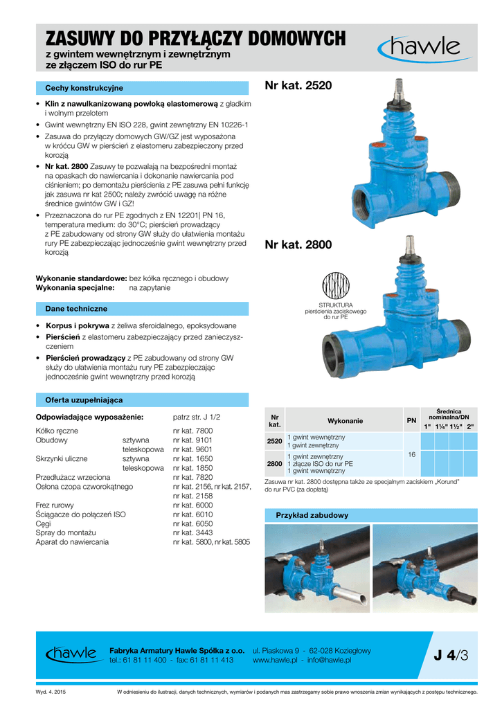 Zasuwy do przyłączy domowych z gwintem wewnętrznym i zewnętrznym ze złączem ISO do rur PE Nr kat. 2520 Cechy konstrukcyjne • Klin z nawulkanizowaną powłoką elastomerową z gładkim i wolnym przelotem • Gwint wewnętrzny EN ISO 228, gwint zewnętrzny EN 10226-1 • Zasuwa do przyłączy domowych GW/GZ jest wyposażona w króćcu GW w pierścień z elastomeru zabezpieczony przed korozją • Nr kat. 2800 Zasuwy te pozwalają na bezpośredni montaż na opaskach do nawiercania i dokonanie nawiercania pod ciśnieniem; po demontażu pierścienia z PE zasuwa pełni funkcję jak zasuwa nr kat 2500; należy zwrócić uwagę na różne średnice gwintów GW i GZ! • Przeznaczona do rur PE zgodnych z EN 12201| PN 16, temperatura medium: do 30°C; pierścień prowadzący z PE zabudowany od strony GW służy do ułatwienia montażu rury PE zabezpieczając jednocześnie gwint wewnętrzny przed korozją Wykonanie standardowe: bez kółka ręcznego i obudowy Wykonania specjalne: na zapytanie Nr kat. 2800 Struktura pierścienia zaciskowego do rur PE Dane techniczne • Korpus i pokrywa z żeliwa sferoidalnego, epoksydowane • Pierścień z elastomeru zabezpieczający przed zanieczysz- czeniem • Pierścień prowadzący z PE zabudowany od strony GW służy do ułatwienia montażu rury PE zabezpieczając jednocześnie gwint wewnętrzny przed korozją Oferta uzupełniająca Średnica nominalna/DN Odpowiadające wyposażenie: patrz str. J 1/2 Kółko ręczne Obudowy sztywna teleskopowa Skrzynki uliczne sztywna teleskopowa Przedłużacz wrzeciona Osłona czopa czworokątnego Frez rurowy Ściągacze do połączeń ISO Cęgi Spray do montażu Aparat do nawiercania nr kat. 7800 1 gwint wewnętrzny nr kat. 9101 2520 1 gwint zewnętrzny nr kat. 9601 16 1 gwint zewnętrzny nr kat. 1650 2800 1 złącze ISO do rur PE nr kat. 1850 1 gwint wewnętrzny nr kat. 7820 Zasuwa nr kat. 2800 dostępna także ze specjalnym zaciskiem „Korund” nr kat. 2156, nr kat. 2157, do rur PVC (za dopłatą) nr kat. 2158 nr kat. 6000 nr kat. 6010 Przykład zabudowy nr kat. 6050 nr kat. 3443 nr kat. 5800, nr kat. 5805 Fabryka Armatury Hawle Spółka z o.o. tel.: 61 81 11 400 - fax: 61 81 11 413 Wyd. 4. 2015 Nr kat. Wykonanie ul. Piaskowa 9 - 62-028 Koziegłowy www.hawle.pl - [email protected] PN 1" 1¼" 1½" 2" J 4/3 W odniesieniu do ilustracji, danych technicznych, wymiarów i podanych mas zastrzegamy sobie prawo wnoszenia zmian wynikających z postępu technicznego. Zasuwy do przyłączy domowych z gwintem wewnętrznym i zewnętrznym ze złączem ISO do rur PE Zasuwa do przyłączy domowych, żeliwo sferoidalne Ø d1 z 1 gwintem wewnętrznym (EN ISO 228) i 1 gwintem zewnętrznym EN 10226-1 Nr kat. 2520 c a Ø d3 Ø d2 H1 H DN Zasuwa Wrzeciono a c Ø d3 L H H1 1" 1¼" 1" 148 164 191 2,40 1¼" 2" 1¼" 167 200 234 3,80 1½" 2" 1½" 167 200 238 1½" 1½" 1½" 167 200 238 4,00 2" 2" 2" 172 219 264 4,60 10,3 Ø d1 Masa kg Ø d2 20 16 4,00 L Zasuwa do przyłączy domowych, żeliwo sferoidalne z 1 gwintem zewnętrznym (EN 10226-1), 1 złącze ISO do rur PE i 1 gwintem wewnętrznym EN ISO 228 Ø d1 Nr kat. 2800 c a Ø d3 Ø d2 H1 H DN Zasuwa Wrzeciono Ø d2 Ø d3 t L H H1 1" 1¼" 1¼" 85 200 164 193 1¼" 2" 1½" 101 245 200 234 1½" 2" 2" 121 255 200 239 2" 2" 2½" 137 264 219 267 a c Ø d1 Masa kg 2,72 10,3 20 16 4,46 4,90 6,81 t L J 4/4 Fabryka Armatury Hawle Spółka z o.o. tel.: 61 81 11 400 - fax: 61 81 11 413 ul. Piaskowa 9 - 62-028 Koziegłowy www.hawle.pl - [email protected] W odniesieniu do ilustracji, danych technicznych, wymiarów i podanych mas zastrzegamy sobie prawo wnoszenia zmian wynikających z postępu technicznego. Wyd. 4. 2015 Zasuwy do przyłączy domowych przegląd Cechy konstrukcyjne Zasuwy z żeliwa sferoidalnego • Klin z nawulkanizowaną powłoką elastomerową z gładkim i wolnym przelotem • Zasuwa kołnierzowa • Zasuwa ze złączem ISO • Zasuwa z przyłączem gwintowanym • Zasuwa do zgrzewania • Zawór kątowy • Zawór do przyłączy domowych z odwodnieniem • 2 uszczelki typu O-ring osadzone w tulei z mosiądzu • Łożysko wrzeciona z mosiądzu • Przyłącze śrubowe do obudów • 100% przydatność do zabudowy w ziemi • Przy nasadkach odcinających, niewykorzystane zwoje gwintu zewnętrznego muszą po montażu zostać zabezpieczone przed korozją zgodnie z obowiązującymi ogólnymi regułami montażu Dane techniczne 4 11 5 7 6 8 2 10 9 3 , 2Korpus (1), pokrywa (2) z żeliwa sferoidalnego EN-GJS-400-18, 1 zgodnie z EN 1563, zabezpieczone zewnątrz i wewnątrz antykorozyjnie (epoksydowane) wg wytycznych GSK (patrz str. 4) 3 Klin z mosiądzu CuZn40Pb2, powłoka na klinie - elastomer 4 Wrzeciono ze stali nierdzewnej 1.4162 z walcowaną i polerowaną dogniataniem powierzchnią uszczelniającą 5 Łożysko wrzeciona (tuleja do uszczelek typu O-ring) z mosiądzu 6 Uszczelka typu O-ring z elastomeru 7 Uszczelka zwrotna z elastomeru 8 Pierścień zabezpieczający ze stali nierdzewnej 9 Uszczelka pokrywy z elastomeru 10 Śruby z łbem walcowym o gnieździe sześciokątnym wpuszczone i dzięki masie zalewowej oraz płaskiej uszczelce pokrywy całkowicie chronione przed korozją 11 Pierścień zabezpieczający przed zanieczyszczeniem z elastomeru Cechy konstrukcyjne Zasuwy z żywicy POM • Klin z nawulkanizowaną powłoką elastomerową z gładkim i wolnym przelotem • Zasuwa ze złączem ISO • Zasuwa Hawle-Fit • Zasuwa z przyłączem gwintowanym • Zasuwa do zgrzewania • Zawór kątowy • 2 uszczelki typu O-ring osadzone w tulei z mosiądzu • Pokrywa połączona z korpusem w procesie zgrzewania rotacyjnego • Zabezpieczenie przed przeciążeniem • Przyłącze śrubowe do obudów • 100% przydatność do zabudowy w ziemi 1 3 8 5 5 7 4 6 2 Dane techniczne 1 Korpus z żywicy POM 2 Klin z mosiądzu CuZN40Pb2 powłoka na klinie - elastomer 3 Wrzeciono ze stali nierdzewnej z walcowaną i polerowaną dogniataniem powierzchnią uszczelniającą 4 Łożysko wrzeciona z mosiądzu 5 U