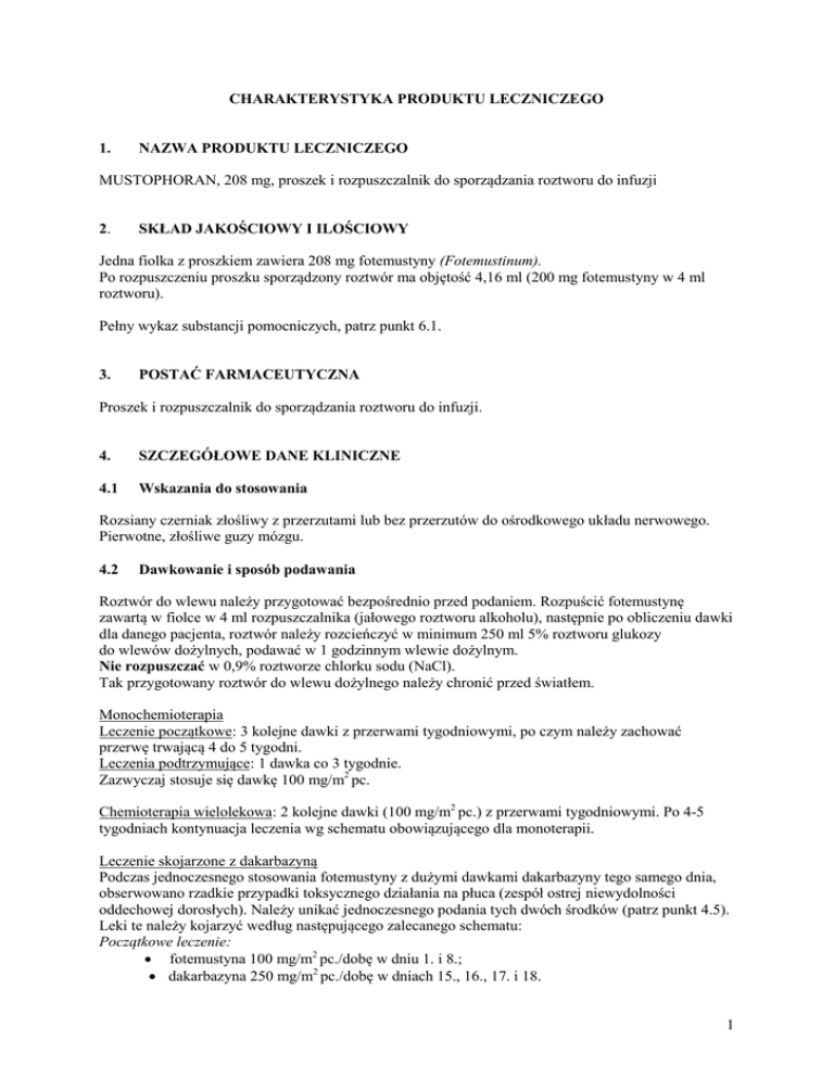 CHARAKTERYSTYKA PRODUKTU LECZNICZEGO 1. NAZWA PRODUKTU LECZNICZEGO MUSTOPHORAN, 208 mg, proszek i rozpuszczalnik do sporządzania roztworu do infuzji 2. SKŁAD JAKOŚCIOWY I ILOŚCIOWY Jedna fiolka z proszkiem zawiera 208 mg fotemustyny (Fotemustinum). Po rozpuszczeniu proszku sporządzony roztwór ma objętość 4,16 ml (200 mg fotemustyny w 4 ml roztworu). Pełny wykaz substancji pomocniczych, patrz punkt 6.1. 3. POSTAĆ FARMACEUTYCZNA Proszek i rozpuszczalnik do sporządzania roztworu do infuzji. 4. SZCZEGÓŁOWE DANE KLINICZNE 4.1 Wskazania do stosowania Rozsiany czerniak złośliwy z przerzutami lub bez przerzutów do ośrodkowego układu nerwowego. Pierwotne, złośliwe guzy mózgu. 4.2 Dawkowanie i sposób podawania Roztwór do wlewu należy przygotować bezpośrednio przed podaniem. Rozpuścić fotemustynę zawartą w fiolce w 4 ml rozpuszczalnika (jałowego roztworu alkoholu), następnie po obliczeniu dawki dla danego pacjenta, roztwór należy rozcieńczyć w minimum 250 ml 5% roztworu glukozy do wlewów dożylnych, podawać w 1 godzinnym wlewie dożylnym. Nie rozpuszczać w 0,9% roztworze chlorku sodu (NaCl). Tak przygotowany roztwór do wlewu dożylnego należy chronić przed światłem. Monochemioterapia Leczenie początkowe: 3 kolejne dawki z przerwami tygodniowymi, po czym należy zachować przerwę trwającą 4 do 5 tygodni. Leczenia podtrzymujące: 1 dawka co 3 tygodnie. Zazwyczaj stosuje się dawkę 100 mg/m2 pc. Chemioterapia wielolekowa: 2 kolejne dawki (100 mg/m2 pc.) z przerwami tygodniowymi. Po 4-5 tygodniach kontynuacja leczenia wg schematu obowiązującego dla monoterapii. Leczenie skojarzone z dakarbazyną Podczas jednoczesnego stosowania fotemustyny z dużymi dawkami dakarbazyny tego samego dnia, obserwowano rzadkie przypadki toksycznego działania na płuca (zespół ostrej niewydolności oddechowej dorosłych). Należy unikać jednoczesnego podania tych dwóch środków (patrz punkt 4.5). Leki te należy kojarzyć według następującego zalecanego schematu: Początkowe leczenie: fotemustyna 100 mg/m2 pc./dobę w dniu 1. i 8.; dakarbazyna 250 mg/m2 pc./dobę w dniach 15., 16., 17. i 18. 1 - okres pięciotygodniowej przerwy, następnie: Leczenie podtrzymujące: co 3 tygodnie: fotemustyna 100 mg/m2 pc./dobę w dniu 1.; dakarbazyna 250 mg/m2 pc./dobę w dniach 2., 3., 4. i 5. 4.3 Przeciwwskazania Ciąża i karmienie piersią. Nadwrażliwość na fotemustynę lub na pochodne nitrozomocznika, lub którykolwiek składnik produktu. Ciężkie zaburzenie czynności szpiku. Stosowanie w skojarzeniu ze szczepionką przeciw żółtej gorączce (patrz punkt 4.5). 4.4 Specjalne ostrzeżenia i środki ostrożności dotyczące stosowania Specjalne ostrzeżenia Należy unikać kontaktu ze skórą i błonami śluzowymi oraz jakiejkolwiek absorpcji roztworu leku. Zaleca się noszenie maski i rękawiczek ochronnych podczas przygotowywania roztworu. W przypadku bezpośredniego kontaktu z roztworem należy daną powierzchnię obficie spłukać bieżącą wodą. Zanieczyszczone materiały powinny być szczelnie zapakowane, a następnie spalone w specjalnie przeznaczonym do tego celu miejscu. Dzieci Nie zaleca się fotemustyny do stosowania u dzieci i młodzieży, ponieważ w tej populacji nie oceniono stosunku korzyści do ryzyka. Pacjenci w podeszłym wieku Toksyczne działanie fotemustyny porównano u pacjentów w wieku poniżej i powyżej 60 lat. U pacjentów w wieku powyżej 60 lat znacząco częściej występowały trombocytopenia (3 stopnia), leukopenia (3 stopnia) oraz toksyczne działanie na układ pokarmowy (patrz punkt 4.8). Stosowania tego produktu leczniczego nie zaleca się w skojarzeniu z żywymi atenuowanymi szczepionkami, fenytoiną lub fosfenytoiną (patrz punkt 4.5). Środki ostrożności dotyczące stosowania Zaleca się nie podawać fotemustyny chorym otrzymującym inne chemioterapeutyki w ciągu poprzedzających 4 tygodni (lub 6 tygodni w przypadku stosowania pochodnych nitrozomocznika). Fotemustynę można stosować jedynie wtedy, gdy liczba płytek krwi wynosi przynajmniej 100 000/mm3 oraz (lub) liczba granulocytów wynosi przynajmniej 2 000/mm3. Przed każdym nowym podaniem należy przeprowadzać badania morfologiczne krwi i w razie konieczności odpowiednio modyfikować dawkę w zależności od uzyskanych wyników hematologicznych. Można posłużyć się następującą tabelą. Liczba płytek krwi/mm3 Liczba granulocytów/mm3 > 100 000 100 000 ≥N>80 000 > 2 000 2 000≥N>1 500 1 500≥N>1 000 ≤1 000 N≤80 000 Procent dawki, jaką należy podać 100% 75% 50% Odroczenie leczenia Należy zachować 8-tygodniowy odstęp pomiędzy rozpoczęciem leczenia początkowego a wprowadzeniem leczenia podtrzymującego. Pomiędzy dwoma cyklami leczenia podtrzymującego należy zachować 3-tygodniowy odstęp czasowy. 2 Leczenie podtrzymujące można rozpatrywać tylko wtedy, kiedy liczba płytek krwi i (lub) granulocytów jest odpowiednia i wynosi minimalnie 100 000 płytek krwi/mm3 oraz 2 000 granulocytów/mm3. Zaleca się kontrolę czynności wątroby w czasie i po rozpoczęciu leczenia początkowego. Ten produkt leczniczy zawiera 80% (v/v) roztwór alkoholu etylowego, tj. 1,3 g alkoholu na 100 mg fotemustyny, co jest równoważne 32 ml piwa lub 13,3 ml wina. Ta ilość może być szkodliwa dla pacjentów z chorobą alkoholową. Zawartość alkoholu lekarz powinien wziąć pod uwagę u pacjentów z grup wysokiego ryzyka, takich jak osoby z chorobą wątroby lub padaczką. Przed rozpoczęciem wlewu z fotemustyną, należy sprawdzić, czy w ciele pacjenta został prawidłowo umieszczony dożylny cewnik, aby uniknąć wynaczynienia. W przypadku wynaczynienia należy przerwać wlew, obficie przemyć żyłę 5% roztworem glukozy (4 ml/min), unieruchomić kończynę i ochłodzić za pomocą torebki z lodem w celu uniknięcia rozprzestrzeniania się roztworu do infuzji. 4.5 Interakcje z innymi produktami leczniczymi i inne rodzaje interakcji Interakcje powszechne dla leków