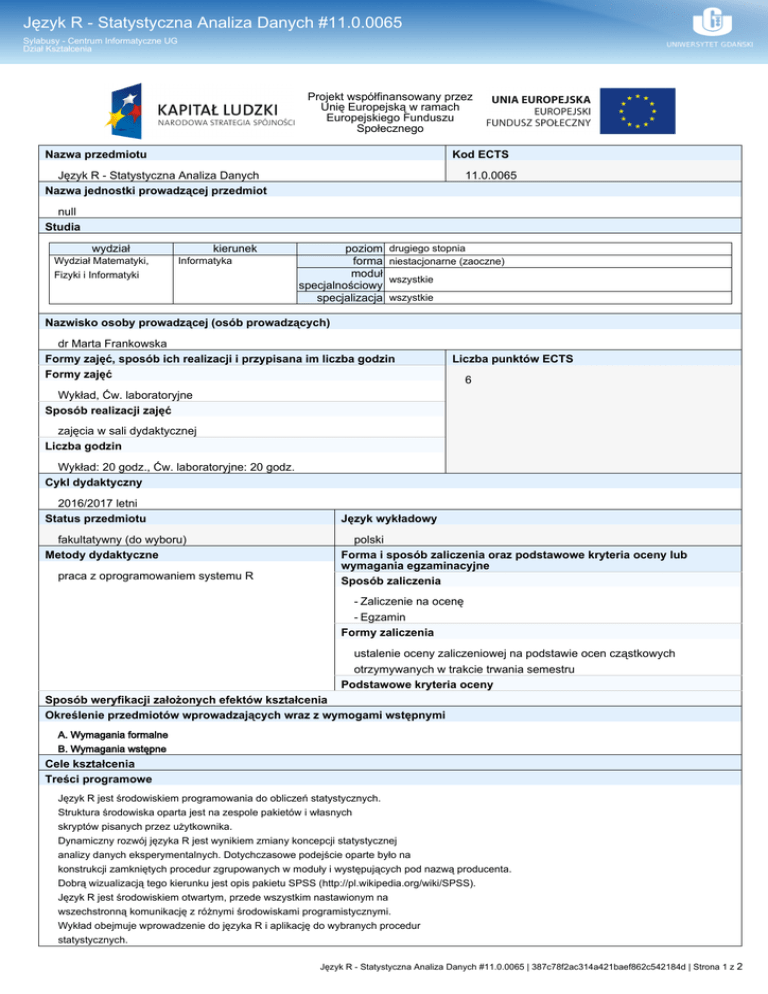 Język R - Statystyczna Analiza Danych #11.0.0065 Sylabusy - Centrum Informatyczne UG Dział Kształcenia Projekt współfinansowany przez Unię Europejską w ramach Europejskiego Funduszu Społecznego Nazwa przedmiotu Kod ECTS Język R - Statystyczna Analiza Danych Nazwa jednostki prowadzącej przedmiot 11.0.0065 null Studia wydział Wydział Matematyki, Fizyki i Informatyki kierunek Informatyka poziom forma moduł specjalnościowy specjalizacja drugiego stopnia niestacjonarne (zaoczne) wszystkie wszystkie Nazwisko osoby prowadzącej (osób prowadzących) dr Marta Frankowska Formy zajęć, sposób ich realizacji i przypisana im liczba godzin Formy zajęć Liczba punktów ECTS 6 Wykład, Ćw. laboratoryjne Sposób realizacji zajęć zajęcia w sali dydaktycznej Liczba godzin Wykład: 20 godz., Ćw. laboratoryjne: 20 godz. Cykl dydaktyczny 2016/2017 letni Status przedmiotu fakultatywny (do wyboru) Metody dydaktyczne praca z oprogramowaniem systemu R Język wykładowy polski Forma i sposób zaliczenia oraz podstawowe kryteria oceny lub wymagania egzaminacyjne Sposób zaliczenia - Zaliczenie na ocenę - Egzamin Formy zaliczenia ustalenie oceny zaliczeniowej na podstawie ocen cząstkowych otrzymywanych w trakcie trwania semestru Podstawowe kryteria oceny Sposób weryfikacji założonych efektów kształcenia Określenie przedmiotów wprowadzających wraz z wymogami wstępnymi A. Wymagania formalne B. Wymagania wstępne Cele kształcenia Treści programowe Język R jest środowiskiem programowania do obliczeń statystycznych. Struktura środowiska oparta jest na zespole pakietów i własnych skryptów pisanych przez użytkownika. Dynamiczny rozwój języka R jest wynikiem zmiany koncepcji statystycznej analizy danych eksperymentalnych. Dotychczasowe podejście oparte było na konstrukcji zamkniętych procedur zgrupowanych w moduły i występujących pod nazwą producenta. Dobrą wizualizacją tego kierunku jest opis pakietu SPSS (http://pl.wikipedia.org/wiki/SPSS). Język R jest środowiskiem otwartym, przede wszystkim nastawionym na wszechstronną komunikację z różnymi środowiskami programistycznymi. Wykład obejmuje wprowadzenie do języka R i aplikację do wybranych procedur statystycznych. Język R - Statystyczna Analiza Danych #11.0.0065 | 387c78f2ac314a421baef862c542184d | Strona 1 z 2 Język R - Statystyczna Analiza Danych #11.0.0065 Sylabusy - Centrum Informatyczne UG Dział Kształcenia Procedury te obejmują analizy klasyczne i współczesne, ale również dotyczą zagadnień ogólniejszych np. Data Mining (Ćwik J. Mielniczuk J., "Statystyczne systemy uczące się. Ćwiczenia w oparciu o pakiet R." , Politechnika Warszawska, 2009) Podstawowym źródłem wiedzy na temat języka R jest strona The Comprehensive R Archive Network: http://cran.r-project.org/ na której można znaleźć odnośniki do dalszych szczegółowych wyjaśnień. Wykaz literatury Ćwik J. Mielniczuk J., "Statystyczne systemy uczące się. Ćwiczenia w oparciu o pakiet R." , Politechnika Warszawska, 2009 The Comprehensive R Archive Network: http://cran.r-project.org/ Efekty kształcenia (obszarowe i kierunkowe) Wiedza Umiejętności Kompetencje społeczne (postawy) Kontakt [email protected] Język R - Statystyczna Analiza Danych #11.0.0065 | 387c78f2ac314a421baef862c542184d | Strona 2 z 2