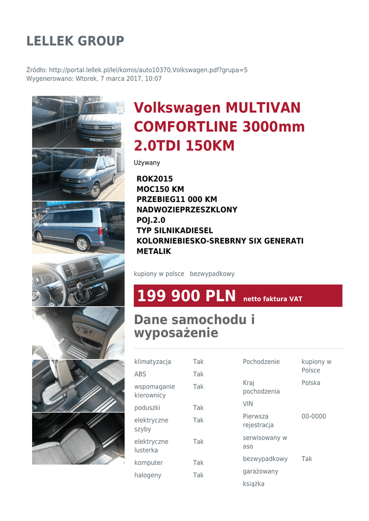 LELLEK GROUP Źródło: http://portal.lellek.pl/lel/komis/auto10370,Volkswagen.pdf?grupa=5 Wygenerowano: Wtorek, 7 marca 2017, 10:07 Volkswagen MULTIVAN COMFORTLINE 3000mm 2.0TDI 150KM Używany ROK2015 MOC150 KM PRZEBIEG11 000 KM NADWOZIEPRZESZKLONY POJ.2.0 TYP SILNIKADIESEL KOLORNIEBIESKO-SREBRNY SIX GENERATI METALIK kupiony w polsce bezwypadkowy 199 900 PLN netto faktura VAT Dane samochodu i wyposażenie klimatyzacja Tak Pochodzenie kupiony w Polsce ABS Tak wspomaganie kierownicy Tak Kraj pochodzenia Polska poduszki Tak elektryczne szyby Tak Pierwsza rejestracja elektryczne lusterka Tak serwisowany w aso komputer Tak halogeny Tak VIN bezwypadkowy garażowany książka 00-0000 Tak serwisowa Handlowiec I właściciel Marcin Sojka zapytaj mobile +48 693 153 245 kupiony w salonie tunning homologacja Gwarancja Gwarancja stan idealny Ubezpieczenie Ubezpieczenie właściciel niepalący dostępna Opis dodatkowy dostępne Volkswagen Multivan Comfortline 3000mm 2.0TDI 150KM Kredyt Kredyt dostępny kolor: niebiesko-srebrny (six generation) tapicerka: alcantara Wersja specjalna Comfortline SIX GENERATION. Zeskanuj kod, aby zobaczyć ofertę online -Dwa pojedyncze fotele obrotowe (II rząd) -Ogrzewanie foteli kierowcy i pasażera - Aktywne zawieszenie ACC -Alcantara -Szyby w kabinie kierowcy sterowane elektrycznie -Okna w przestrzeni pasażerskiej po lewej stronie przesuwne (II rząd) -Okna w przestrzeni pasażerskiej przyciemniane -Drzwi przesuwne po lewej stronie -Drzwi przesuwne po prawej stronie ze wspomaganiem domykania -Drzwi przesuwne po lewej stronie ze wspomaganiem domykania -Kurtyny powietrzne w przestrzeni pasażerskiej -Podgrzewana przednia szyba -Światła przeciwmgielne z przodu zintegrowane ze zderzakiem -System komunikacji wewnętrznej DVE -Front Assist -ParkPilot - czujniki parkowania w przednim i tylnym zderzaku + kamera -Adaptive chassis control -Czujnik zmęczenia kierowcy -Side Assist - asystent zmiany pasa -Asystent świateł drogowych Light Assist -Reflektory LED Czujnik deszczu -Adaptive Cruise Control - dla manualnej skrzyni biegów -Klimatyzacja trzystrefowa Climatronic z elektroniczną regulacją -Kierownica wielofunkcyjna -Bluetooth z obsługą WLAN "Comfort" -Radio/navigation system "Discover Media" -Volkswagen Media Control i MirrorLink -Voice control -2 USB (dodatkowo dla iPod/iPhone) oraz AUX-IN jack -Pakiet elementów chromowanych -Pakiet dla palących -Elektryczna regulacja wysokości dla foteli kierowcy i pasażera Samochód demo dealera Nota prawna Informacja nie stanowi oferty w rozumieniu art. 66 Kodeksu Cywilnego. Podane dane mają charakter wyłącznie informacyjny. Pełna informacja dostępna jest u handlowca. Sprzedający nie odpowiada za ewentualne błędy lub nieaktualność ogłoszenia.