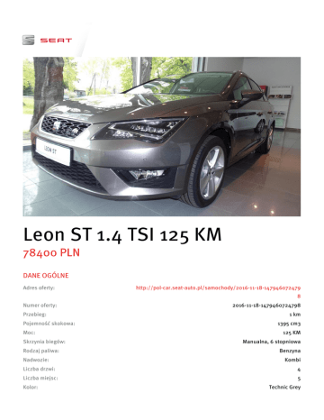 Leon ST 1.4 TSI 125 KM 78400 PLN DANE OGÓLNE Adres oferty: http://pol-car.seat-auto.pl/samochody/2016-11-18-147946072479 8 Numer oferty: Przebieg: Pojemność skokowa: Moc: Skrzynia biegów: Rodzaj paliwa: Nadwozie: 2016-11-18-1479460724798 1 km 1395 cm3 125 KM Manualna, 6 stopniowa Benzyna Kombi Liczba drzwi: 4 Liczba miejsc: 5 Kolor: Technic Grey Rok produkcji: 2016 WYPOSAŻENIE / ABS / Alufelgi / ASR (kontrola trakcji) / Asystent pasa ruchu / Bluetooth / CD / Centralny zamek / Czujnik deszczu / Czujnik zmierzchu / Czujniki parkowania przednie / Czujniki parkowania tylne / Elektrochromatyczne lusterka boczne / Elektryczne szyby przednie / Elektryczne szyby tylne / Elektrycznie ustawiane lusterka / ESP (stabilizacja toru jazdy) / Gniazdo AUX / Gniazdo SD / Gniazdo USB / Immobilizer / Isofix / Kamera cofania / Klimatyzacja automatyczna / Klimatyzacja dwustrefowa / Komputer pokładowy / Kurtyny powietrzne / MP3 / Ogranicznik prędkości / Podgrzewane lusterka boczne / Poduszka powietrzna chroniąca kolana / Poduszka powietrzna kierowcy / Poduszka powietrzna pasażera / Poduszki boczne przednie / Przyciemniane szyby / Radio fabryczne / Relingi dachowe / Światła do jazdy dziennej / Światła LED / Światła przeciwmgielne / System Start-Stop / Tapicerka skórzana / Tapicerka welurowa / Tempomat / Wielofunkcyjna kierownica / Wspomaganie kierownicy OPIS Wyposażenie wersji FR:/ 17 calowe felgi aluminiowe "DYNAMIC" 30/2/ SEAT Drive Profile: 4 profile jazdy umożliwiające zmianę reakcji silnika,wspomagania kierownicy, oświetlenia wewnątrz pojazdu (czerwone w trybie sportowym oraz białe w trybie normalnym i ECO)/ Media System Colour:5-calowy kolorowy ekran dotykowy,Radio,Złącza USB, SD, Aux-in8 głośników Bluetooth®(strumieniowe przesyłanie muzyki i prowadzenie rozmów telefonicznych)/ Przyciemniane szyby/ Sportowe zawieszenie typu FR/ Sportowe przednie fotele wykonane w połączeniu tkaniny i skóry ekologicznej z czerwonymi przeszyciami/ Składane lusterka boczne/ Dedykowane zderzaki z podwójną,chromowaną końcówką układu wydechowego/ Aluminiowe nakładki progowe FR w przednich drzwiach/ Sportowa kierownica wielofunkcyjna z logo FR i dźwignia hamulca ręcznego obszyte skórą z czerwonymi przeszyciami.Wyposażenie ponad wersję FR:Pakiet Techno Plus Kamera cofania, Media System Plus z 6,5-calowym ekranem dotykowym, Pakiet wspomagania jazdy: Asystent świateł drogowych, Asystent pasa ruchu, Pakiet praktyczny: czujnik deszczu, czujnik zmierzchu (automatyczne światła), automatyczna funkcja „Coming and Leaving Home”, automatycznie ściemniające się lusterko wsteczne