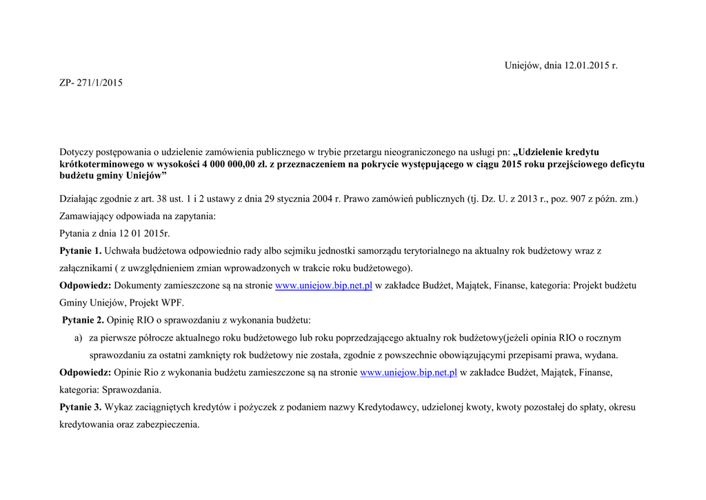 Uniejów, dnia 12.01.2015 r. ZP- 271/1/2015 Dotyczy postępowania o udzielenie zamówienia publicznego w trybie przetargu nieograniczonego na usługi pn: „Udzielenie kredytu krótkoterminowego w wysokości 4 000 000,00 zł. z przeznaczeniem na pokrycie występującego w ciągu 2015 roku przejściowego deficytu budżetu gminy Uniejów” Działając zgodnie z art. 38 ust. 1 i 2 ustawy z dnia 29 stycznia 2004 r. Prawo zamówień publicznych (tj. Dz. U. z 2013 r., poz. 907 z późn. zm.) Zamawiający odpowiada na zapytania: Pytania z dnia 12 01 2015r. Pytanie 1. Uchwała budżetowa odpowiednio rady albo sejmiku jednostki samorządu terytorialnego na aktualny rok budżetowy wraz z załącznikami ( z uwzględnieniem zmian wprowadzonych w trakcie roku budżetowego). Odpowiedz: Dokumenty zamieszczone są na stronie www.uniejow.bip.net.pl w zakładce Budżet, Majątek, Finanse, kategoria: Projekt budżetu Gminy Uniejów, Projekt WPF. Pytanie 2. Opinię RIO o sprawozdaniu z wykonania budżetu: a) za pierwsze półrocze aktualnego roku budżetowego lub roku poprzedzającego aktualny rok budżetowy(jeżeli opinia RIO o rocznym sprawozdaniu za ostatni zamknięty rok budżetowy nie została, zgodnie z powszechnie obowiązującymi przepisami prawa, wydana. Odpowiedz: Opinie Rio z wykonania budżetu zamieszczone są na stronie www.uniejow.bip.net.pl w zakładce Budżet, Majątek, Finanse, kategoria: Sprawozdania. Pytanie 3. Wykaz zaciągniętych kredytów i pożyczek z podaniem nazwy Kredytodawcy, udzielonej kwoty, kwoty pozostałej do spłaty, okresu kredytowania oraz zabezpieczenia. Odpowiedz: Wykaz zaciągniętych kredytów i pożyczek z podaniem nazwy Kredytodawcy, udzielonej kwoty, kwoty pozostałej do spłaty, okresu kredytowania oraz zabezpieczenia Lp. 1 2 Nazwa Kredytodawcy Powszechna Kasa Oszczędności Bank Polski SA Regionalny Oddział Korporacyjny w Łodzi ul. Piotrkowska 173, 90-959 Łódź Powszechna Kasa Oszczędności Bank Polski SA Regionalny Oddział Korporacyjny w Łodzi ul. Piotrkowska 173, 90-959 Łódź Waluta zadłużenia PLN PLN Typ długu i przeznaczenie Kredyt na sfinansowanie deficytu związanego z realizacją zadań inwestycyjnych w ramach dofinansowania ze środków funduszy strukturalnych UE w zakresie: Budowa infrastruktury technicznej na terenie zespołu zamkowo- parkowego w Uniejowie, Rewaloryzacja zespołu zamkowo - parkowego w Uniejowie I etap, Budowa kompleksu sportowo rekreacyjnego w Uniejowie , Przebudowa drogi Trasa Bożego Ciała w Spycimierzu Kredyt na pokrycie planowanego deficytu budżetu w środkach własnych, związanego z realizacją zadań inwestycyjnych dofinansowanych ze środków Unii Europejskiej. Środki pochodzące z kredytu przeznaczone zostaną na współfinansowanie następujących zadań inwestycyjnych: Okres kredytowania Udzielona kwota kredytu Kwota pozostałego zadłużenia Zabezpieczenie 25 05 200631 12 2016 1 080 000,00 216 000,00 Weksel własny in blanco wraz z deklaracją wekslową 31 03 2012 – 31 03 2019 10 000 000,00 2 428 572,00 Weksel własny in blanco wraz z deklaracją wekslową Budowa kompleksu rekreacyjno -sportowego w Uniejowie -etap I, Budowa ciepłociągu na terenie Uniejowa z wykorzystaniem jako źródeł ciepła wód termalnych i biomasy dla celów realizacji przedsięwzięcia "Termy Uniejów" oraz zadań inwestycyjnych realizowanych w ramach Zintegrowanego Projektu pn: Termy Uniejów -regionalny markowy produkt turystyki uzdrowiskowej tj. -Budowa kompleksu edukacyjno -turystyczno-rekreacyjnego Wrota Czasu w Uniejowie etap II, Restauracja Zespołu Zamkowo -Parkowego, Restauracja budynku po byłym kinie z przeznaczeniem na Dom Pracy Twórczej położonego na terenie parku zamkowego w Uniejowie, Rozbudowa kompleksu termalno -basenowego w Uniejowie. 3 Bank Spółdzielczy w Aleksandrowie Łódzkim ul. Ogrodowa 14, 95-070 Aleksandrów Łódzki 4 Bank Spółdzielczy w Aleksandrowie Łódzkim ul. Ogrodowa 14, 95-070 Aleksandrów Łódzki PLN 5 Bank Spółdzielczy w Aleksandrowie Łódzkim ul. Ogrodowa 14, 95-070 Aleksandrów Łódzki PLN PLN Kredyt na pokrycie deficytu w środkach własnych związanego z realizacją zadania inwestycyjnego pn. Budowa kompleksu termalnobasenowego w Uniejowie II etap Kredyt na spłatę wcześniej zaciągniętych zobowiązań oraz planowany deficyt Kredyt na pokrycie planowanego deficytu budżetu związanego z realizacją zadania 13 12 2007 – 31 12 2018 2 620 000,00 1 046 400,00 Weksel własny in blanco wraz z deklaracją wekslową 31 01 2012 – 31 12 2016 3 000 000,00 1 200 000,00 Weksel własny in blanco wraz z deklaracją wekslową 31 01 2013 – 31 12 2018 1 570 000,00 1 046 640,00 Weksel własny in blanco wraz z deklaracją wekslową inwestycyjnego pn.: Budowa przyzagrodowych oczyszczalni ścieków w Gminie Uniejów oraz budowa kanalizacji sanitarnej wraz z przyłączami do działek oraz budowa przepompowni i oczyszczalni ścieków o wydajności 50m3/d wraz z odprowadzeniem ścieków do rowu otwartego. 6 7 Bank Polska Kasa Opieki S.A. Łódzkie Centrum Korporacyjne, Al.. G. Palki 5, 91-402 Łódź Wojewódzki Fundusz Ochrony Środowiska i PLN Kredyt na pokrycie planowanego deficytu budżetu związanego z realizacją zadań inwestycyjnych pn.: Modernizacja drogi dojazdowej do gruntów rolnych w m. Orzeszków Kolonia, Przebudowa ciągów komunikacyjnych na terenie m. Uniejów - ul. Spacerowa i ul. Ogrodowa, Zmiana ukształtowania terenu na obszarze zabytkowego zespołu zamkowo-parkowego i na terenie przyległym - budowa mobilnego systemu ochrony przeciwpowodziowej, Remont świetlicy wiejskiej z wymianą dachu na budynku OSP w Ostrowsku, Rozbudowa budynku OSP w Wieleninie Kolonii. 03 11 2014 – 31 12 2020 3 000 000,00 3 000 000,00 Weksel własny in blanco wraz z deklaracją wekslową PLN Pożyczka na dofinansowanie 31 12 2008 – 30 09 2015 1 610 000,00 169 050,00 Weksel własny in blanco wraz z deklaracją Gospodarki Wodnej w Łodzi 8 9 10 Wojewódzki Fundusz Ochrony Środowiska i Gospodarki W