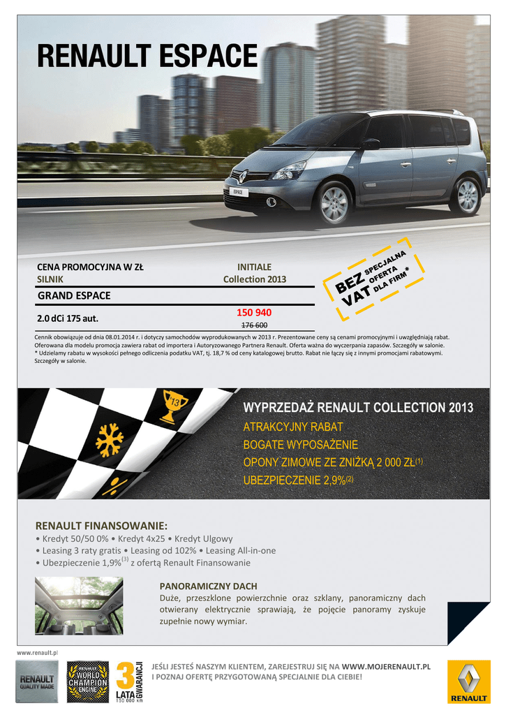 CENA PROMOCYJNA W ZŁ SILNIK INITIALE Collection 2013 GRAND ESPACE 150 940 2.0 dCi 175 aut. 176 600 Cennik obowiązuje od dnia 08.01.2014 r. i dotyczy samochodów wyprodukowanych w 2013 r. Prezentowane ceny są cenami promocyjnymi i uwzględniają rabat. Oferowana dla modelu promocja zawiera rabat od importera i Autoryzowanego Partnera Renault. Oferta ważna do wyczerpania zapasów. Szczegóły w salonie. * Udzielamy rabatu w wysokości pełnego odliczenia podatku VAT, tj. 18,7 % od ceny katalogowej brutto. Rabat nie łączy się z innymi promocjami rabatowymi. Szczegóły w salonie. WYPRZEDAŻ RENAULT COLLECTION 2013 ATRAKCYJNY RABAT BOGATE WYPOSAŻENIE OPONY ZIMOWE ZE ZNIŻKĄ 2 000 ZŁ(1) UBEZPIECZENIE 2,9%(2) RENAULT FINANSOWANIE: • Kredyt 50/50 0% • Kredyt 4x25 • Kredyt Ulgowy • Leasing 3 raty gratis • Leasing od 102% • Leasing All-in-one • Ubezpieczenie 1,9%(3) z ofertą Renault Finansowanie PANORAMICZNY DACH Duże, przeszklone powierzchnie oraz szklany, panoramiczny dach otwierany elektrycznie sprawiają, że pojęcie panoramy zyskuje zupełnie nowy wymiar. JEŚLI JESTEŚ NASZYM KLIENTEM, ZAREJESTRUJ SIĘ NA WWW.MOJERENAULT.PL I POZNAJ OFERTĘ PRZYGOTOWANĄ SPECJALNIE DLA CIEBIE! WYPOSAŻENIE Initiale WYGLĄD ZEWNĘTRZNY Zewnętrzne kl a mki drzwi w kol orze ma towego chromu La ki er meta l i zowa ny La ki er ni emeta l i zowa ny Li s twy ozdobne przedni ch błotni ków w kol orze na dwozi a Obudowy l us terek ws tecznych ora z dol na l i s twa wzdl uż przedni ej s zyby i przedni ch bocznych s zyb w kol orze Cza rna Perła Obręcze kół ze s topu meta l i l ekki ch 17" wzór Monterey Poprzeczki da chowe w kol orze na dwozi a El ektryczni e otwi era ny, pa nora mi czny, s zkl a ny da ch z regul owną przes łoną ● ● 0 ● ● ● ● 7 650 WYGLĄD WEWNĘTRZNY Kl a mka wewnętrzna w kol orze ma towego chromu Obra mowa ni a na wi ewów w des ce rozdzi el czej w kol orze cza rnym błys zczącym Pdś wi etl a ne pokrętła na wi ewów w des ce rozdzi el czej Obra mowa ni a głoś ni ków w drzwi a ch w kol orze ma towego chromu Środkowa kons ol a w kol orze cza rnym błys zczącym z na pi s em Ini ti a l e Pła ty drzwi pokryte s kórą ekol ogi czną w kol orze ci emnogra fi towym z przes zyci a mi w kol orze beżowym Czterora mi enna , s kórza na ki erowni ca z przyci s ka mi regul a tora -ogra ni czni ka prędkoś ci Skórza na ga łka dźwi gni zmi a ny bi egów w kol orze ci emnogra fi towym ze ws ta wką w kol orze ma towego chromu Mi es zek os łony dźwi gni zmi a ny bi egów ze s kóry ekol ogi cznej w kol orze ci emnogra fi towym ● ● ● ● ● ● ● ● ● PROWADZENIE AUTA Sys tem ws poma ga ni a pa rkowa ni a przodem i tyłem z ka merą cofa ni a El ektroni czny kl a ks on Ukła d ki erowni czy ze ws poma ga ni em Automa tyczny ha mul ec pos tojowy, el ektromecha ni czny Komputer pokła dowy Regul a tor - ogra ni czni k prędkoś ci Ka rta Rena ul t Ha nds Free ● ● ● ● ● ● ● WIDOCZNOŚĆ Czujni k des zczu i ś wi a tła Funkcja oś wi etl a ni a drogi do domu Fol l ow me home Podgrzewa na tyna s zyba Otwi era na s zyba w kl a pi e ba ga żni ka Atermi czna przedni a s zyba Przyci emni a ne boczne s zyby Refl ektory przeci wmgłowe Refl ektory ks enonowe ze ś wi a tła mi do ja zdy dzi ennej wykona nymi w technol ogi i LED Sprys ki wa cze refl ektorów Fotochroma tyczne wewnętrzne l us terko ws teczne El ektryczni e regul owa ne, s kła da ne i podgrzewa ne l us terka ws teczne, a s feryczne po s troni e ki erowcy, z wbudowa nym czujni ki em tempera tury zewnetrznej ● ● ● ● ● ● ● ● ● ● ● KOMFORT I ELEMENTY WYSTROJU WNĘTRZA Automa tyczna kl i ma tyza cja z możl i woś ci ą regul a cji z przodu i z tyłu Ki erowni ca z regul a cją us ta wi eni a w pi oni e i pozi omi e ● ● KOMFORT I ELEMENTY WYSTROJU WNĘTRZA C.D Ki erowni ca z regul a cją us ta wi eni a w pi oni e i pozi omi e El ektryczne, i mpul s owe podnoś ni ki s zyb z przeodu i z tyłu, z funkcją za pobi ega ni a przyci ęci u pa l ców Os łona przeci ws łoneczna po s troni e ki erowcy i pa s a żera z l us terki em za myka nym, przes uwa ną kl a pką ora z doda tkowa , wys uwa na ś rodkowa os łona przeci ws łoneczna Wewnętrzny uchwyt opus zcza ni a kl a py ba ga żni ka 3 gni a zda 12V 4 ża l uzje przeci ws łoneczne 6 ża l uzji przeci ws łonecznych Dywa ni k podłogowe w 1. i 2. rzędzi e Dywa ni ki podłogowe w 1., 2. i 3. rzędzi e ● ● ● ● ● ● 1060 ● 290 Initiale SIEDZENIA - TAPICERKA Zdejmowa ne podłoki etni ki tyl nych fotel i z regul a cją na chyl eni a ● Pogrzewa ne fotel e przedni e ● Przedni e fotel e regul owa ne el ektryczni e ● Tyl ne s i edzeni a z wbudowa nymi pa s a mi bezpi eczeńs twa , s kła da ne do położeni a s tol i ka , mocowa ne na prowa dni ca ch, przys tos owa ne do mocowa ni a fotel i ków dzi eci ęcych ISOFIX ● 2 doda tkowe tyl ne fotel e 7 080 Ta pi cerka s kórza na z el ementa mi s kóry ekol ogi cznej w kol orze ci emnogra fi towym Ta pi cerka s kórza na z el ementa mi s kóry ekol ogi cznej w kol orze beżowym ● 900 MULTIMEDIA 4 głoś ni ki + 4 głoś ni ki wys okotonowe + zes pol ony przełączni k s terowa ni a pod ki erowni cą ● ● Ra di ootwa rza cz CD MP3, 3D Sound by Arka mys ®, 4x30 W, RDS, Bl uetooth®, Audi o Connecti on Box Na wi ga cja Ca rmi na t TomTom®Li ve, kol orowy wyś wi etl a cz LCD 16/9 5,8" ● Ma pa Europy - wers ja rozs zerzona Odtwa rza cz DVD-Dvi x, ekra ny 16/9 wbudowa ne w za główki przedni ch fotel i , 2 zes ta wy s łucha wkowe (ods łuch możl i wy tyl ko przy pomocy s łucha wek) ● 8 000 OŚWIETLENIE Oś wi etl eni e centra l nego, dol nego s chowka w des ce rozdzi el czej i s chowka po s troni e pa s a żera ● Oś wi etl eni e wnęk na nogi z przodu ● ● La mpka oś wi etl a jąca wnętrze ba ga żni ka i 3. rzędu s i edzeń na l ewym pa nel u ba ga żni ka 2 l a mpki oś wi etl a jące próg ba ga żni ka Oś wi etl en