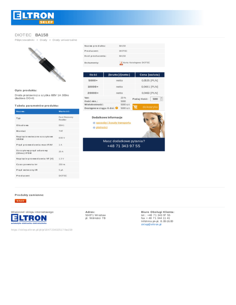 DIOT ECBA158 Pół pr z ewodni ki > Di ody > Di odyuni wer sal ne N a z wa p ro d u ktu : BA158 P ro d u c en t: DI OT EC K o d p ro d u c en ta : BA158 Ka rta Ka ta logowa DI OT EC D o ku m en ty: O pis pro duktu: Di odapr ostowni cz asz ybka600V1A300ns obudowaDO-41 T a bela pa ra m etró wpro duktu: N a z wa : Wa rto ś ć : T yp Fa stRecovery Rectifier O b u d o wa DO4 1 M o n ta ż T HT N a p i ęc i ews tec z n es z c z yto we VR R M 6 00V P rą d p rz ewo d z en i a m a xI F AV 1A S z c z yto wyp rą d u d a ro wy (10 m s )I F S M 20A N a p i ęc i ep rz ewo d z en i a VF [V] 1.3V C z a s p o wro tu trr 250ns P rą d ws tec z n yI R 5µA P ro d u c en t DI OT EC Ilo ś ć [brutto ] /[netto ] Cena [wa luta ] 5000+ netto 0,0535[PLN] 10 0 0 0 + netto 0,048 1[PLN] 20000+ netto 0,0463[PLN] Vat: Ilośćmin.: Wielokrotność: 23% Pod ajIlość: 5000 5000sz t. Dostępnewciąg u 6d ni: 5000sz t. 5000 + - dokosz yka Maszdodatkowepytania? +48713439755 P ro duktyza m ienne: B A15 9 Wł aści ci el skl epui nter netowego: https://skl ep.el tr on.pl /pl /p/18 47 23432517 /ba158 Adres : 50-07 1Wr ocł aw pl .Wol ności 7 B Biuro O bs ługiKlienta : tel .:+48 7 134397 55 fax+48 7 13441141 Infol i ni apn-pt.8 .00-16.00 skl ep@ el tr on.pl