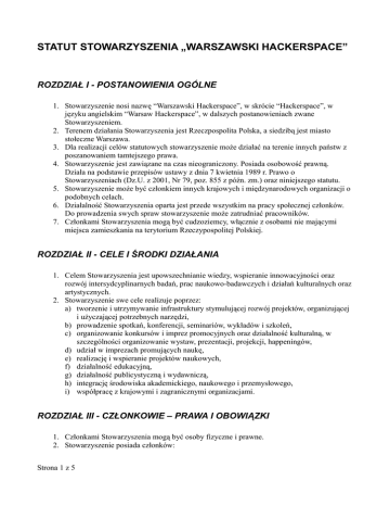 STATUT STOWARZYSZENIA „WARSZAWSKI HACKERSPACE” ROZDZIAŁ I - POSTANOWIENIA OGÓLNE 1. Stowarzyszenie nosi nazwę “Warszawski Hackerspace”, w skrócie “Hackerspace”, w języku angielskim “Warsaw Hackerspace”, w dalszych postanowieniach zwane Stowarzyszeniem. 2. Terenem działania Stowarzyszenia jest Rzeczpospolita Polska, a siedzibą jest miasto stołeczne Warszawa. 3. Dla realizacji celów statutowych stowarzyszenie może działać na terenie innych państw z poszanowaniem tamtejszego prawa. 4. Stowarzyszenie jest zawiązane na czas nieograniczony. Posiada osobowość prawną. Działa na podstawie przepisów ustawy z dnia 7 kwietnia 1989 r. Prawo o Stowarzyszeniach (Dz.U. z 2001, Nr 79, poz. 855 z późn. zm.) oraz niniejszego statutu. 5. Stowarzyszenie może być członkiem innych krajowych i międzynarodowych organizacji o podobnych celach. 6. Działalność Stowarzyszenia oparta jest przede wszystkim na pracy społecznej członków. Do prowadzenia swych spraw stowarzyszenie może zatrudniać pracowników. 7. Członkami Stowarzyszenia mogą być cudzoziemcy, włącznie z osobami nie mającymi miejsca zamieszkania na terytorium Rzeczypospolitej Polskiej. ROZDZIAŁ II - CELE I ŚRODKI DZIAŁANIA 1. Celem Stowarzyszenia jest upowszechnianie wiedzy, wspieranie innowacyjności oraz rozwój intersydcyplinarnych badań, prac naukowo-badawczych i działań kulturalnych oraz artystycznych. 2. Stowarzyszenie swe cele realizuje poprzez: a) tworzenie i utrzymywanie infrastruktury stymulującej rozwój projektów, organizującej i użyczającej potrzebnych narzędzi, b) prowadzenie spotkań, konferencji, seminariów, wykładów i szkoleń, c) organizowanie konkursów i imprez promocyjnych oraz działalność kulturalną, w szczególności organizowanie wystaw, prezentacji, projekcji, happeningów, d) udział w imprezach promujących naukę, e) realizację i wspieranie projektów naukowych, f) działalność edukacyjną, g) działalność publicystyczną i wydawniczą, h) integrację środowiska akademickiego, naukowego i przemysłowego, i) współpracę z krajowymi i zagranicznymi organizacjami. ROZDZIAŁ III - CZŁONKOWIE – PRAWA I OBOWIĄZKI 1. Członkami Stowarzyszenia mogą być osoby fizyczne i prawne. 2. Stowarzyszenie posiada członków: Strona 1 z 5 a) zwyczajnych, b) wspierających. 3. Członkiem Zwyczajnym Stowarzyszenia może być każda osoba fizyczna, która spełni wszystkie poniższe warunki: a) złoży deklarację członkowską na piśmie, b) przedstawi pozytywną opinię co najmniej jednego członka zwyczajnego Stowarzyszenia. 4. Osoba fizyczna staje się członkiem zwyczajnym stowarzyszenia po zaakceptowaniu pisemnej deklaracji przez członka Zarządu Stowarzyszenia. 5. Członkiem Wspierającym Stowarzyszenia może być każda osoba fizyczna lub prawna, po złożeniu i zaakceptowaniu deklaracji członkowskiej przez członka Zarządu. 6. Członek Wspierający Stowarzyszenia będący osobą prawną może zadeklarować pomoc finansową, rzeczową lub merytoryczną w realizacji celów Stowarzyszenia, w formie i wielkości uzgodnionej z Zarządem Stowarzyszenia, potwierdzonej umową. 7. Członkowie Zwyczajni mają prawo: a) korzystania z dorobku, majątku i wszelkich form działalności Stowarzyszenia, b) udziału w zebraniach, wykładach oraz imprezach organizowanych przez Stowarzyszenie, c) zgłaszania wniosków dotyczących działalności Stowarzyszenia, d) biernego i czynnego uczestniczenia w wyborach do władz Stowarzyszenia. 8. Członkowie Zwyczajni mają obowiązek: a) aktywnego udziału w działalności Stowarzyszenia i realizacji jego celów, b) przestrzegania statutu i uchwał władz Stowarzyszenia, c) regularnego opłacania składek. 9. Członkowie Wspierający nie posiadają biernego oraz czynnego prawa wyborczego, mogą jednak dobrowolnie brać udział z głosem doradczym w statutowych władzach Stowarzyszenia, poza tym posiadają takie prawa jak członkowie zwyczajni. 10. Członek Wspierający ma obowiązek wywiązywania się z zadeklarowanych świadczeń, przestrzegania statutu oraz uchwał władz Stowarzyszenia. 11. Utrata członkostwa następuje na skutek: a) pisemnej rezygnacji złożonej na ręce Zarządu, b) wykluczenia przez Zarząd z powodu: I. łamania statutu lub nieprzestrzegania uchwał władz Stowarzyszenia, II. unikania lub notorycznego braku udziału w pracach Stowarzyszenia, III. braku wpłat składek członkowskich za okres trzech miesięcy, IV. łamania zasad współżycia społecznego na szkodę Stowarzyszenia. c) utraty praw publicznych na mocy prawomocnego wyroku sądu, d) śmierci członka oraz utraty osobowości prawnej przez osoby prawne. 12. Od uchwały Zarządu w sprawie pozbawienia członkostwa zainteresowanemu przysługuje odwołanie do Walnego Zgromadzenia Członków. Odwołanie powinno zostać przekazane Zarządowi w formie pisemnej w terminie 14 dni od chwili poinformowania zainteresowanego o treści uchwały Zarządu. Uchwała Walnego Zgromadzenia Członków jest ostateczna i wchodzi w życie w trybie natychmiastowym. ROZDZIAŁ IV - WŁADZE STOWARZYSZENIA 1. Władzami Stowarzyszenia są: a) Walne Zgromadzenie Członków, b) Zarząd, Strona 2 z 5 c) Komisja Rewizyjna. 2. Kadencja wszystkich władz wybieralnych Stowarzyszenia trwa dwa lata, 3. Uchwały wszystkich władz Stowarzyszenia zapadają zwykłą większością głosów przy obecności co najmniej połowy członków uprawnionych do głosowania, stanowiących kworum, chyba że dalsze postanowienia statutu stanowią inaczej. 4. Walne Zgromadzenie Członków jest najwyższą władzą Stowarzyszenia. W Walnym Zgromadzeniu Członków biorą udział: a) z głosem stanowiącym – członkowie zwyczajni, b) z głosem doradczym – członkowie wspierający oraz zaproszeni goście. 5. Walne Zgromadzenie Członków może być zwyczajne i nadzwyczajne. 6. Dla zwołania Walnego Zgromadzenia Członków podaje się dwa terminy. Jeśli w pierwszym terminie nie zbierze się kworum Wal