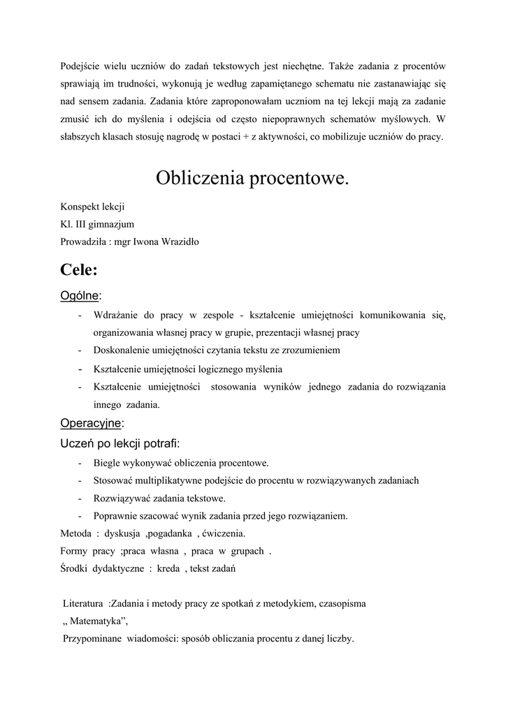Podejście wielu uczniów do zadań tekstowych jest niechętne. Także zadania z procentów sprawiają im trudności, wykonują je według zapamiętanego schematu nie zastanawiając się nad sensem zadania. Zadania które zaproponowałam uczniom na tej lekcji mają za zadanie zmusić ich do myślenia i odejścia od często niepoprawnych schematów myślowych. W słabszych klasach stosuję nagrodę w postaci + z aktywności, co mobilizuje uczniów do pracy. Obliczenia procentowe. Konspekt lekcji Kl. III gimnazjum Prowadziła : mgr Iwona Wrazidło Cele: Ogólne: - Wdrażanie do pracy w zespole - kształcenie umiejętności komunikowania się, organizowania własnej pracy w grupie, prezentacji własnej pracy - Doskonalenie umiejętności czytania tekstu ze zrozumieniem - Kształcenie umiejętności logicznego myślenia - Kształcenie umiejętności stosowania wyników jednego zadania do rozwiązania innego zadania. Operacyjne: Uczeń po lekcji potrafi: - Biegle wykonywać obliczenia procentowe. - Stosować multiplikatywne podejście do procentu w rozwiązywanych zadaniach - Rozwiązywać zadania tekstowe. - Poprawnie szacować wynik zadania przed jego rozwiązaniem. Metoda : dyskusja ,pogadanka , ćwiczenia. Formy pracy ;praca własna , praca w grupach . Środki dydaktyczne : kreda , tekst zadań Literatura :Zadania i metody pracy ze spotkań z metodykiem, czasopisma „ Matematyka”, Przypominane wiadomości: sposób obliczania procentu z danej liczby. Tok lekcji 1. Utrwalenie wiadomości. Uczniowie rozwiązują proste zadania:: a) oblicz: 5% z 58, 128% z 30, 45% z 45; b) Jakim procentem liczby a jest liczba b gdy: a=45, b=9; a=67, b=134; a=45, b=180. c) Z jakiej liczby 5 % to: 24, 46, 79. Zadania uczniowie rozwiązują samodzielnie w zeszycie. Uczeń, który pierwszy rozwiąże wszystkie zadania otrzymuje „+” z aktywności. (Jest to powtórka z poprzedniej lekcji, na której zostało przypomniane pojęcie procentu i sposób wykonywania działań na procentach.) Wyniki kolejnych zadań zostają podane na tablicy 2. Zadania 1) Paweł zarabia o 50 % więcej niż Gaweł. O ile procent mniejszą pensję ma Gaweł? Zadanie jest rozwiązywane wspólnie na tablicy. Uczniowie często bez zastanowienia udzielają błędnej odpowiedzi( też o 50%). To zadanie sprawdza rozumienie pojęcia procentu. x– pensja Gawła, y– pensja Pawła, p – ilość procent, o jaką mniejszą pensję ma Gaweł, y= x+ 50% z x= 1,5 x y – p% z y = x, 1,5 x – 1,5px/100 = x, 0,5 x= 1,5 px/100, 50 x = 1,5 px, 1,5 p = 50 , p= 33,(3) %. Odp.: Pensja Gawła jest mniejsza o 33 %. 2) Cenę towaru najpierw obniżono o 20 %, później podwyższono o 20 %. Czy nowa cena jest równa początkowej. Jest to zadanie to zadanie podobne do zadania 1). Uczniowie wykonują je w grupach. Ta grupa, która pierwsza rozwiąże zadanie dostaje „+” z aktywności. ( W przypadku trudności którejś grupy rozwiązanie zostaje przedstawione na tablicy.) Jeżeli zadanie to nie jest poprzedzone wspólnym rozwiązaniem poprzedniego zadania część uczniów udziela natychmiastowej, błędnej odpowiedzi (równa). 3) Sto lat temu mój pradziadek wpłacił na konto w Chicago 1 $. Konto było oprocentowane 10 % w skali roku. Przez te 100 lat nikt nie wybierał pieniędzy z konta. Ile pieniędzy zostawił pradziadek? Uczniowie próbują najpierw oszacować wynik, są to na ogół niedokładne szacunki. Potem uczniowie samodzielnie próbują rozwiązać zadanie, ale ponieważ dotychczas spotykali się głównie z addytywnym ujęciem procentu mają z tym problem. Po dyskusji i pomocy nauczyciela rozwiązanie przedstawia się następująco: 1 + 0,1 * 1 = (1,1)1 – kapitał po pierwszym roku. (1,1)1+ 0,1* (1,1)1=(1,1)2 – kapitał po drugim roku, (1,1)2 + 0,1*(1,1)2= (1,1)3 – kapitał po trzecim roku, Poprzez indukcję naturalną uczniowie dochodzą do wniosku, że kapitał po stu latach wyniesie: (1,1)100=13780 dolarów i 61 centów. 4) Pewna japońska fabryka produkująca samochody wprowadziła nowy rodzaj aparatu zapłonowego, który pozwala zmniejszyć zużycie paliwa o 40 %. Udoskonalono paliwo, przez co jego zużycie spadło o 35 %, zmieniono kształt nadwozia, przez co zużycie paliwa spadło o 25 %. Czy będziemy jeździć za darmo? Uczniowie dyskutują nad rozwiązaniem, kierowani przez nauczyciela. Pełne rozwiązanie mają napisać na zadanie domowe. ( Więcej zadań z procentów jest w klasie II przy okazji procentu składanego.)