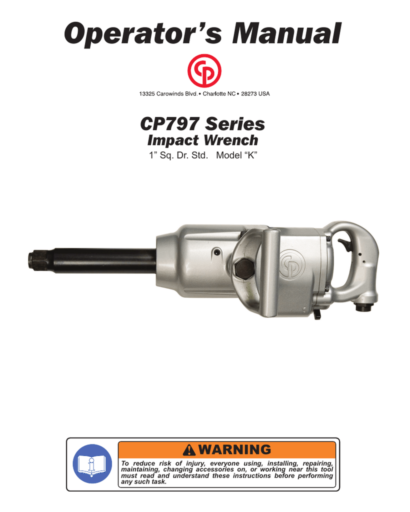 Operator’s Manual CP797 Series Impact Wrench 1” Sq. Dr. Std. Model “K” WARNING To reduce risk of injury, everyone using, installing, repairing, maintaining, changing accessories on, or working near this tool must read and understand these instructions before performing any such task. LOCAL SALES AND SERVICE LOCATIONS EN Please find your local contact at: www.cp.com LV Lūdzu, atrodiet vietējās kontaktpersonas: www.cp.com ES Busque su contacto local en: www.cp.com FR Votre contact local sur : www.cp.com PL Najbliższą placówkę można znaleźć po adresem: www.cp.com IT Per trovare il contatto CP nella vostra zona, visitate: www.cp.com CS Svůj místní kontakt laskavě vyhledejte na adrese: www.cp.com SV Du kan hitta din lokala kontakt på: www.cp.com SK DE Ihren Ansprechpartner finden Sie auch unter: www.cp.com Prosím, vyhľadajte svoj miestny kontakt na adrese: www.cp.com SL PT Por favor, encontre o seu distribuidor local em: www.cp.com Prosimo, najdite svoj lokalni kontakt na: www.cp.com LT Vietinį kontaktą rasite svetainėje: www.cp.com NN Du kan finne din lokale kontakt på: www.cp.com JA NL U kunt uw plaatselijke contact vinden op: www.cp.com 最寄りの連絡先については、当社ウェブサイトを ご覧ください: www.cp.com BG За контакт с местен представител, моля, посетете: www.cp.com DA Find din lokale kontakt på: www.cp.com FI Katso paikallisia yhteystietoja osoitteesta: www.cp.com HR Svojega lokalnog predstavnika pronađite na: www.cp.com RU Информация, необходимая для связи с местным представителем компании, может быть найдена на следующем веб-сайте: www.cp.com RO Puteţi găsi informaţiile reprezentantului autorizat local din regiunea dumneavoastră la: www.cp.com TR Yerel temsilcinizi şu adresden bulabilirsiniz: www.cp.com KO 귀하 지역의 대리점은 다음 사이트에서 찾으실 수 있습니다: www.cp.com ZH 请上网站www.cp.com查询本地联系单位。 EL Παρακαλούμε βρείτε τον τοπικό σας αντιπρόσωπο στη διεύθυνση: www.cp.com HU A helyi elérhetőségek megtalálhatók itt: www.cp.com CA155616 Rev. G Printed in Taiwan KEK 03/09 PL CP797 Seria polski (Polish) Klucz udarowy Instrukcja Obsługi Przyrząd służy do wkręcania i wykręcania łączników gwintowanych do drewna, metalu i plastiku. Nie wolno stosować do innych celów. Tylko dla fachowców. Wymogi dotyczące dopływu powietrza 1. Szlifierka wymaga czystego, suchego powietrza pod ciśnieniem 90 psig (6,3 bar).Wyższe ciśnienie drastycznie ogranicza trwałość narzędzia. 2. Podłącz szlifierkę do źródła powietrza, używając rury i łącznika jak pokazano na ilustracji. 1/2" (12mm) CA048362 (1/2") 1/2" (12mm) 90 0 1/2" (12mm) 1/2" (12mm) 1/2" (12mm) 130 1/2" (12mm) CA048360 (1/2") CA048361 (1/2") Smarowanie 1. Stosuj smarowanie poprzez przewód powietrzny olejem SAE nr 10, wyreguluj do 2 kropli na minutę. Jeżeli smarowanie nie może być przeprowadzone przez przewód powietrzny, wlewaj raz dziennie olej silnikowy. 2. Raz na miesiąc sprawdzić olej w sprzęgle. Stosować olej SAE30 lub równoważny w ilości 175 ml (6 uncji) Działanie 1. Klucz udarowy współpracuje z nasadkami udarowymi przykładanymi do łączników gwintowanych. Uruchamia się językiem spustowym na rękojeści. Kierunek obrotu określają strzałki w prawo lub w lewo na zaworze. 2. Klucz jest wyposażony w regulator mocy. Konserwacja 1. Po pierwszym roku użytkowania należy co trzy miesiące rozbierać i sprawdzać silnik pneumatyczny i sprzęgło udarowe co 3 (trzy), miesiące, jeżeli przyrząd jest używany codziennie. Uszkodzone lub zużyte części należy wymienić. 2. Szybciej zużywające się części są podkreślone w spisie. 3. Aby skrócić przestoje, zaleca się następujące zestawy serwisowe: Zestaw do regulacji CA131501 (Zawartość: 7, 24, 41, 55, 62, 68, 106, 107, 110, 111, 115, 118) Zestaw obudowy sprzęgła CA144478 (Zawartość: 92, 113, 118) Deklaracja zgodności Spółka Chicago Pneumatic Tool Co. LLC mająca siedzibę przy 13325 Carowinds Blvd., Charlotte NC 28273, USA oświadcza, że produkt którego ta deklaracja dotyczy spełnia normy określone w dyrektywie Rady Europejskiej z czerwca 1998 r. w sprawie harmonizacji przepisów w krajach członkowskich (98/37/CE). Nazwa maszyny CP797 Seria Klucz udarowy Typ maszyny Narzędzie pneumatyczne do łączników gwintowanych – nie wolno stosować do innych celów Numer serii Narzędzia z numerem 2009000P i wyższymi. Dane techniczne Standardowy napęd kwadratowy 25 mm (1”) Ciśnienie powietrza 90 psi (6,3 bar) Zużycie powietrza: 283 l/min (10 cfm) Maks. moment obrotowy: 1898 Nm (1400 ft.lbs) Zakres momentu obrotowego: 203-1220 Nm (150-900 ft.lbs) Odpowiada normom zharmonizowanym EN792-6 Odpowiada normom krajowym. ISO 8662-7, EN ISO 15744-2002 Nazwisko i stanowisko wydającego Bruno Blanchet, Dyrektor generalny Podpis wydającego_______________ Data wydania 15 Marzec 2009 r. Określenie hałasu i wibracji* Ciśnienie akustyczne: 110 dB(A) podczas udaru, dokładność 3 dB(A) zgodnie z ISO 15744-2002 Natężenie hałasu + 11dB(A). Wibracja poniżej 7,6 m/s2, ISO 8662-7. Dla określenia przypuszczalnego dziennego narażenia na wibracje stosować należy informacje zawarte w publikacji CEN/TR 15350:2006 - ”Wibracje mechaniczne – wskazówki do określania narażenia na wibracje przenoszone ręcznie z zastosowaniem dostępnych informacji, w tym podawanych przez producentów maszyn” *Podane wartości określono na podstawie testów laboratoryjnych zgodnie z określonymi normami. Wartości te nie są wystarczające do określenia potencjalnego ryzyka. Wartości określone dla poszczególnych stanowisk pracy mogą być wyższe niż wartości podane. Rzeczywiste narażenie i ryzyko indywidualnego użytkownika zależy od sposobu wykon