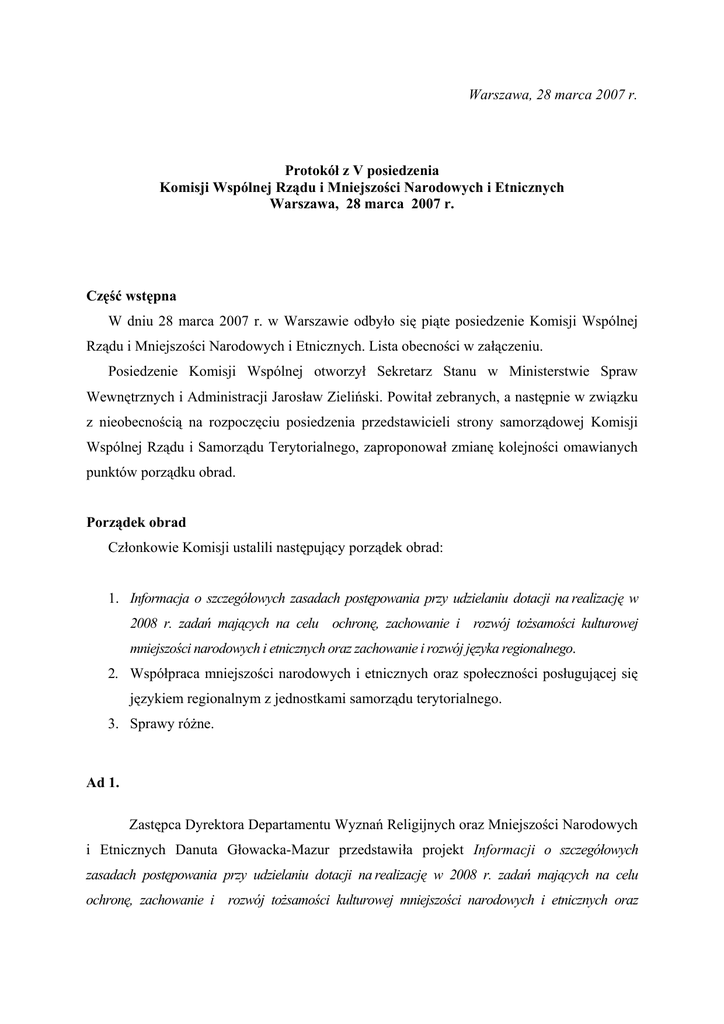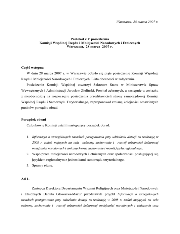 Warszawa, 28 marca 2007 r. Protokół z V posiedzenia Komisji Wspólnej Rządu i Mniejszości Narodowych i Etnicznych Warszawa, 28 marca 2007 r. Część wstępna W dniu 28 marca 2007 r. w Warszawie odbyło się piąte posiedzenie Komisji Wspólnej Rządu i Mniejszości Narodowych i Etnicznych. Lista obecności w załączeniu. Posiedzenie Komisji Wspólnej otworzył Sekretarz Stanu w Ministerstwie Spraw Wewnętrznych i Administracji Jarosław Zieliński. Powitał zebranych, a następnie w związku z nieobecnością na rozpoczęciu posiedzenia przedstawicieli strony samorządowej Komisji Wspólnej Rządu i Samorządu Terytorialnego, zaproponował zmianę kolejności omawianych punktów porządku obrad. Porządek obrad Członkowie Komisji ustalili następujący porządek obrad: 1. Informacja o szczegółowych zasadach postępowania przy udzielaniu dotacji na realizację w 2008 r. zadań mających na celu ochronę, zachowanie i rozwój tożsamości kulturowej mniejszości narodowych i etnicznych oraz zachowanie i rozwój języka regionalnego. 2. Współpraca mniejszości narodowych i etnicznych oraz społeczności posługującej się językiem regionalnym z jednostkami samorządu terytorialnego. 3. Sprawy różne. Ad 1. Zastępca Dyrektora Departamentu Wyznań Religijnych oraz Mniejszości Narodowych i Etnicznych Danuta Głowacka-Mazur przedstawiła projekt Informacji o szczegółowych zasadach postępowania przy udzielaniu dotacji na realizację w 2008 r. zadań mających na celu ochronę, zachowanie i rozwój tożsamości kulturowej mniejszości narodowych i etnicznych oraz zachowanie i rozwój języka regionalnego. Omówiła propozycje zmian w stosunku do Informacji ogłoszonej w 2006 r. Przedstawiciel mniejszości niemieckiej Rafał Bartek zwrócił uwagę na znaczne skrócenie terminu składania wniosków o dotacje do dnia 30 czerwca br. Ponadto, zgłosił wniosek o wprowadzenie systemu punktacji do każdego z kryterium oceny wniosków oraz zgłosił propozycję włączenia do kryteriów - oceny za innowacyjność projektu oraz jego aktualność. R.Bartek zgłosił propozycję uzupełnienia projektu Informacji o zapisy dotyczące składu komisji oceniającej wnioski i trybu jej powoływania. Przedstawiciel mniejszości łemkowskiej Helena Duć-Fajfer przedstawiła opinie organizacji łemkowskich o projekcie Informacji. Organizacje mniejszości łemkowskiej oprotestowały skrócenie terminu składania wniosków, wnioskowały o doprecyzowanie kryteriów przyznawania dotacji inwestycyjnych i podmiotowych, zgłosiły propozycję rozszerzenia dotacji podmiotowych o finansowanie etatów dla instruktorów, bibliotekarzy itp. H.Duć-Fajfer zwróciła również uwagę na zawarty w projekcie Informacji termin podpisywania umów na realizację zadań z początkiem 2008 r. Termin ten, zdaniem organizacji łemkowskich, jest niedookreślony i jak wynika z doświadczeń roku bieżącego dopuszcza rozpoczęcie zawierania umów nawet od marca-kwietnia. Jednocześnie, jak podkreśliła H.Duć-Fajfer, część organizacji uważa wymóg 10 % wkładu własnego, przy zadaniach o wartości powyżej 50 tys. zł, za dyskryminujący. Przedstawiciel mniejszości ukraińskiej Grzegorz Kuprianowicz poddał w wątpliwość konieczność wprowadzania dwóch mechanizmów dyscyplinujących organizacje mniejszości – skrócenia terminu przekazywania wniosków i odrzucania niekompletnych wniosków bez wcześniejszego wezwania do ich uzupełnienia. Poprosił o wyjaśnienie kwestii związanych z dołączaniem odpisu z KRS do każdego wniosku oraz zwrócił się z propozycją doprecyzowania terminu podpisywania umów. Jednocześnie poprosił o wyjaśnienie, jak ma działać organizacja realizująca zadania od 1 stycznia w sytuacji, w której ustawa budżetowa jest podpisana w terminie późniejszym. G.Kuprianowicz zwrócił uwagę na potrzebę przeprowadzenia przez MSWiA szkoleń dotyczących przyznawania i rozliczania dotacji. Przedstawiciel mniejszości litewskiej Bronius Makauskas poparł wniosek G.Kuprianowicza o zaakceptowanie propozycji ministerstwa dotyczącej odrzucania wniosków, w których brak załączników wymienionych w Informacji oraz propozycję wydłużenia terminu składania wniosków. Ponadto, poparł poprzednie głosy dotyczące określenia dokładnej daty zawierania umów. 2 J.Zieliński zaapelował o poszukiwanie wspólnych rozwiązań i porozumienia, a unikanie przejaskrawionych argumentów. Ponadto podkreślił, że skrócenie terminu składania wniosków ma na celu umożliwienie wnioskodawcom uzupełnienia i skorygowania złożonych już wniosków. D. Głowacka-Mazur poinformowała, że prawie wszystkie umowy zostały przesłane do podpisu zleceniobiorcom, zaś do realizacji zostało skierowanych około 30 podpisanych przez obie strony umów. Odnosząc się do zadanych pytań wyjaśniła, że: - w okresie od lipca do października wnioski są uzupełniane, krygowane, trwa wymiana korespondencji pomiędzy urzędem a wnioskodawcami (w roku 2006 zostało złożonych ponad 400 wniosków), - wszystkie kryteria zawarte w projekcie Informacji są brane pod uwagę i mają w równym stopniu wpływ na końcową ocenę wniosku, ale wprowadzenie wag do każdego z kryteriów oceny jest propozycją, która może zostać rozpatrzona, - skład komisji oceniającej wnioski i tryb jej powoływania określa zarządzenie nr 32 Ministra Spraw Wewnętrznych i Administracji z dnia 23 czerwca 2005 r., - termin zawierania umów jest związany z terminem podpisania ustawy budżetowej, w roku bieżącym Minister Spraw Wewnętrznych i Administracji podpisał podział dotacji w dniu 1 marca 2007 r., - jedynie brak wymienionych w Informacji załączników będzie skutkował odrzuceniem wniosku, - w przypadku składania wielu wniosków przez jeden podmiot wystarczy jeden odpis z KRS poświadczony za zgodność z oryginałem, - dotacje podmiotowe są przyznawane przede wszystkim na wsparcie obsługi finansowej organizacji i naj