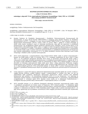 L 106/4 Dziennik Urzędowy Unii Europejskiej PL 22.4.2016 ROZPORZĄDZENIE KOMISJI (UE) 2016/621 z dnia 21 kwietnia 2016 r. zmieniające załącznik VI do rozporządzenia Parlamentu Europejskiego i Rady (WE) nr 1223/2009 dotyczącego produktów kosmetycznych (Tekst mający znaczenie dla EOG) KOMISJA EUROPEJSKA, uwzględniając Traktat o funkcjonowaniu Unii Europejskiej, uwzględniając rozporządzenie Parlamentu Europejskiego i Rady (WE) nr 1223/2009 z dnia 30 listopada 2009 r. dotyczące produktów kosmetycznych (1), w szczególności jego art. 31 ust. 2, a także mając na uwadze, co następuje: (1) Komitet Naukowy ds. Produktów Kosmetycznych i Produktów Nieżywnościowych Przeznaczonych dla Konsumentów, na mocy decyzji Komisji 2004/210/WE (2) zastąpiony przez Komitet Naukowy ds. Produktów Konsumenckich („SCCP”), a następnie, na mocy decyzji Komisji 2008/721/WE (3), przez Komitet Naukowy ds. Bezpieczeństwa Konsumentów („SCCS”), wydał w dniu 25 czerwca 2003 r. opinię (4), w której stwierdził, że tlenek cynku można zasadniczo uznać za substancję nietoksyczną, także gdy jest stosowany w produktach kosmetycznych. Nie uwzględniono jednak możliwości absorpcji przez wdychanie i SCCP wyraził obawy co do bezpieczeństwa mikronizowanego tlenku cynku ze względu na brak wiarygodnej dokumentacji na temat bezpie czeństwa tej substancji. W związku z wnioskami o wyjaśnienie skierowanymi przez Komisję SCCP (5) potwierdził, że stosowanie tlenku cynku w postaci innej niż nanocząsteczkowa w produktach kosmetycznych jest bezpieczne przy stężeniu maksymalnym wynoszącym 25 % i że należy przedłożyć stosowne dane dotyczące oceny ryzyka związanego z tlenkiem cynku w postaci nanocząsteczek. (2) SCCS został poproszony o przeprowadzenie oceny bezpieczeństwa tlenku cynku w postaci nanocząsteczek i komitet ten wydał opinię w dniu 18 września 2012 r. (6), a następnie uzupełnienie do niej w dniu 23 lipca 2013 r. (7). Na podstawie dostępnych dowodów SCCS uznał, że stosowanie nanocząsteczek tlenku cynku o wskazanych cechach jako substancji promieniochronnej w produktach przeciwsłonecznych, w stężeniu do 25 %, nie stwarza ryzyka szkodliwych skutków u ludzi po zastosowaniu na skórę. SCCS wskazał ponadto, że brak jest dowodów na absorpcję nanocząsteczek tlenku cynku przez skórę i drogą pokarmową. Wyliczany margines bezpieczeństwa przy narażeniu na nanocząstki tlenku cynku, zarówno drogą pokarmową, jak i dermalną, mieści się w dopuszczalnych granicach. SCCS potwierdził później, że tlenek cynku w postaci nanocząsteczek można stosować w produktach kosmetycznych innych niż produkty przeciwsłoneczne przeznaczonych do stosowania na skórę. (3) Cechy wskazane w opinii SCCS dotyczą właściwości fizykochemicznych materiału (takich jak czystość, struktura i wygląd fizyczny, liczbowy rozkład wielkości cząstek i rozpuszczalność w wodzie) oraz tego, czy jest on niepowlekany bądź powlekany określonymi substancjami chemicznymi. Można stosować inne składniki kosmetyczne jako powłoki, o ile dowiedziono komitetowi SCCS, że są one bezpieczne i nie wpływają na właściwości cząstek związane z zachowaniem lub skutkami toksykologicznymi, w zestawieniu z nanomateriałami uwzględnionymi w stosownej opinii SCCS. Komisja uważa zatem, że te właściwości fizykochemiczne i wymagania dotyczące powłok należy odzwierciedlić w rozporządzeniu (WE) nr 1223/2009. (4) SCCS stwierdził również, że na podstawie dostępnych informacji stosowania nanocząsteczek tlenku cynku w produktach aerozolowych nie można uznać za bezpieczne. SCCS wskazał ponadto – w dodatkowej opinii z dnia 23 września 2014 r. dotyczącej wyjaśnienia znaczenia pojęcia „zastosowania poprzez rozpylanie/produkty rozpylane” w odniesieniu do sadzy CI 77266, dwutlenku tytanu i tlenku cynku w postaci nanocząsteczek (8) – że jego obawy ograniczają się do produktów aerozolowych, które mogłyby powodować narażenie płuc użytkownika (1) (2) (3) (4) (5) Dz.U. L 342 z 22.12.2009, s. 59. Dz.U. L 66 z 4.3.2004, s. 45. Dz.U. L 241 z 10.9.2008, s. 21. SCCNFP/0649/03, http://ec.europa.eu/health/ph_risk/committees/sccp/documents/out222_en.pdf. SCCP/0932/05, http://ec.europa.eu/health/ph_risk/committees/04_sccp/docs/sccp_o_00m.pdf, SCCP/1147/07, http://ec.europa.eu/ health/ph_risk/committees/04_sccp/docs/sccp_o_123.pdf oraz SCCP/1215/09, http://ec.europa.eu/health/ph_risk/committees/04_ sccp/docs/sccp_o_167.pdf. (6) SCCS/1489/2012, wersja z dnia 11 grudnia 2012 r., http://ec.europa.eu/health/scientific_committees/consumer_safety/docs/sccs_o_ 103.pdf. (7) SCCS/1518/13, wersja z dnia 22 kwietnia 2014 r., http://ec.europa.eu/health/scientific_committees/consumer_safety/docs/sccs_o_137. pdf. (8) SCCS/1539/14, wersja z dnia 25 czerwca 2015 r., http://ec.europa.eu/health/scientific_committees/consumer_safety/docs/sccs_o_163. pdf 22.4.2016 PL Dziennik Urzędowy Unii Europejskiej L 106/5 na kontakt z nanocząsteczkami tlenku cynku poprzez wdychanie. SCCS wskazał również, że jeżeli chodzi o toksyczność dla płuc po wdychaniu, tlenek cynku w postaci innej niż nanocząsteczki ma podobne skutki toksyczne jak tlenek cynku w postaci nanocząsteczek. (5) W świetle wyżej wymienionych opinii SCCS Komisja uważa, że należy dopuścić stosowanie tlenku cynku w postaci innej niż nanocząsteczki w charakterze substancji promieniochronnej w produktach kosmetycznych; stosowanie tlenku cynku w postaci nanocząsteczek (zgodnie ze specyfikacjami SCCS) należy dopuścić w charakterze substancji promieniochronnej w produktach kosmetycznych. Obie postacie przedmiotowej substancji należy dopuścić do użycia, przyjmując stężenie maksymalne wynoszące 25 %, z wyjątkiem zastosowań, które mogą prowadzić do narażenia płuc użytkownika końcowego na kontakt poprzez wdychanie. (6) Komisja uważa, że należy zmienić załącznik VI do rozporządzenia (WE) nr 1223/2