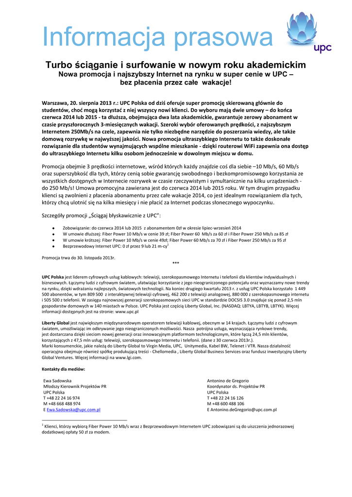 Informacja prasowa Turbo ściąganie i surfowanie w nowym roku akademickim Nowa promocja i najszybszy Internet na rynku w super cenie w UPC – bez płacenia przez całe wakacje! Warszawa, 20. sierpnia 2013 r.: UPC Polska od dziś oferuje super promocję skierowaną głównie do studentów, choć mogą korzystać z niej wszyscy nowi klienci. Do wyboru mają dwie umowy – do końca czerwca 2014 lub 2015 - ta dłuższa, obejmująca dwa lata akademickie, gwarantuje zerowy abonament w czasie przyszłorocznych 3-miesięcznych wakacji. Szeroki wybór oferowanych prędkości, z najszybszym Internetem 250Mb/s na czele, zapewnia nie tylko niezbędne narzędzie do poszerzania wiedzy, ale także domową rozrywkę w najwyższej jakości. Nowa promocja ultraszybkiego Internetu to także doskonałe rozwiązanie dla studentów wynajmujących wspólne mieszkanie - dzięki routerowi WiFi zapewnia ona dostęp do ultraszybkiego Internetu kilku osobom jednocześnie w dowolnym miejscu w domu. Promocja obejmie 3 prędkości internetowe, wśród których każdy znajdzie coś dla siebie –10 Mb/s, 60 Mb/s oraz superszybkość dla tych, którzy cenią sobie gwarancję swobodnego i bezkompromisowego korzystania ze wszystkich dostępnych w Internecie rozrywek w czasie rzeczywistym i symultanicznie na kilku urządzeniach do 250 Mb/s! Umowa promocyjna zawierana jest do czerwca 2014 lub 2015 roku. W tym drugim przypadku klienci są zwolnieni z płacenia abonamentu przez całe wakacje 2014, co jest idealnym rozwiązaniem dla tych, którzy chcą ulotnić się na kilka miesięcy i nie płacić za Internet podczas słonecznego wypoczynku. Szczegóły promocji „Ściągaj błyskawicznie z UPC”: Zobowiązanie: do czerwca 2014 lub 2015 z abonamentem 0zł w okresie lipiec-wrzesień 2014 W umowie dłuższej: Fiber Power 10 Mb/s w cenie 39 zł; Fiber Power 60 Mb/s za 60 zł i Fiber Power 250 Mb/s za 85 zł W umowie krótszej: Fiber Power 10 Mb/s w cenie 49zł; Fiber Power 60 Mb/s za 70 zł i Fiber Power 250 Mb/s za 95 zł Bezprzewodowy Internet UPC: 0 zł przez 9 lub 21 m-cy1 Promocja trwa do 30. listopada 2013r. *** UPC Polska jest liderem cyfrowych usług kablowych: telewizji, szerokopasmowego Internetu i telefonii dla klientów indywidualnych i biznesowych. Łączymy ludzi z cyfrowym światem, ułatwiając korzystanie z jego nieograniczonego potencjału oraz wyznaczamy nowe trendy na rynku, dzięki wdrażaniu najlepszych, światowych technologii. Na koniec drugiego kwartału 2013 r. z usług UPC Polska korzystało 1 449 500 abonentów, w tym 809 500 z interaktywnej telewizji cyfrowej, 462 200 z telewizji analogowej, 880 000 z szerokopasmowego internetu i 505 500 z telefonii. W zasięgu najnowszej generacji szerokopasmowych sieci UPC w standardzie DOCSIS 3.0 znajduje się ponad 2,5 mln gospodarstw domowych w 140 miastach w Polsce. UPC Polska jest częścią Liberty Global, Inc. (NASDAQ: LBTYA, LBTYB, LBTYK). Więcej informacji dostępnych jest na stronie: www.upc.pl Liberty Global jest największym międzynarodowym operatorem telewizji kablowej, obecnym w 14 krajach. Łączymy ludzi z cyfrowym światem, umożliwiając im odkrywanie jego nieograniczonych możliwości. Nasza potrójna usługa, wyznaczająca rynkowe trendy, jest dostarczana dzięki sieciom nowej generacji oraz innowacyjnym platformom technologicznym, które łączą 24,5 mln klientów, korzystających z 47,5 mln usług: telewizji, szerokopasmowego Internetu i telefonii. (dane z 30 czerwca 2013r.). Marki konsumenckie, jakie należą do Liberty Global to Virgin Media, UPC, Unitymedia, Kabel BW, Telenet i VTR. Nasza działalność operacyjna obejmuje również spółkę produkującą treści - Chellomedia , Liberty Global Business Services oraz fundusz inwestycyjny Liberty Global Ventures. Więcej informacji na www.lgi.com. Kontakty dla mediów: Ewa Sadowska Młodszy Kierownik Projektów PR UPC Polska T +48 22 24 16 974 M +48 668 488 974 E [email protected] 1 Antonino de Gregorio Koordynator ds. Projektów PR UPC Polska T +48 22 24 16 126 M +48 600 488 106 E [email protected] Klienci, którzy wybiorą Fiber Power 10 Mb/s wraz z Bezprzewodowym Internetem UPC zobowiązani są do uiszczenia jednorazowej dodatkowej opłaty 50 zł za modem.