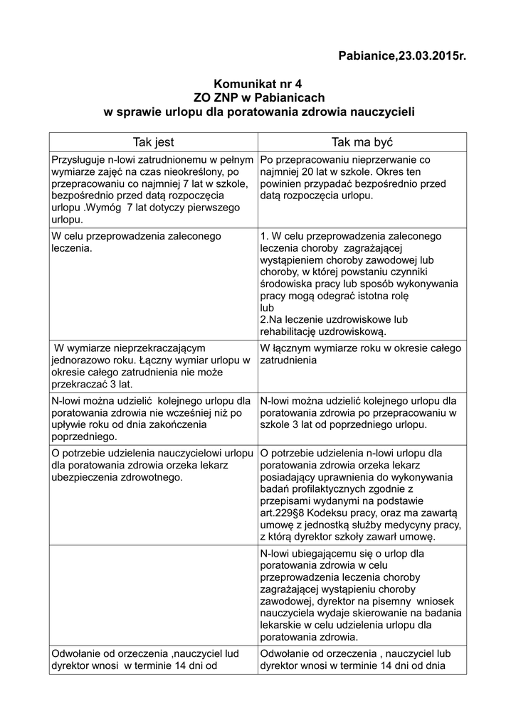 Pabianice,23.03.2015r. Komunikat nr 4 ZO ZNP w Pabianicach w sprawie urlopu dla poratowania zdrowia nauczycieli Tak jest Tak ma być Przysługuje n-lowi zatrudnionemu w pełnym wymiarze zajęć na czas nieokreślony, po przepracowaniu co najmniej 7 lat w szkole, bezpośrednio przed datą rozpoczęcia urlopu .Wymóg 7 lat dotyczy pierwszego urlopu. Po przepracowaniu nieprzerwanie co najmniej 20 lat w szkole. Okres ten powinien przypadać bezpośrednio przed datą rozpoczęcia urlopu. W celu przeprowadzenia zaleconego leczenia. 1. W celu przeprowadzenia zaleconego leczenia choroby zagrażającej wystąpieniem choroby zawodowej lub choroby, w której powstaniu czynniki środowiska pracy lub sposób wykonywania pracy mogą odegrać istotna rolę lub 2.Na leczenie uzdrowiskowe lub rehabilitację uzdrowiskową. W wymiarze nieprzekraczającym W łącznym wymiarze roku w okresie całego jednorazowo roku. Łączny wymiar urlopu w zatrudnienia okresie całego zatrudnienia nie może przekraczać 3 lat. N-lowi można udzielić kolejnego urlopu dla N-lowi można udzielić kolejnego urlopu dla poratowania zdrowia nie wcześniej niż po poratowania zdrowia po przepracowaniu w upływie roku od dnia zakończenia szkole 3 lat od poprzedniego urlopu. poprzedniego. O potrzebie udzielenia nauczycielowi urlopu O potrzebie udzielenia n-lowi urlopu dla dla poratowania zdrowia orzeka lekarz poratowania zdrowia orzeka lekarz ubezpieczenia zdrowotnego. posiadający uprawnienia do wykonywania badań profilaktycznych zgodnie z przepisami wydanymi na podstawie art.229§8 Kodeksu pracy, oraz ma zawartą umowę z jednostką służby medycyny pracy, z którą dyrektor szkoły zawarł umowę. N-lowi ubiegającemu się o urlop dla poratowania zdrowia w celu przeprowadzenia leczenia choroby zagrażającej wystąpieniu choroby zawodowej, dyrektor na pisemny wniosek nauczyciela wydaje skierowanie na badania lekarskie w celu udzielenia urlopu dla poratowania zdrowia. Odwołanie od orzeczenia ,nauczyciel lud dyrektor wnosi w terminie 14 dni od Odwołanie od orzeczenia , nauczyciel lub dyrektor wnosi w terminie 14 dni od dnia otrzymania orzeczenia za pośrednictwem lekarza , który wydał orzeczenie do organu odwoławczego, jakim jest wojewódzki ośrodek medycyny pracy właściwy ze względu na miejsce wydania orzeczenia. otrzymania orzeczenia za pośrednictwem lekarza, który wydał orzeczenie do wojewódzkiego ośrodka medycyny pracy właściwego ze względu na miejsce zamieszkania n-la lub siedzibę szkoły, a jeżeli orzeczenie lekarskie zostało wydane przez lekarza zatrudnionego w WOMP do najbliższego instytutu badawczego w dziedzinie medycyny pracy: 1)Instytutu Medycyny Pracy im. prof.dr med Jerzego Nofera w Łodzi, 2)Instytutu Medycyny Pracy i Zdrowia Środowiskowego w Sosnowcu, 3)Instytutu Medycyny Wsi im. Witolda Chodźki w Lublinie. Uprawniony lekarz przekazuje odwołanie do Uprawniony lekarz przekazuje odwołanie do organu odwoławczego w ciągu 14 dni od organu odwoławczego w ciągu 7 dni od dnia otrzymania odwołania. otrzymania odwołania. Organ odwoławczy wydaje orzeczenie w terminie nie dłuższym niż 14 dni. Właściwy organ odwoławczy w terminie 14 dni od otrzymania odwołania przeprowadza badanie lekarskie. Orzeczenie wydane w wyniku rozpatrzenia odwołania jest ostateczne . Tak samo Nauczyciel nie ponosi kosztów związanych z orzekaniem o stanie jego zdrowia . Opłatę za badania lekarskie związane z orzekaniem o potrzebie udzielenia urlopu dla poratowania zdrowia ponosi szkoła. Urlopu dla poratowania zdrowia na leczenie uzdrowiskowe lub rehabilitację uzdrowiskową udziela dyrektor szkoły na podstawie potwierdzonego skierowania na okres ustalony w tym skierowaniu. Dyrektor odwołuje nauczyciela z urlopu w przypadku podjęcia w czasie urlopu innego stosunku pracy lub innej działalności zarobkowej. Dyrektor odwołuje nauczyciela z urlopu, w przypadku wykonywania przez nauczyciela pracy lub innej działalności zarobkowej lub wykorzystania urlopu dla poratowania zdrowia niezgodnie z celem. Podstawa prawna: ustawa z dnia 26 stycznia 1982 r.-Karta Nauczyciela (tj. Dz. U z 2014r.poz.191 oraz Rozporządzenie MZ z dnia 27 października 2005r. ( Dz. U z 2005r.Nr 233,poz.1991). Opracowała: Jolanta Gałczyńska Na podstawie projektu ustawy o zmianie ustawy-Karta Nauczyciela oraz niektórych innych ustaw z dnia 19 września 2013r.