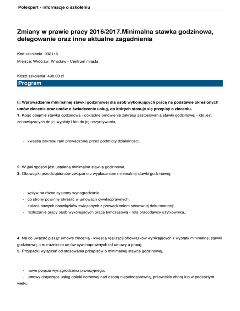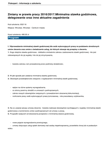 Polexpert - informacje o szkoleniu Zmiany w prawie pracy 2016/2017.Minimalna stawka godzinowa, delegowanie oraz inne aktualne zagadnienia Kod szkolenia: 932116 Miejsce: Wrocław, Wrocław - Centrum miasta Koszt szkolenia: 490.00 zł Program I. Wprowadzenie minimalnej stawki godzinowej dla osób wykonujących pracę na podstawie określonych umów zlecenia oraz umów o świadczenie usług, do których stosuje się przepisy o zleceniu. 1. Kogo obejmie stawka godzinowa - dokładne omówienie zakresu zastosowania stawki godzinowej - kto jest zobowiązanych do jej wypłaty i kto do jej otrzymywania, - kwestia zakresu ram prowadzonej przez podmioty działalności, 2. W jaki sposób jest ustalana minimalna stawka godzinowa, 3. Obowiązki przedsiębiorców związane z wypłacaniem minimalnej stawki godzinowej, - wpływ na różne systemy wynagradzania, - co strony powinny określić w umowach cywilnoprawnych, - zakres nowych obowiązków związanych z prowadzeniem stosownej dokumentacji, - rozliczanie pracy osób wykonujących pracę tymczasową - rola pracodawcy użytkownika, 4. Na co uważać pisząc umowę zlecenia - kwestia realizacji obowiązków wynikających z wypłaty minimalnej stawki godzinowej a rozróżnienie umów cywilnoprawnych od umowy o pracę, 5. Przypadki wyłączeń od stosowania przepisów o minimalnej stawce godzinowej, - nowe pojęcie wynagrodzenia prowizyjnego, - umowy dotyczące usług opieki domowej nad osobą niepełnosprawną, przewlekle chorą lub w podeszłym wieku Polexpert - informacje o szkoleniu 6. Nowe uprawnienia Państwowej Inspekcji Pracy; II. Nowa ustawa z dnia 10 czerwca 2016 r. o delegowaniu pracowników w ramach świadczenia usług 1. Delegowanie a podróż służbowa - pojęcie podróży służbowej, 2. Delegowanie pracowników do państw UE albo na terytorium RP - nowe obowiązki w stosunku do Państwowej Inspekcji Pracy, 3. Na co zwrócić uwagę zawierając na terytorium RP umowy z zagranicznymi podwykonawcami w zakresie szeroko rozumianych prac budowlanych, 4. Możliwość egzekucji na terytorium Polski kar pieniężnych i grzywien administracyjnych nałożonych na polskich pracodawców w innych państwach UE w związku z delegowaniem pracowników w ramach świadczenia usług. III. Terminowe umowy o pracę - zmiany w Kodeksie prac - zasady sporządzania umów 1. Na co zwrócić uwagę zawierając umowę na czas określony z przyczyn obiektywnych poza określone w Kodeksie pracy limity (w tym umowy na zastępstwo) - dodatkowe obowiązkowi związane z zawieraniem umów na czas określony poza określone w Kodeksie pracy limity, - umowy zawierane w celu zastępstwa - szczególny przypadek zastępstwa osoby łączącej wykonywanie pracy z urlopem rodzicielskim, - korzystanie z przesłanki obiektywnych przyczyn po stronie pracodawcy, - nowe wymogi w zakresie treści w umów o pracę na czas określony zawieranych z obiektywnych przyczyn, - obowiązki informacyjne w stosunku do Państwowej Inspekcji Pracy; - odpowiedzialność wykroczeniowa pracodawcy albo osoby działającej w jego imieniu. 2. Doprecyzowanie zasad stosowania umowy na okres próbny - możliwość ponownego zawarcia umowy na okres próbny z tym samym pracownikiem, 3. Wypowiadanie umów o pracę na czas określony, - zastosowanie do umów na czas określony okresów wypowiedzenia stosowanych w przypadku umów na czas nieokreślony, - wypowiadanie umów terminowych w świetle najnowszego orzecznictwa sądów; IV. Nowe rozwiązanie - możliwość zwolnienia z obowiązku świadczenia pracy w okresie wypowiedzenia; Polexpert - informacje o szkoleniu 1. W jaki sposób korzystać z nowej instytucji - ograniczenia nałożone na pracodawców, 2. Jak ustalać wynagrodzenie za okres zwolnienia od pracy; V. Tzw. "pierwsza dniówka" - umowa o pracę zawarta na piśmie przed dopuszczeniem pracownika do pracy. VI. Czas pracy - wybrane zagadnienia dotyczące rozliczania czasu pracy 1. Praca w godzinach nadliczbowych - kiedy mamy z nią do czynienia - rozróżnieni godzin nadliczbowych z przekroczenia normy dobowej a średniotygodniowej; 2. Postanowienia wewnątrz zakładowe w zakresie powierzania pracy nadliczbowej, systemy kontroli obecności a ewidencjonowanie czasu pracy, 3. Różnice w rekompensowaniu pracy nadliczbowej - dodatek do wynagrodzenia czy czas wolnym: z inicjatywy pracodawcy albo na pisemny wniosek pracownika, 4. Możliwość powierzania pracy w dniu wolnym a kwestia rekompensowania takiej pracy, 5. Pracownicy wykonujący pracę w niepełnym wymiarze - możliwość powierzania dodatkowej pracy i zasady jej rozliczania, 6. Dodatkowa praca osób niepełnosprawnych; VII. Projekty 1. Projekt ustawy o zmianie ustawy o promocji zatrudnienia i instytucjach rynku pracy oraz niektórych innych ustaw - zmiana zasad zatrudniania cudzoziemców w ramach obecnego systemu oświadczeniowego, - wprowadzenie zezwolenia na prace sezonowe i krótkoterminowe w miejsce procedury dotyczącej wykonywania pracy krótkoterminowej przez obywateli 6 państw - Republiki Armenii, Republiki Białorusi, Republiki Gruzji, Republiki Mołdawii, Federacji Rosyjskiej lub Ukrainy - na podstawie oświadczenia podmiotu powierzającego pracę o zamiarze powierzenia pracy cudzoziemcowi zarejestrowanego w powiatowym urzędzie pracy (PUP), 2. Projektowane rozwiązania w zakresie zmiany ustawy o zatrudnieniu pracowników tymczasowych : - doprecyzowanie ograniczenia stosowania pracy tymczasowej, ograniczenie czasu skierowania danego pracownika na rzecz pracodawcy użytkownika, - nowe obowiązki po stronie pracodawców użytkowników (m.in. ustalanie maksymalnego okresu zatrudnienia), - nowe sankcje. VIII. Nowe ciekawe orzecznictwo sądów, w tym: - "piętrowe zastępstwo" - pracownik zastępowany jest obecny w pracy, ale pracodawca powierzył mu Polexpert - informacje o szkoleniu wykonywanie innych obowiązków, - kryteria doboru do zwolnienia danego pracownika, - sposób formułowania przyczyny wypowiedzenia przez pracodawcę. Prowad