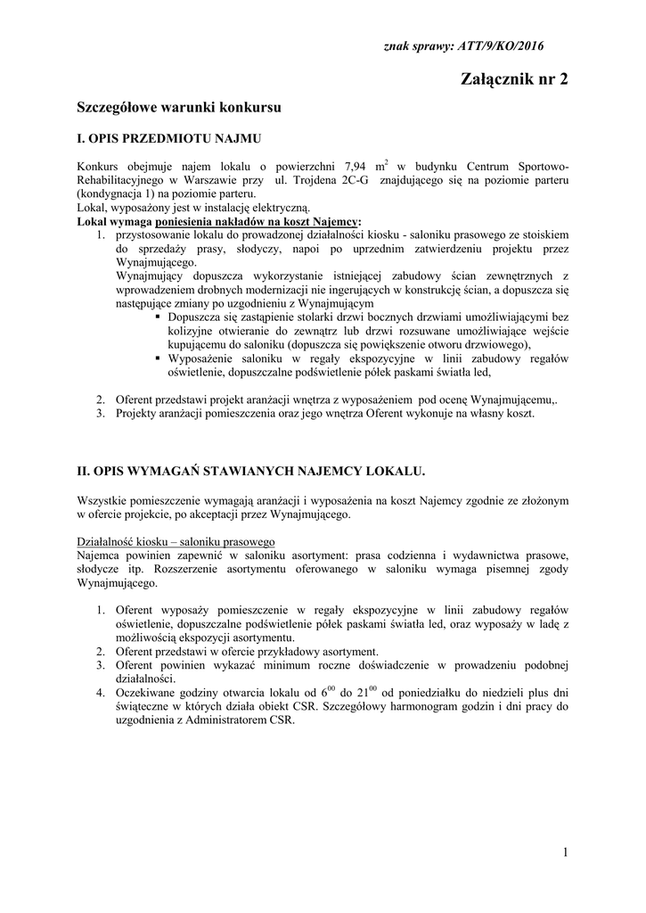znak sprawy: ATT/9/KO/2016 Załącznik nr 2 Szczegółowe warunki konkursu I. OPIS PRZEDMIOTU NAJMU Konkurs obejmuje najem lokalu o powierzchni 7,94 m2 w budynku Centrum SportowoRehabilitacyjnego w Warszawie przy ul. Trojdena 2C-G znajdującego się na poziomie parteru (kondygnacja 1) na poziomie parteru. Lokal, wyposażony jest w instalację elektryczną. Lokal wymaga poniesienia nakładów na koszt Najemcy: 1. przystosowanie lokalu do prowadzonej działalności kiosku - saloniku prasowego ze stoiskiem do sprzedaży prasy, słodyczy, napoi po uprzednim zatwierdzeniu projektu przez Wynajmującego. Wynajmujący dopuszcza wykorzystanie istniejącej zabudowy ścian zewnętrznych z wprowadzeniem drobnych modernizacji nie ingerujących w konstrukcję ścian, a dopuszcza się następujące zmiany po uzgodnieniu z Wynajmującym Dopuszcza się zastąpienie stolarki drzwi bocznych drzwiami umożliwiającymi bez kolizyjne otwieranie do zewnątrz lub drzwi rozsuwane umożliwiające wejście kupującemu do saloniku (dopuszcza się powiększenie otworu drzwiowego), Wyposażenie saloniku w regały ekspozycyjne w linii zabudowy regałów oświetlenie, dopuszczalne podświetlenie półek paskami światła led, 2. Oferent przedstawi projekt aranżacji wnętrza z wyposażeniem pod ocenę Wynajmującemu,. 3. Projekty aranżacji pomieszczenia oraz jego wnętrza Oferent wykonuje na własny koszt. II. OPIS WYMAGAŃ STAWIANYCH NAJEMCY LOKALU. Wszystkie pomieszczenie wymagają aranżacji i wyposażenia na koszt Najemcy zgodnie ze złożonym w ofercie projekcie, po akceptacji przez Wynajmującego. Działalność kiosku – saloniku prasowego Najemca powinien zapewnić w saloniku asortyment: prasa codzienna i wydawnictwa prasowe, słodycze itp. Rozszerzenie asortymentu oferowanego w saloniku wymaga pisemnej zgody Wynajmującego. 1. Oferent wyposaży pomieszczenie w regały ekspozycyjne w linii zabudowy regałów oświetlenie, dopuszczalne podświetlenie półek paskami światła led, oraz wyposaży w ladę z możliwością ekspozycji asortymentu. 2. Oferent przedstawi w ofercie przykładowy asortyment. 3. Oferent powinien wykazać minimum roczne doświadczenie w prowadzeniu podobnej działalności. 4. Oczekiwane godziny otwarcia lokalu od 600 do 2100 od poniedziałku do niedzieli plus dni świąteczne w których działa obiekt CSR. Szczegółowy harmonogram godzin i dni pracy do uzgodnienia z Administratorem CSR. 1 znak sprawy: ATT/9/KO/2016 Załącznik nr 2 OCZEKIWANIA WYNAJMUJĄCEGO WOBEC CHARAKTERU DZIAŁALNOŚCI LOKALU GASTRONOMICZNEGO W CSR. CHARAKTER WNĘTRZA - ZAŁOŻENIA - wnętrze odpowiadające aktualnym trendom sprzedaży prasy, napojów kiosk usytuowany w holu przy wejściu, przylegający do szyby elewacji (lokalizacja pomieszczenia dostępna w administracji budynku) CHARAKTER POMIESZCZENIA aranżacja wnętrza – przejrzysta, nowoczesna ułożenie towaru na estetycznych, ażurowych systemach wystawienniczych widocznych również z zewnątrz - uwzględnienie w wystroju loga Warszawskiego Uniwersytetu Medycznego i Centrum Sportowo-Rehabilitacyjnego - dostępność towaru: z lady - asortyment: • prasa, również sportowa • napoje, również izotoniczne • słodycze: batony • bilety do komunikacji miejskiej • towary higieniczne ELEMENTY DEKORACYJNE - elementy graficzne nawiązujące do charakteru elewacji budynków i specyfiki obiektu możliwość wykorzystania pomysłów aranżacyjnych zastosowanych zarówno w elewacji, jak i we wnętrzach (zieleń na ścianie itp.) - uwzględnienie w wystroju/na szybach loga Medycznego i Centrum Sportowo-Rehabilitacyjnego Warszawskiego Uniwersytetu III. OGRANICZENIA DOTYCZĄCE PROWADZENIA DZIAŁALNOŚCI: a. wykluczona sprzedaż gum do żucia, b. wykluczone instalowanie automatów do gier i do gier o niskich wygranych, c. wykluczone prowadzenie działalności handlowej, w tym promocyjnej i informacyjnej, produktami powodującymi lub mogącymi powodować działanie podobne do substancji psychotropowych lub odurzających, w szczególności tzw. dopalaczami, nawet jeżeli produkty te nie są przeznaczone do spożycia – Stanowiskiem nr 170/10 Zarządu Dzielnicy Śródmieście m.st. Warszawy z dnia 14.07.2010 r., d. wykluczona sprzedaż alkoholu i wyrobów tytoniowych, e. wykluczona sprzedaż napojów gorących, 2 znak sprawy: ATT/9/KO/2016 Załącznik nr 2 f. wykluczone prowadzenie usług xero i innych wychodzących poza działalność związaną z kioskiem – salonikiem prasowym. IV. ZAWARTOŚĆ OFERTY 1. załącznik nr 1 oferty stanowią dokumenty ujęte w §5 regulaminu konkursu ofert (regulamin konkursu podany jako załącznik nr 3 ogłoszenia o konkursie). 2. załącznik nr 2 oferty stanowi wypełniony formularz oferty (podany jako załącznik nr 4 ogłoszenia o konkursie), 3. załącznik nr 3 oferty stanowi projekt aranżacji i wystroju lokalu zaproponowany przez Oferenta, 4. załącznik nr 4 oferty stanowi opis funkcjonowania lokalu (ilość i funkcje zatrudnionego personelu) przedstawiony przez Oferenta, 5. załącznik nr 5 oferty stanowi propozycja Oferenta w zakresie asortymentu. V. ZASADY WYŁONIENIA ZWYCIĘZCY 1. Podstawę oceny będą stanowiły: - wysokość oferowanego czynszu – 60% - aranżacja lokalu wraz z wyposażeniem wnętrza – 20%. - Dotychczasowe doświadczenia w wymaganej działalności, referencje – 20% 2. Konkurs ofert składa się z dwóch części: jawnej i niejawnej. 3. Część niejawna konkursu zawiera prace komisji konkursowej. 4. Zapis Regulaminu Konkursu Ofert na Wynajem Powierzchni Użytkowych dotyczący ceny wywoławczej w przedmiotowym konkursie nie ma zastosowania. 5. Zapis Regulaminu dotyczący licytacji stawki w przedmiotowym konkursie nie ma zastosowania. 6. Zapis §6 Regulaminu w przedmiotowym konkursie nie ma zastosowania. 7. Oferent jest związany ofertą w ciągu 100 dni od dnia otwarcia ofert. 7.1. Oferent samodzielnie lub na wniosek Wynajmującego może przedłużyć termin związania ofertą, z tym, że Wynaj