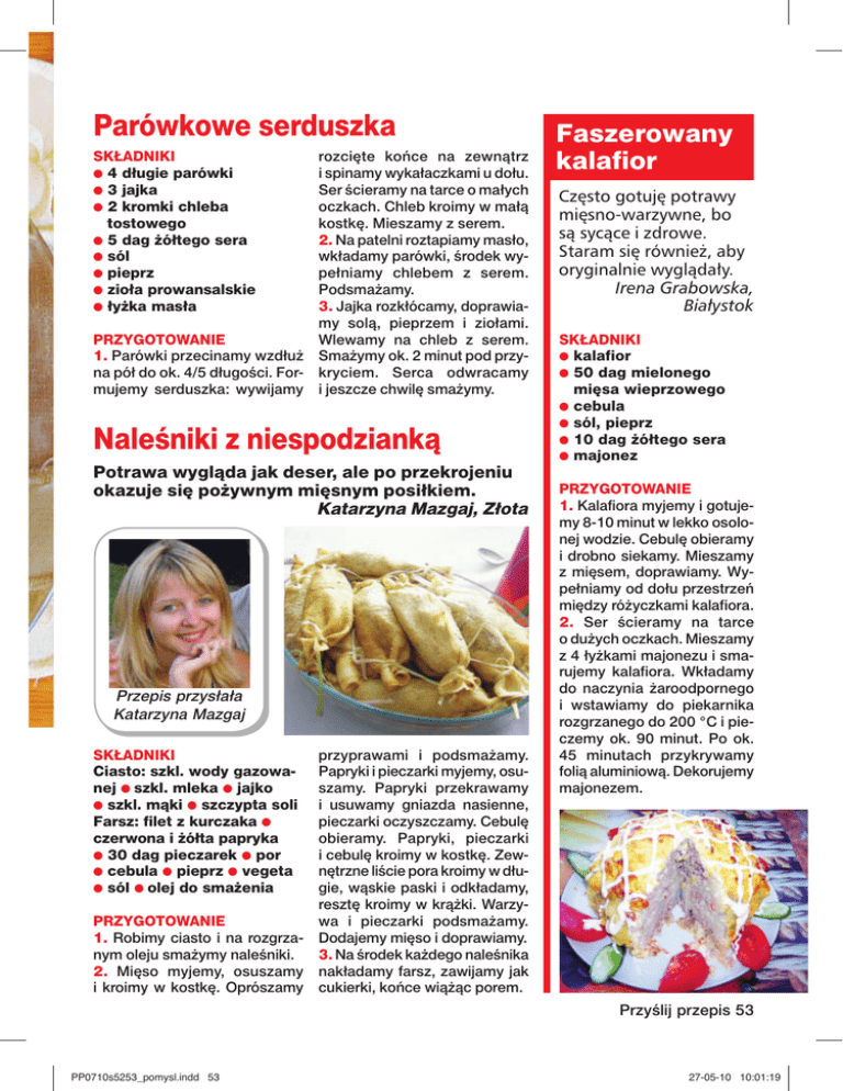 Parówkowe serduszka SKŁADNIKI ● 4 długie parówki ● 3 jajka ● 2 kromki chleba tostowego ● 5 dag żółtego sera ● sól ● pieprz ● zioła prowansalskie ● łyżka masła PRZYGOTOWANIE 1. Parówki przecinamy wzdłuż na pół do ok. 4/5 długości. Formujemy serduszka: wywijamy rozcięte końce na zewnątrz i spinamy wykałaczkami u dołu. Ser ścieramy na tarce o małych oczkach. Chleb kroimy w małą kostkę. Mieszamy z serem. 2. Na patelni roztapiamy masło, wkładamy parówki, środek wypełniamy chlebem z serem. Podsmażamy. 3. Jajka rozkłócamy, doprawiamy solą, pieprzem i ziołami. Wlewamy na chleb z serem. Smażymy ok. 2 minut pod przykryciem. Serca odwracamy i jeszcze chwilę smażymy. Naleśniki z niespodzianką Potrawa wygląda jak deser, ale po przekrojeniu okazuje się pożywnym mięsnym posiłkiem. Katarzyna Mazgaj, Złota Przepis przysłała Katarzyna Mazgaj SKŁADNIKI Ciasto: szkl. wody gazowanej ● szkl. mleka ● jajko ● szkl. mąki ● szczypta soli Farsz: filet z kurczaka ● czerwona i żółta papryka ● 30 dag pieczarek ● por ● cebula ● pieprz ● vegeta ● sól ● olej do smażenia PRZYGOTOWANIE 1. Robimy ciasto i na rozgrzanym oleju smażymy naleśniki. 2. Mięso myjemy, osuszamy i kroimy w kostkę. Oprószamy przyprawami i podsmażamy. Papryki i pieczarki myjemy, osuszamy. Papryki przekrawamy i usuwamy gniazda nasienne, pieczarki oczyszczamy. Cebulę obieramy. Papryki, pieczarki i cebulę kroimy w kostkę. Zewnętrzne liście pora kroimy w długie, wąskie paski i odkładamy, resztę kroimy w krążki. Warzywa i pieczarki podsmażamy. Dodajemy mięso i doprawiamy. 3. Na środek każdego naleśnika nakładamy farsz, zawijamy jak cukierki, końce wiążąc porem. Faszerowany kalafior Często gotuję potrawy mięsno-warzywne, bo są sycące i zdrowe. Staram się również, aby oryginalnie wyglądały. Irena Grabowska, Białystok SKŁADNIKI ● kalafior ● 50 dag mielonego mięsa wieprzowego ● cebula ● sól, pieprz ● 10 dag żółtego sera ● majonez PRZYGOTOWANIE 1. Kalafiora myjemy i gotujemy 8-10 minut w lekko osolonej wodzie. Cebulę obieramy i drobno siekamy. Mieszamy z mięsem, doprawiamy. Wypełniamy od dołu przestrzeń między różyczkami kalafiora. 2. Ser ścieramy na tarce o dużych oczkach. Mieszamy z 4 łyżkami majonezu i smarujemy kalafiora. Wkładamy do naczynia żaroodpornego i wstawiamy do piekarnika rozgrzanego do 200 °C i pieczemy ok. 90 minut. Po ok. 45 minutach przykrywamy folią aluminiową. Dekorujemy majonezem. Przyślij przepis 53 PP0710s5253_pomysl.indd 53 27-05-10 10:01:19