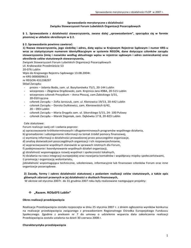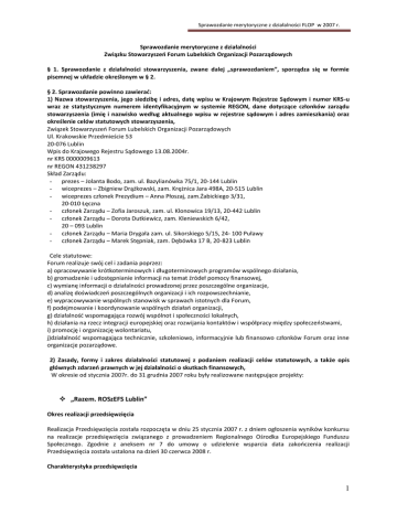 Sprawozdanie merytoryczne z działalności FLOP w 2007 r. Sprawozdanie merytoryczne z działalności Związku Stowarzyszeń Forum Lubelskich Organizacji Pozarządowych § 1. Sprawozdanie z działalności stowarzyszenia, zwane dalej „sprawozdaniem”, sporządza się w formie pisemnej w układzie określonym w § 2. § 2. Sprawozdanie powinno zawierać: 1) Nazwa stowarzyszenia, jego siedzibę i adres, datę wpisu w Krajowym Rejestrze Sądowym i numer KRS-u wraz ze statystycznym numerem identyfikacyjnym w systemie REGON, dane dotyczące członków zarządu stowarzyszenia (imię i nazwisko według aktualnego wpisu w rejestrze sądowym i adres zamieszkania) oraz określenie celów statutowych stowarzyszenia, Związek Stowarzyszeń Forum Lubelskich Organizacji Pozarządowych Ul. Krakowskie Przedmieście 53 20-076 Lublin Wpis do Krajowego Rejestru Sądowego 13.08.2004r. nr KRS 0000009613 nr REGON 431238297 Skład Zarządu: - prezes – Jolanta Bodo, zam. ul. Bazylianówka 75/1, 20-144 Lublin - wiceprezes – Zbigniew Drążkowski, zam. Krężnica Jara 498A, 20-515 Lublin - wiceprezes członek Prezydium – Anna Płoszaj, zam.Żabickiego 3/31, 20-010 Łęczna - członek Zarządu – Zofia Jaroszuk, zam. ul. Klonowica 19/13, 20-442 Lublin - członek Zarządu – Dorota Dutkiewicz, zam. Kleniewskich 6/42, 20 – 093 Lublin - członek Zarządu – Maria Drygała zam. ul. Sikorskiego 5/15, 24- 100 Puławy - członek Zarządu – Marek Stępniak, zam. Dębówka 17 B, 20-823 Lublin Cele statutowe: Forum realizuje swój cel i zadania poprzez: a) opracowywanie krótkoterminowych i długoterminowych programów wspólnego działania, b) gromadzenie i udostępnianie informacji na temat źródeł pomocy finansowej, c) wymianę informacji o działalności prowadzonej przez poszczególne organizacje, d) analizę doświadczeń poszczególnych organizacji i ich rozpowszechnianie, e) wypracowywanie wspólnych stanowisk w sprawach istotnych dla Forum, f) podejmowanie i koordynowanie wspólnych działań organizacji, g) działalność wspomagająca rozwój wspólnot i społeczności lokalnych, h) działania na rzecz integracji europejskiej oraz rozwijania kontaktów i współpracy między społeczeństwami, i) promocję i organizację wolontariatu, j)działalność wspomagająca technicznie, szkoleniowo, informacyjnie lub finansowo członków Forum oraz inne organizacje pozarządowe. 2) Zasady, formy i zakres działalności statutowej z podaniem realizacji celów statutowych, a także opis głównych zdarzeń prawnych w jej działalności o skutkach finansowych, W okresie od stycznia 2007r. do 31 grudnia 2007 roku były realizowane następujące projekty: „Razem. ROSzEFS Lublin” Okres realizacji przedsięwzięcia Realizacja Przedsięwzięcia została rozpoczęta w dniu 25 stycznia 2007 r. z dniem ogłoszenia wyników konkursu na realizacje przedsięwzięcia związanego z prowadzeniem Regionalnego Ośrodka Europejskiego Funduszu Społecznego. Zgodnie z aneksem nr 7 do umowy o udzielenie wsparcia data zakończenia realizacji Przedsięwzięcia została ustalona na dzień 30 czerwca 2008 r. Charakterystyka przedsięwzięcia 1 Sprawozdanie merytoryczne z działalności FLOP w 2007 r. Przedsięwzięcie realizowane jest w ramach Sektorowego Programu Operacyjnego Rozwój Zasobów Ludzkich Działanie 3.2 schemat b dotyczący udzielenia wsparcia na realizację przedsięwzięcia związanego z prowadzeniem Regionalnego Ośrodka Europejskiego Funduszu Społecznego. Projekt realizowany w partnerstwie z Lubelskim Ośrodkiem Samopomocy. Celem Przedsięwzięcia jest wzmocnienie systemu wparcia dla projektodawców poprzez rozwój standardów działań w zakresie przekazywania wiedzy, informacji i umiejętności do skutecznego aplikowania i efektywnego wdrażania projektów w obszarze wsparcia EFS opierając się na dotychczasowych doświadczeniach programów wspierających rozwój zasobów ludzkich w regionie oraz promując podejście partnerskie w tej dziedzinie. Zarządzanie przedsięwzięciem W trakcie realizacji Przedsięwzięcia (III kwartał 2007 r.) nastąpiły zmiany w strukturze zarządzania projektem: kierownikiem projektu, w miejsce Pani Katarzyny Oszust został Pan Paweł Kopeć, animatorem, w miejsce Pani Moniki Jarczyk został Pan Zenon Kosiński, specjalistą ds. informacji i promocji, w miejsce Pana Kamila Suchodolskiego została Pani Karolina Grochowicz. Zestawienie umów podpisanych z osobami zaangażowanymi w realizację Przedsięwzięcia przedstawia zawarta poniżej tabela: Funkcja w projekcie Imię i nazwisko Monika Jarczyk Monika Jarczyk Marcin Giza Zenon Kosiński Katarzyna Oszust Paweł Kopeć Justyna Wiśnicka Dariusz Mikołajczyk Karolina Grochowicz Grzegorz Miszczak Kamil Suchodolski Agnieszka Bugała Anna Płoszaj Andrzej Dumała Sylwester Kuchnio Agnieszka Bugała Katarzyna Oszust Anna Bielak Rodzaj umowy Umowa o pracę od 1 lutego do 31 marca 2007 r. 4/5 etatu Umowa o pracę od 1 kwietnia do 31 sierpnia 2007 Animator r. 4/5 etatu Umowa o pracę od 1 lutego do 31 grudnia 2007 r. Doradca kluczowy 3/4 etatu Umowa zlecenie nr 26/2007 za okres od 1 września Animator do 31 grudnia 2007 r. Umowa o pracę od 1 lutego do 13 sierpnia 2007 r. Koordynator projektu 3/4 etatu Umowa o pracę od 13 sierpnia do 31 grudnia 2007 Koordynator projektu r. 3/4 etatu Umowa o pracę od 1 lutego do 31 grudnia 2007 r. Asystent ds. logistyki 1/1 etat Umowa o pracę na czas zastępstwa od 03 września Asystent ds. logistyki do 31 grudnia 2007 1/1 etat Umowa o pracę od 03 września do 31 grudnia 2007 Specjalista ds. informacji i promocji r. 1/1 etat Umowa o pracę od 4 kwietnia do 31 grudnia 2007 Doradca kluczowy r. 1/2 etatu Umowa o pracę od 1 lutego do 31 sierpnia 2007 r. Specjalista ds. informacji i promocji 1/1 etat Umowa o pracę od 1 lutego do 31 grudnia 2007 r. Księgowa 1/2 etatu Przeprowadzenie konferencji Umowa zlecenie nr 6 na dzień 9 marca 2007 r. Przeprowadzenie konferencji Umowa zlecenie nr 5 na dzień 9 ma