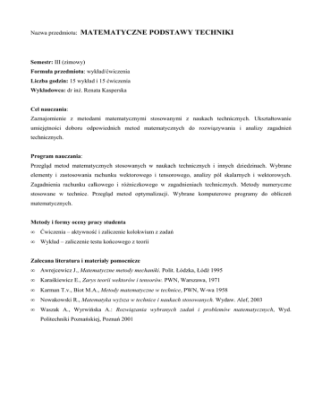 Nazwa przedmiotu: MATEMATYCZNE PODSTAWY TECHNIKI Semestr: III (zimowy) Formuła przedmiotu: wykład/ćwiczenia Liczba godzin: 15 wykład i 15 ćwiczenia Wykładowca: dr inż. Renata Kasperska Cel nauczania: Zaznajomienie z metodami matematycznymi stosowanymi z naukach technicznych. Ukształtowanie umiejętności doboru odpowiednich metod matematycznych do rozwiązywania i analizy zagadnień technicznych. Program nauczania: Przegląd metod matematycznych stosowanych w naukach technicznych i innych dziedzinach. Wybrane elementy i zastosowania rachunku wektorowego i tensorowego, analizy pól skalarnych i wektorowych. Zagadnienia rachunku całkowego i różniczkowego w zagadnieniach technicznych. Metody numeryczne stosowane w technice. Przegląd metod optymalizacji. Wybrane komputerowe programy do obliczeń matematycznych. Metody i formy oceny pracy studenta • Ćwiczenia – aktywność i zaliczenie kolokwium z zadań • Wykład – zaliczenie testu końcowego z teorii Zalecana literatura i materiały pomocnicze • Awrejcewicz J., Matematyczne metody mechaniki. Polit. Łódzka, Łódź 1995 • Karaśkiewicz E., Zarys teorii wektorów i tensorów. PWN, Warszawa, 1971 • Karman T.v., Biot M.A., Metody matematyczne w technice, PWN, W-wa 1958 • Nowakowski R., Matematyka wyższa w technice i naukach stosowanych. Wydaw. Alef, 2003 • Waszak A., Wyrwińska A.: Rozwiązania wybranych zadań i problemów matematycznych, Wyd. Politechniki Poznańskiej, Poznań 2001
