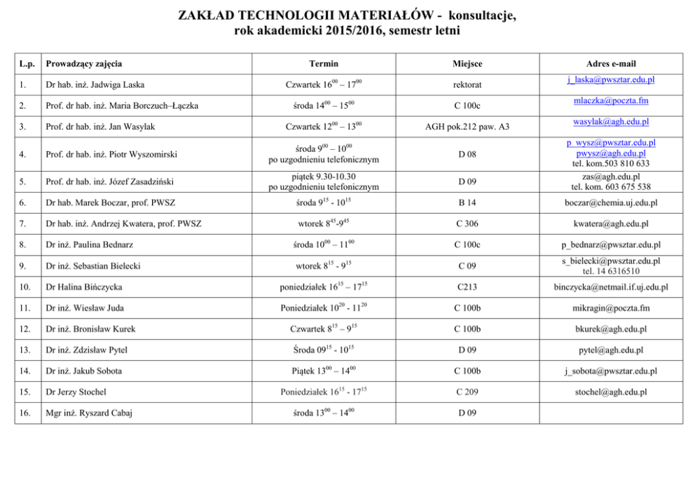 ZAKŁAD TECHNOLOGII MATERIAŁÓW - konsultacje, rok akademicki 2015/2016, semestr letni L.p. Prowadzący zajęcia Termin Miejsce 1. Dr hab. inż. Jadwiga Laska 2. Prof. dr hab. inż. Maria Borczuch–Łączka 3. Prof. dr hab. inż. Jan Wasylak 4. Adres e-mail Czwartek 1600 – 1700 rektorat środa 1400 – 1500 C 100c Czwartek 1200 – 1300 AGH pok.212 paw. A3 Prof. dr hab. inż. Piotr Wyszomirski środa 900 – 1000 po uzgodnieniu telefonicznym D 08 5. Prof. dr hab. inż. Józef Zasadziński piątek 9.30-10.30 po uzgodnieniu telefonicznym D 09 6. Dr hab. Marek Boczar, prof. PWSZ środa 915 - 1015 B 14 [email protected] 7. Dr hab. inż. Andrzej Kwatera, prof. PWSZ wtorek 845-945 C 306 [email protected] 8. Dr inż. Paulina Bednarz środa 1000 – 1100 C 100c [email protected] 9. Dr inż. Sebastian Bielecki wtorek 815 - 915 C 09 [email protected] tel. 14 6316510 10. Dr Halina Bińczycka poniedziałek 1615 – 1715 C213 [email protected] 11. Dr inż. Wiesław Juda Poniedziałek 1020 - 1120 C 100b [email protected] 12. Dr inż. Bronisław Kurek Czwartek 815 – 915 C 100b [email protected] 13. Dr inż. Zdzisław Pytel Środa 0915 - 1015 D 09 [email protected] 14. Dr inż. Jakub Sobota Piątek 1300 – 1400 C 100b [email protected] 15. Dr Jerzy Stochel Poniedziałek 1615 - 1715 C 209 [email protected] 16. Mgr inż. Ryszard Cabaj środa 1300 – 1400 D 09 [email protected] [email protected] [email protected] [email protected] [email protected] tel. kom.503 810 633 [email protected] tel. kom. 603 675 538