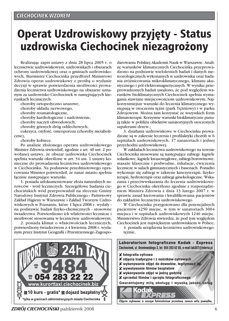 CIECHOCINEK WZOREM Operat Uzdrowiskowy przyj´ty - Status uzdrowiska Ciechocinek niezagro˝ony Realizujàc zapis ustawy z dnia 28 lipca 2005 r. o lecznictwie uzdrowiskowym, uzdrowiskach i obszarach ochrony uzdrowiskowej oraz o gminach uzdrowiskowych, Burmistrz Ciechocinka przed∏o˝y∏ Ministrowi Zdrowia operat uzdrowiskowy z proÊbà o wydanie decyzji w sprawie potwierdzenia mo˝liwoÊci prowadzenia lecznictwa uzdrowiskowego na obszarze uznanym za uzdrowisko Ciechocinek w nast´pujàcych kierunkach leczniczych: choroby ortopedyczno urazowe, choroby uk∏adu nerwowego, choroby reumatologiczne, choroby kardiologiczne i nadciÊnienie, choroby naczyƒ obwodowych, choroby górnych dróg oddechowych, cukrzyca, oty∏oÊç, osteoporoza (choroby metaboliczne), choroby kobiece. Po analizie z∏o˝onego operatu uzdrowiskowego Minister Zdrowia stwierdzi∏, zgodnie z art. 40 ust. 2 powo∏anej ustawy, ˝e obszar uzdrowiska Ciechocinek spe∏nia warunki okreÊlone w art. 34 ust. 1 ustawy konieczne do prowadzenia lecznictwa uzdrowiskowego w Ciechocinku. Na podstawie przedmiotowego opracowania Minister potwierdzi∏, ˝e nasze miasto spe∏nia ∏àcznie nast´pujàce warunki: 1. posiada udokumentowane z∏o˝a naturalnych surowców - wód leczniczych. Szczegó∏owe badania ciechociƒskich wód przeprowadzi∏ na zlecenie Gminy Narodowy Instytut Zdrowia Publicznego - Paƒstwowy Zak∏ad Higieny w Warszawie i Zak∏ad Tworzyw Uzdrowiskowych w Poznaniu, które 1 lipca 2008 r. wyda∏y na podstawie badaƒ fizyko-chemicznych - stosowne Êwiadectwa. Potwierdzono ich w∏aÊciwoÊci lecznicze i mo˝liwoÊç stosowania w lecznictwie uzdrowiskowym; 2. posiada klimat o w∏aÊciwoÊciach leczniczych, potwierdzony Êwiadectwem z 4 kwietnia 2008 r. wydanym przez Instytut Geografii i Przestrzennego Zagospo- ZDRÓJ CIECHOCI¡SKI paêdziernik 2008 darowania Polskiej Akademii Nauk w Warszawie. Analiz´ warunków klimatycznych Ciechocinka przeprowadzono na podstawie wieloletnich badaƒ i danych meteorologicznych wykonanych w uzdrowisku oraz badania zró˝nicowania mikroklimatycznego, klimatu akustycznego i pól elektromagnetycznych. W wyniku przeprowadzonych badaƒ ustalono, ˝e pod wzgl´dem warunków bioklimatycznych Ciechocinek spe∏nia wymagania stawiane miejscowoÊciom uzdrowiskowym. Najkorzystniejsze warunki do leczenia klimatycznego wyst´pujà w otoczeniu t´˝ni (park T´˝niowy) i w parku Zdrojowym. Mo˝na tam korzystaç ze wszystkich form klimatoterapii. Korzystne warunki bioklimatyczne panujà tak˝e w pobli˝u obiektów sanatoryjnych otoczonych szpalerami drzew.; 3. dzia∏ania uzdrowiskowe w Ciechocinku prowadzone sà w zakresie leczenia i profilaktyki chorób w 6 szpitalach uzdrowiskowych, 17 sanatoriach i jednej przychodni uzdrowiskowej. W zak∏adach lecznictwa uzdrowiskowego na terenie Ciechocinka stosowane sà nast´pujàce zabiegi: kàpiele solankowe, kàpiele kwasow´glowe, zabiegi borowinowe, masa˝e klasyczne i podwodne, inhalacje, çwiczenia lecznicze w salach gimnastycznych i basenach. Ponadto wykonuje si´ zabiegi w zakresie kinezyterapii, fizykoterapii, hydroterapii oraz zabiegi ginekologiczne. Wskazania i przeciwwskazania do leczenia uzdrowiskowego w Ciechocinku okreÊlono zgodnie z rozporzàdzeniem Ministra Zdrowia z dnia 13 lutego 2007 r. w sprawie zasad kierowania i kwalifikowania pacjentów do zak∏adów lecznictwa uzdrowiskowego. W Ciechocinku przygotowano dla potencjalnych pacjentów 4250 miejsc, w tym w sanatoriach 3004 miejsca i w szpitalach uzdrowiskowych 1246 miejsc. Ministerstwo Zdrowia stwierdza, ˝e pod tym wzgl´dem Ciechocinek jest najwi´kszym uzdrowiskiem w Polsce; 4. posiada urzàdzenia lecznictwa uzdrowiskowego: t´˝nie, 6 parki uzdrowiskowe, baseny rehabilitacyjne (w liczbie 12), êród∏o Grzybek - inhalatorium, Êcie˝ki zdrowia (19 Êcie˝ek spacerowo-zdrowotnych). Miasto charakteryzuje korzystna struktura funkcjonalno-przestrzenna, ukszta∏towana poprzez warunki naturalne, dotychczasowe zagospodarowanie terenów oraz posiadany status uzdrowiska. Ciechocinek ma dobrze rozwini´tà infrastruktur´ technicznà w zakresie gospodarki wodno-Êciekowej, energetyki, transportu, a tak˝e prowadzi w∏aÊciwà gospodark´ odpadami. Analizujàc ∏ad przestrzenny miasta, nale˝y zwróciç uwag´ na wyodr´bnione strefy funkcjonalne zwiàzane z lecznictwem uzdrowiskowym. Na powierzchni 1534 ha wyodr´bnione zosta∏y 3 strefy ochrony uzdrowiskowej: strefa A o powierzchni 347 ha i wskaênikiem zieleni 79%, strefa B majàca 512,8 ha i wyliczony wskaênik terenu biologicznie czynnego 80,7%, strefa C, która liczy 674,2 ha i wyliczony wskaênik terenu biologicznie czynnego 97%. Podzia∏ na strefy gwarantuje prowadzenie lecznictwa uzdrowiskowego w strefie A ochrony uzdrowiskowej i wzmacnianie jej walorów poprzez strefy B i C. W decyzji z dnia 8 paêdziernika 2008 r. Minister Zdrowia stwierdza, ˝e „w oparciu o dokumentacj´ zawartà w operacie uzdrowiskowym, Ciechocinek spe∏nia ∏àcznie warunki okreÊlone w ustawie o lecznictwie uzdrowiskowym, uzdrowiskach, o obszarach ochrony uzdrowiskowej oraz o gminach uzdrowiskowych”. Z satysfakcjà pragn´ poinformowaç Paƒstwa, ˝e operat uzdrowiskowy dla Ciechocinka oceniony zosta∏ przez Ministerstwo Zdrowia bardzo wysoko i prezentowany jest jako wzorcowy. Po uprawomocnieniu si´ cytowanej decyzji Ministra Zdrowia wystàpi´ do Rady Miejskiej z projektem uchwa∏y w sprawie przyj´cia opracowanego ju˝ Statutu Uzdrowiska Ciechocinek, bowiem - podobnie jak we wszystkich polskich uzdrowiskach - obowiàzywa∏ u nas Statut Tymczasowy. Leszek Dzier˝ewicz Burmistrz Ciechocinka OG¸OSZENIE BURMISTRZA CIECHOCINKA Stosownie do art. 35 ust. 1 ustawy z dnia 21 sierpnia 1997 r. o gospodarce nieruchomoÊciami (Dz. U. z 2004 r. Nr 261, poz. 2603 z póên. zm.) podaje si´ do publicznej wiadomoÊci, ˝e dnia 20 paêdziernika 2008 roku wywieszono w siedzibie Urz´du Miejskiego w Ciechocinku wykaz nieruchomoÊci przeznaczonych do sprze