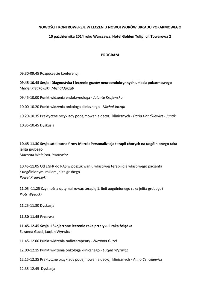 NOWOŚCI I KONTROWERSJE W LECZENIU NOWOTWORÓW UKŁADU POKARMOWEGO 10 października 2014 roku Warszawa, Hotel Golden Tulip, ul. Towarowa 2 PROGRAM 09.30-09.45 Rozpoczęcie konferencji 09.45-10.45 Sesja I Diagnostyka i leczenie guzów neuroendokrynnych układu pokarmowego Maciej Krzakowski, Michał Jarząb 09.45-10.00 Punkt widzenia endokrynologa - Jolanta Krajewska 10.00-10.20 Punkt widzenia onkologa klinicznego - Michał Jarząb 10.20-10.35 Praktyczne przykłady podejmowania decyzji klinicznych - Daria Handkiewicz - Junak 10.35-10.45 Dyskusja 10.45-11.30 Sesja satelitarna firmy Merck: Personalizacja terapii chorych na uogólnionego raka jelita grubego Marzena Wełnicka-Jaśkiewicz 10.45-11.05 Od EGFR do RAS w poszukiwaniu właściwej terapii dla właściwego pacjenta z uogólnionym rakiem jelita grubego Paweł Krawczyk 11.05 -11.25 Czy można optymalizowad terapię 1. linii uogólnionego raka jelita grubego? Piotr Wysocki 11.25-11.30 Dyskusja 11.30-11.45 Przerwa 11.45-12.45 Sesja II Skojarzone leczenie raka przełyku i raka żołądka Zuzanna Guzel, Lucjan Wyrwicz 11.45-12.00 Punkt widzenia radioterapeuty - Zuzanna Guzel 12.00-12.15 Punkt widzenia onkologa klinicznego - Lucjan Wyrwicz 12.15-12.35 Praktyczne przykłady podejmowania decyzji klinicznych - Anna Cencelewicz 12.35-12.45 Dyskusja 12.45-13.30 Sesja III Leczenie przerzutowego gruczolakoraka trzustki Lucjan Wyrwicz 12.45-12.55 12.55-13.25 Opieka nad pacjentami z przerzutowym gruczolakorakiem trzustki w perspektywie chirurgów i onkologów klinicznych: wnioski z przygotowania do badania populacyjnego – lek. Stanisław Nowak (Sequence) Nab-paklitaksel + gem – the new standard of treatment in 1st line metastatic pancreatic cancer patients?” – Wolfgang Eisterer (Vienna) 13.25-13.30 Dyskusja 13.30-14.00 Lunch 14.00 – 15.00 Sesja IV Strategie leczenia raka jelita grubego w praktyce Krzysztof Bujko, Andrzej Cichocki 14.00-14.10 Chemioterapia uzupełniająca u chorych na raka odbytnicy - czy stosowad i u kogo? Krzysztof Bujko 14.10-14.30 Rola leczenia miejscowego w chorobie rozsianej – resekcja ogniska pierwotnego i metody leczenia miejscowego przerzutów odległych - Andrzej Cichocki 14.30-14.50 Przerzutowy rak jelita grubego – jak wybrad chemioterapię? - Magdalena Krakowska 14.50-15.00 Dyskusja 15.00-15.45 Sesja satelitarna firmy Amgen. Dokąd zmierza leczenie zaawansowanego raka jelita grubego? Pytania i odpowiedzi. Prowadzący: Piotr Potemski Panel dyskusyjny: Lucjan Wyrwicz, Piotr Wysocki, Piotr Potemski Interaktywna prezentacja przypadków klinicznych: Anna Cencelewicz 15.45-16.45 Sesja V Najważniejsze doniesienia i nowości Marzena Wełnicka - Jaskiewicz i Piotr Potemski 15.45-16.05 Rak żołądka i trzustki - Aleksandra Łacko 16.05-16.25 Rak jelita grubego - Piotr Potemski 16.25-16.45 Inne - Marzena Wełnicka Jaskiewicz