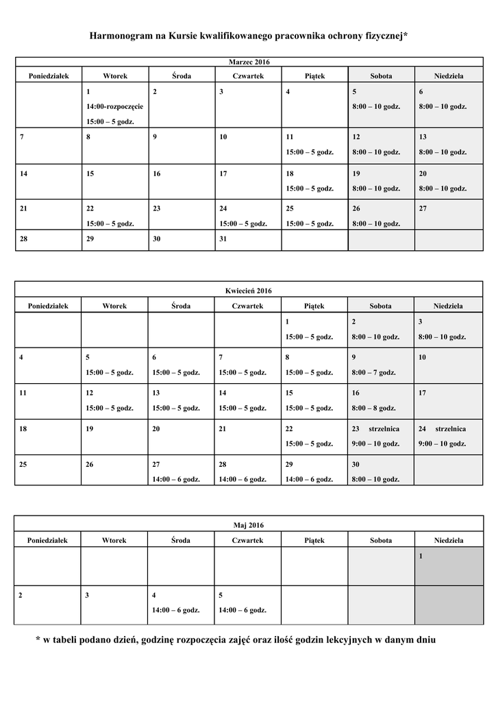 Harmonogram na Kursie kwalifikowanego pracownika ochrony fizycznej* Marzec 2016 Poniedziałek Wtorek 1 Środa 2 Czwartek 3 Piątek 4 Sobota Niedziela 5 6 8:00 – 10 godz. 8:00 – 10 godz. 11 12 13 15:00 – 5 godz. 8:00 – 10 godz. 8:00 – 10 godz. 18 19 20 15:00 – 5 godz. 8:00 – 10 godz. 8:00 – 10 godz. 24 25 26 27 15:00 – 5 godz. 15:00 – 5 godz. 8:00 – 10 godz. 14:00-rozpoczęcie 15:00 – 5 godz. 7 8 14 9 15 21 10 16 22 17 23 15:00 – 5 godz. 28 29 30 31 Kwiecień 2016 Poniedziałek 4 11 18 25 Wtorek Środa Czwartek Piątek Sobota 1 2 3 15:00 – 5 godz. 8:00 – 10 godz. 8:00 – 10 godz. 10 5 6 7 8 9 15:00 – 5 godz. 15:00 – 5 godz. 15:00 – 5 godz. 15:00 – 5 godz. 8:00 – 7 godz. 12 13 14 15 16 15:00 – 5 godz. 15:00 – 5 godz. 15:00 – 5 godz. 15:00 – 5 godz. 8:00 – 8 godz. 19 20 21 22 23 15:00 – 5 godz. 9:00 – 10 godz. 26 Niedziela 17 strzelnica 27 28 29 30 14:00 – 6 godz. 14:00 – 6 godz. 14:00 – 6 godz. 8:00 – 10 godz. 24 strzelnica 9:00 – 10 godz. Maj 2016 Poniedziałek Wtorek Środa Czwartek Piątek Sobota Niedziela 1 2 3 4 5 14:00 – 6 godz. 14:00 – 6 godz. * w tabeli podano dzień, godzinę rozpoczęcia zajęć oraz ilość godzin lekcyjnych w danym dniu