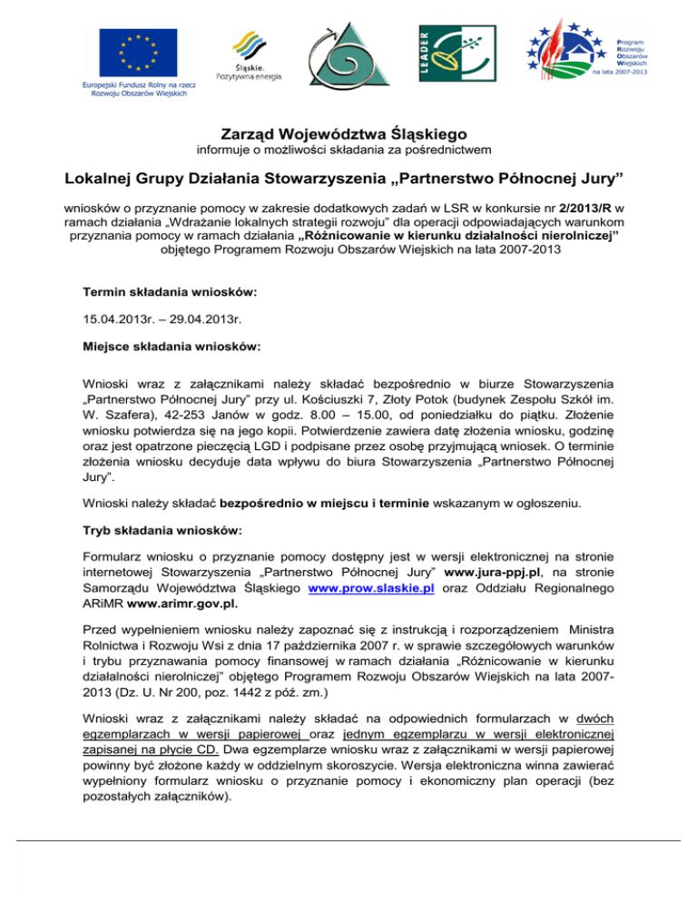 Zarząd Województwa Śląskiego informuje o możliwości składania za pośrednictwem Lokalnej Grupy Działania Stowarzyszenia „Partnerstwo Północnej Jury” wniosków o przyznanie pomocy w zakresie dodatkowych zadań w LSR w konkursie nr 2/2013/R w ramach działania „Wdrażanie lokalnych strategii rozwoju” dla operacji odpowiadających warunkom przyznania pomocy w ramach działania „Różnicowanie w kierunku działalności nierolniczej” objętego Programem Rozwoju Obszarów Wiejskich na lata 2007-2013 Termin składania wniosków: 15.04.2013r. – 29.04.2013r. Miejsce składania wniosków: Wnioski wraz z załącznikami należy składać bezpośrednio w biurze Stowarzyszenia „Partnerstwo Północnej Jury” przy ul. Kościuszki 7, Złoty Potok (budynek Zespołu Szkół im. W. Szafera), 42-253 Janów w godz. 8.00 – 15.00, od poniedziałku do piątku. Złożenie wniosku potwierdza się na jego kopii. Potwierdzenie zawiera datę złożenia wniosku, godzinę oraz jest opatrzone pieczęcią LGD i podpisane przez osobę przyjmującą wniosek. O terminie złożenia wniosku decyduje data wpływu do biura Stowarzyszenia „Partnerstwo Północnej Jury”. Wnioski należy składać bezpośrednio w miejscu i terminie wskazanym w ogłoszeniu. Tryb składania wniosków: Formularz wniosku o przyznanie pomocy dostępny jest w wersji elektronicznej na stronie internetowej Stowarzyszenia „Partnerstwo Północnej Jury” www.jura-ppj.pl, na stronie Samorządu Województwa Śląskiego www.prow.slaskie.pl oraz Oddziału Regionalnego ARiMR www.arimr.gov.pl. Przed wypełnieniem wniosku należy zapoznać się z instrukcją i rozporządzeniem Ministra Rolnictwa i Rozwoju Wsi z dnia 17 października 2007 r. w sprawie szczegółowych warunków i trybu przyznawania pomocy finansowej w ramach działania „Różnicowanie w kierunku działalności nierolniczej” objętego Programem Rozwoju Obszarów Wiejskich na lata 20072013 (Dz. U. Nr 200, poz. 1442 z póź. zm.) Wnioski wraz z załącznikami należy składać na odpowiednich formularzach w dwóch egzemplarzach w wersji papierowej oraz jednym egzemplarzu w wersji elektronicznej zapisanej na płycie CD. Dwa egzemplarze wniosku wraz z załącznikami w wersji papierowej powinny być złożone każdy w oddzielnym skoroszycie. Wersja elektroniczna winna zawierać wypełniony formularz wniosku o przyznanie pomocy i ekonomiczny plan operacji (bez pozostałych załączników). Kryteria wyboru operacji w ramach działania „Różnicowanie w kierunku działalności nierolniczej” stosowane przez Stowarzyszenie „Partnerstwo Północnej Jury” Lokalne kryteria wyboru operacji oraz karta oceny zgodności operacji z Lokalną Strategią Rozwoju (LSR) dla działania „Różnicowanie w kierunku działalności nierolniczej” znajdują się na stronie Stowarzyszenia „Partnerstwo Północnej Jury” www.jura-ppj.pl, na stronie Samorządu Województwa Śląskiego www.prow.slaskie.pl, Oddziału Regionalnego ARiMR www.arimr.gov.pl oraz w LSR Stowarzyszenia „Partnerstwa Północnej Jury”. Wykaz dokumentów niezbędnych do wyboru operacji „Różnicowania w kierunku działalności nierolniczej” przez Stowarzyszenie „Partnerstwo Północnej Jury”: 1. Wniosek o przyznanie pomocy wraz z wymaganymi załącznikami 2. Oświadczenie o przetwarzaniu danych osobowych Wykaz dokumentów niezbędnych do wyboru operacji „Różnicowanie w kierunku działalności nierolniczej” znajduje się na stronie Stowarzyszenia „Partnerstwo Północnej Jury” www.jurappj.pl, na stronie Samorządu Województwa Śląskiego www.prow.silesia-.pl, Oddziału Regionalnego ARiMR www.arimr.gov.pl. Minimalne wymagania, których spełnienie jest niezbędne do wyboru operacji w ramach „Różnicowanie w kierunku działalności nierolniczej” przez Radę Stowarzyszenia „Partnerstwo Północnej Jury” Operacjami wybranymi przez Radę do finansowania w ramach działania „Różnicowanie w kierunku działalności nierolniczej” są tylko te operacje, które uzyskały ocenę końcową wynoszącą, co najmniej 50% maksymalnej liczby punktów, co stanowi 40 punktów. Limit dostępnych środków Limit dostępnych środków w konkursie nr 2/2013/R w ramach działania „Różnicowanie w kierunku działalności nierolniczej” wynosi 10 000,00 zł. Refundacji podlega nie więcej niż 50 % kosztów kwalifikowalnych operacji poniesionych przez beneficjenta. Pomoc przyznaje się i wypłaca do wysokości limitu, który w okresie realizacji Programu wynosi maksymalnie 100 tys. złotych na jednego beneficjenta. Zakres tematyczny naboru: • Przedsięwzięcie: IX Sportowa jura. Przedsięwzięcie prowadzi do rozwoju różnych dziedzin sportu, wspiera powstanie lub modernizację obiektów i urządzeń sportowych, wpływa na wzrost aktywności sportowej, propaguje zachowania fair play, rywalizację i zdrowy tryb życia, poprzez uprawianie sportu zapobiega patologiom społecznym, przyczynia się do powstania klubów lub sekcji sportowych. Operacje w zakresie: budowa, modernizacja, wyposażenie obiektów sportowych, organizacja imprezy, wydarzenia sportowego, utworzenie sekcji sportowych Szczegółowych informacji na temat konkursu udziela LGD Stowarzyszenie „Partnerstwo Północnej Jury” w biurze: ul. Kościuszki 7, Złoty Potok, 42- 253 Janów , tel. 34 327 89 43; e-mail: [email protected]