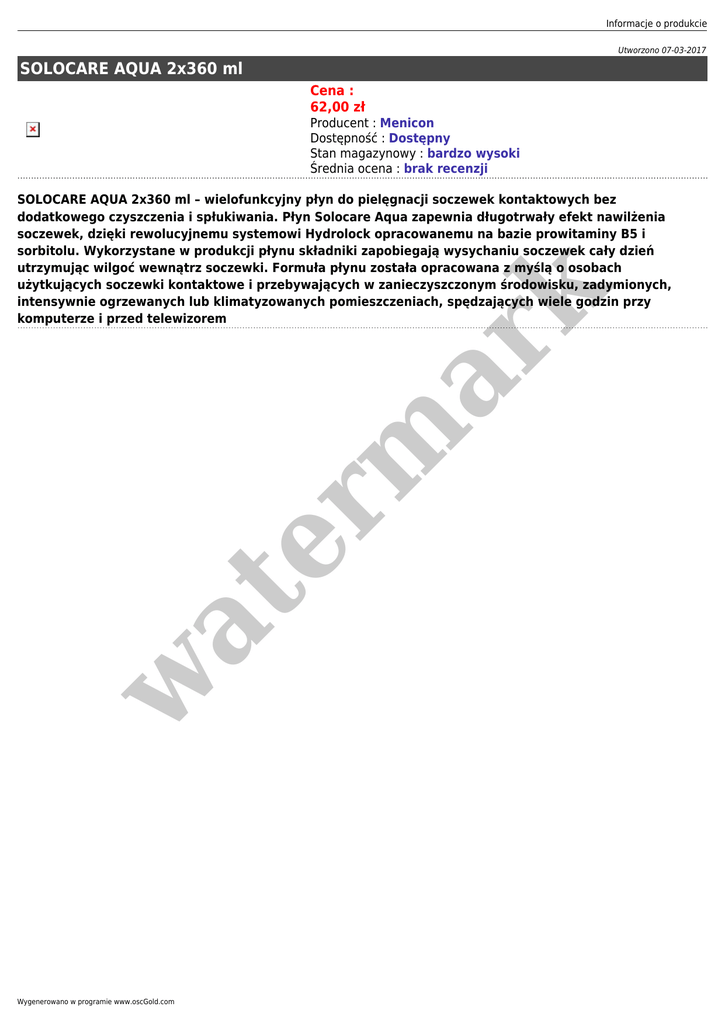 Informacje o produkcie Utworzono 07-03-2017 SOLOCARE AQUA 2x360 ml Cena : 62,00 zł Producent : Menicon Dostępność : Dostępny Stan magazynowy : bardzo wysoki Średnia ocena : brak recenzji w at er m ar k SOLOCARE AQUA 2x360 ml – wielofunkcyjny płyn do pielęgnacji soczewek kontaktowych bez dodatkowego czyszczenia i spłukiwania. Płyn Solocare Aqua zapewnia długotrwały efekt nawilżenia soczewek, dzięki rewolucyjnemu systemowi Hydrolock opracowanemu na bazie prowitaminy B5 i sorbitolu. Wykorzystane w produkcji płynu składniki zapobiegają wysychaniu soczewek cały dzień utrzymując wilgoć wewnątrz soczewki. Formuła płynu została opracowana z myślą o osobach użytkujących soczewki kontaktowe i przebywających w zanieczyszczonym środowisku, zadymionych, intensywnie ogrzewanych lub klimatyzowanych pomieszczeniach, spędzających wiele godzin przy komputerze i przed telewizorem Wygenerowano w programie www.oscGold.com