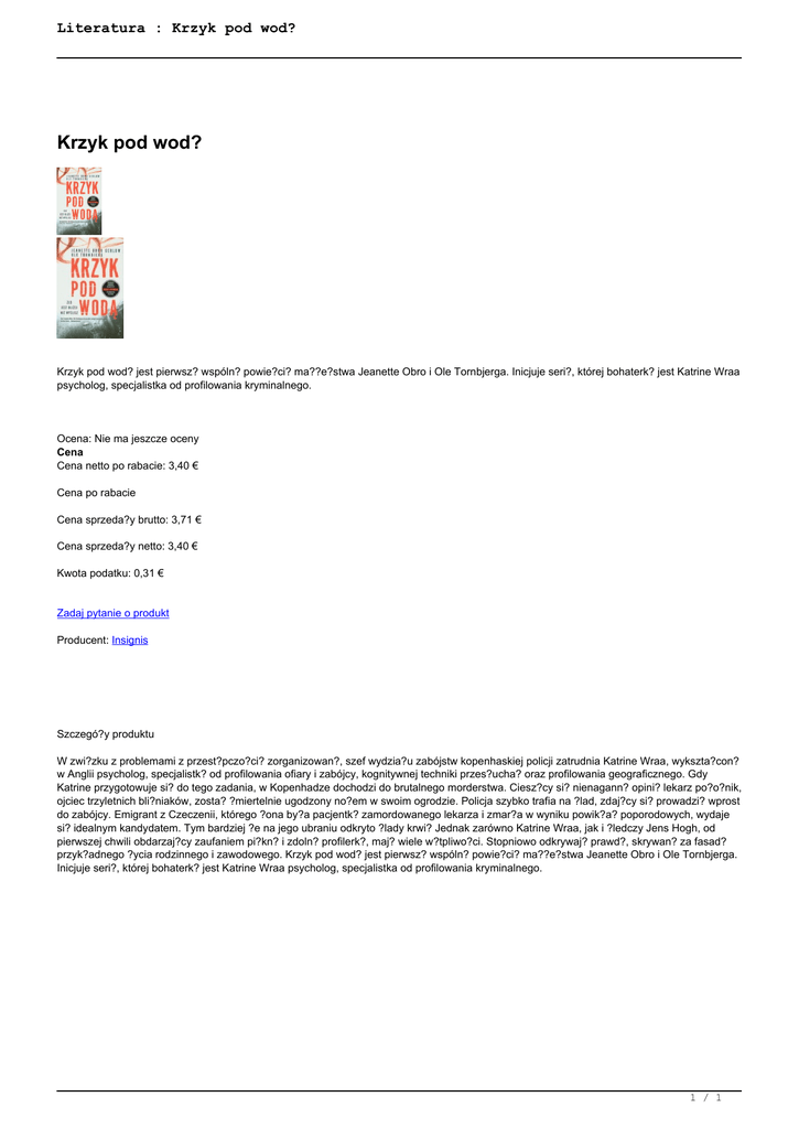 Literatura : Krzyk pod wod? Krzyk pod wod? Krzyk pod wod? jest pierwsz? wspóln? powie?ci? ma??e?stwa Jeanette Obro i Ole Tornbjerga. Inicjuje seri?, której bohaterk? jest Katrine Wraa psycholog, specjalistka od profilowania kryminalnego. Ocena: Nie ma jeszcze oceny Cena Cena netto po rabacie: 3,40 € Cena po rabacie Cena sprzeda?y brutto: 3,71 € Cena sprzeda?y netto: 3,40 € Kwota podatku: 0,31 € Zadaj pytanie o produkt Producent: Insignis Szczegó?y produktu W zwi?zku z problemami z przest?pczo?ci? zorganizowan?, szef wydzia?u zabójstw kopenhaskiej policji zatrudnia Katrine Wraa, wykszta?con? w Anglii psycholog, specjalistk? od profilowania ofiary i zabójcy, kognitywnej techniki przes?ucha? oraz profilowania geograficznego. Gdy Katrine przygotowuje si? do tego zadania, w Kopenhadze dochodzi do brutalnego morderstwa. Ciesz?cy si? nienagann? opini? lekarz po?o?nik, ojciec trzyletnich bli?niaków, zosta? ?miertelnie ugodzony no?em w swoim ogrodzie. Policja szybko trafia na ?lad, zdaj?cy si? prowadzi? wprost do zabójcy. Emigrant z Czeczenii, którego ?ona by?a pacjentk? zamordowanego lekarza i zmar?a w wyniku powik?a? poporodowych, wydaje si? idealnym kandydatem. Tym bardziej ?e na jego ubraniu odkryto ?lady krwi? Jednak zarówno Katrine Wraa, jak i ?ledczy Jens Hogh, od pierwszej chwili obdarzaj?cy zaufaniem pi?kn? i zdoln? profilerk?, maj? wiele w?tpliwo?ci. Stopniowo odkrywaj? prawd?, skrywan? za fasad? przyk?adnego ?ycia rodzinnego i zawodowego. Krzyk pod wod? jest pierwsz? wspóln? powie?ci? ma??e?stwa Jeanette Obro i Ole Tornbjerga. Inicjuje seri?, której bohaterk? jest Katrine Wraa psycholog, specjalistka od profilowania kryminalnego. 1 / 1 Powered by TCPDF (www.tcpdf.org)