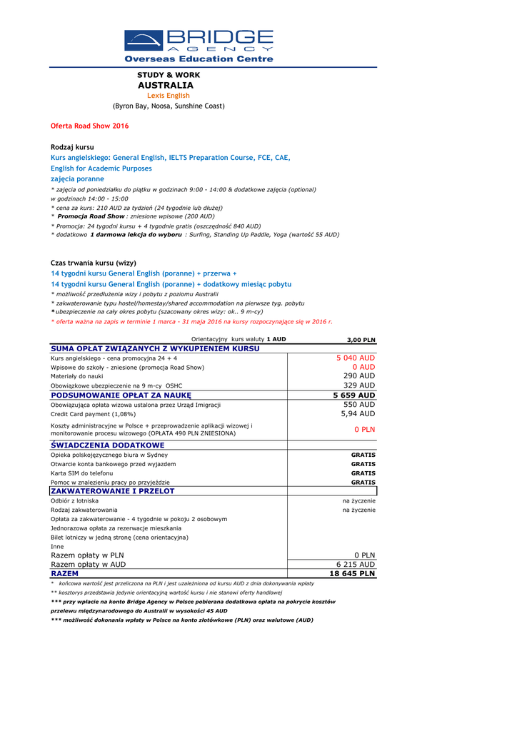 STUDY & WORK AUSTRALIA Lexis English (Byron Bay, Noosa, Sunshine Coast) Oferta Road Show 2016 Rodzaj kursu Kurs angielskiego: General English, IELTS Preparation Course, FCE, CAE, English for Academic Purposes zajęcia poranne * zajęcia od poniedziałku do piątku w godzinach 9:00 - 14:00 & dodatkowe zajęcia (optional) w godzinach 14:00 - 15:00 * cena za kurs: 210 AUD za tydzień (24 tygodnie lub dłużej) * Promocja Road Show : zniesione wpisowe (200 AUD) * Promocja: 24 tygodni kursu + 4 tygodnie gratis (oszczędność 840 AUD) * dodatkowo 1 darmowa lekcja do wyboru : Surfing, Standing Up Paddle, Yoga (wartość 55 AUD) Czas trwania kursu (wizy) 14 tygodni kursu General English (poranne) + przerwa + 14 tygodni kursu General English (poranne) + dodatkowy miesiąc pobytu * możliwość przedłużenia wizy i pobytu z poziomu Australii * zakwaterowanie typu hostel/homestay/shared accommodation na pierwsze tyg. pobytu * ubezpieczenie na cały okres pobytu (szacowany okres wizy: ok.. 9 m-cy) * oferta ważna na zapis w terminie 1 marca - 31 maja 2016 na kursy rozpoczynające się w 2016 r. Orientacyjny kurs waluty 1 AUD 3,00 PLN SUMA OPŁAT ZWIĄZANYCH Z WYKUPIENIEM KURSU Kurs angielskiego - cena promocyjna 24 + 4 Wpisowe do szkoły - zniesione (promocja Road Show) Materiały do nauki Obowiązkowe ubezpieczenie na 9 m-cy OSHC PODSUMOWANIE OPŁAT ZA NAUKĘ Obowiązująca opłata wizowa ustalona przez Urząd Imigracji Credit Card payment (1,08%) 5 040 AUD 0 AUD 290 AUD 329 AUD 5 659 AUD 550 AUD 5,94 AUD Koszty administracyjne w Polsce + przeprowadzenie aplikacji wizowej i monitorowanie procesu wizowego (OPŁATA 490 PLN ZNIESIONA) 0 PLN ŚWIADCZENIA DODATKOWE Opieka polskojęzycznego biura w Sydney GRATIS Otwarcie konta bankowego przed wyjazdem GRATIS Karta SIM do telefonu GRATIS Pomoc w znalezieniu pracy po przyjeździe GRATIS ZAKWATEROWANIE I PRZELOT Odbiór z lotniska na życzenie Rodzaj zakwaterowania na życzenie Opłata za zakwaterowanie - 4 tygodnie w pokoju 2 osobowym Jednorazowa opłata za rezerwacje mieszkania Bilet lotniczy w jedną stronę (cena orientacyjna) Inne Razem opłaty w PLN Razem opłaty w AUD RAZEM * 0 PLN 6 215 AUD 18 645 PLN końcowa wartość jest przeliczona na PLN i jest uzależniona od kursu AUD z dnia dokonywania wpłaty ** kosztorys przedstawia jedynie orientacyjną wartość kursu i nie stanowi oferty handlowej *** przy wpłacie na konto Bridge Agency w Polsce pobierana dodatkowa opłata na pokrycie kosztów przelewu międzynarodowego do Australii w wysokości 45 AUD *** możliwość dokonania wpłaty w Polsce na konto złotówkowe (PLN) oraz walutowe (AUD)