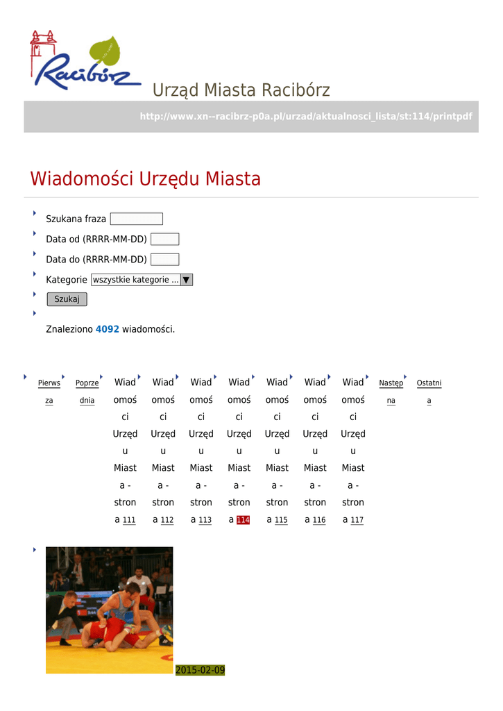 Urząd Miasta Racibórz http://www.xn--racibrz-p0a.pl/urzad/aktualnosci_lista/st:114/printpdf Wiadomości Urzędu Miasta Szukana fraza Data od (RRRR-MM-DD) Data do (RRRR-MM-DD) Kategorie wszystkie kategorie ... ▼ Szukaj Znaleziono 4092 wiadomości. Pierws Poprze Wiad Wiad Wiad Wiad Wiad Wiad Wiad Następ Ostatni za dnia omoś omoś omoś omoś omoś omoś omoś na a ci ci ci ci ci ci ci Urzęd Urzęd Urzęd Urzęd Urzęd Urzęd Urzęd u u u u u u u Miast Miast Miast Miast Miast Miast Miast a- a- a- a- a- a- a- stron stron stron stron stron stron stron a 111 a 112 a 113 a 114 a 115 a 116 a 117 2015-02-09 Memoriał Wiesława Hanczarka kategoria: Wiadomości i wydarzenia W najbliższą sobotę (14.02) Racibórz będzie gościł najlepszych polskich zapaśników stylu klasycznego. W Hali Arena Rafako odbędzie się Puchar Polski Seniorów - Memoriał im.Wiesława Hanczarka. 2015-02-06 Raciborski budżet na 2015 rok kategoria: Wiadomości i wydarzenia Duża pula pieniędzy (ponad 6,5 mln zł) obejmie miejskie inwestycje drogowe. Największe kwotowo wydatki na 2015 rok w miejskim budżecie zabezpieczono na oświatę, pomoc społeczną oraz gospodarkę komunalną i ochronę środowiska. 2015-02-06 Otwarty konkurs ofert kategoria: Wiadomości i wydarzenia Otwarty konkurs ofert na realizację zadań publicznych w dziedzinie kultury, objętych “Programem współpracy Miasta Racibórz z organizacjami pozarządowymi i innymi podmiotami prowadzącymi działalność pożytku publicznego na 2015 rok. 2015-02-05 Dzięki realizowanej przez Miasto Racibórz inicjatywie lokalnej szkoła w Sudole ma nowe okna kategoria: Wiadomości i wydarzenia Zdaje egzamin nowa forma realizacji zadań publicznych przez administrację samorządową we współpracy z mieszkańcami, nazywana inicjatywą lokalną. Po budowie placu zabaw na osiedlu M.C. Skłodowskiej zrealizowano kolejne zadanie. Na inicjatywę lokalną w tegorocznym budżecie Miasta przeznaczono 150 tysięcy zł. 2015-02-05 Prezydent Raciborza Mirosław Lenk wskazał przedstawicieli na członków I kadencji Rady Seniorów Miasta Racibórz. kategoria: Wiadomości i wydarzenia Do składu Rady Seniorów pierwszej kadencji Rada Miasta i Prezydent Miasta wskazują po dwóch członków. 2015-02-05 Przyznano stypendia sportowe na okres pierwszego kwartału 2015 roku kategoria: Wiadomości i wydarzenia Prezydent Raciborza Mirosław Lenk przyznał 23 zawodnikom stypendia sportowe na okres pierwszego kwartału 2015 roku. 2015-02-04 Konkurs: Najładniejsza elewacja 2014 roku kategoria: Wiadomości i wydarzenia Do konkursu mogą być zgłaszane budynki, w których prace polegające na remoncie, przebudowie lub termomodernizacji obejmujące swym zakresem elewacje budynku, prowadzone były w 2014 roku oraz zostaną zakończone do 14 kwietnia 2015 roku. 2015-02-03 Rockowe uderzenie na deskach RCK kategoria: Wiadomości i wydarzenia Raciborskie Centrum Kultury organizuje ciekawe wydarzenie dla wszystkich miłośników mocnego brzmienia. 7 lutego o godz. 18:00 przy ul. Chopina 21 zagrają trzy rockowo-metalowe kapele. Wstęp jest wolny. 2015-02-03 Mateusz Wolny trzeci w GP Paryża kategoria: Wiadomości i wydarzenia Mateusz Wolny zajął trzecie miejsce w silnie obsadzonym międzynarodowym turnieju w zapasach stylu klasycznego – Grand Prix Paryża(31.01 – 01.02). Zawodnik MKZ Unii Racibórz występujący w wyższej niż zazwyczaj kategorii wagowej(do 80 kg), stoczył w sumie w stolicy Francji, cztery walki. 2015-02-02 Praca w Urzędzie Miasta Racibórz kategoria: Wiadomości i wydarzenia Urząd Miasta Racibórz ogłasza nabór na wolne stanowiska urzędnicze: naczelnika Wydziału Edukacji, Kultury i Sportu oraz podinspektora ds. dokumentacji budżetowej w Wydziale Lokalowym. Pierws Poprze Wiad Wiad Wiad Wiad Wiad Wiad Wiad Następ Ostatni za dnia omoś omoś omoś omoś omoś omoś omoś na a ci ci ci ci ci ci ci Urzęd Urzęd Urzęd Urzęd Urzęd Urzęd Urzęd u u u u u u u Miast Miast Miast Miast Miast Miast Miast a- a- a- a- a- a- a- stron stron stron stron stron stron stron a 111 a 112 a 113 a 114 a 115 a 116 a 117