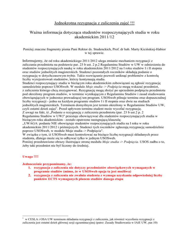 Jednokrotna rezygnacja z zaliczenia zajęć !!! Ważna informacja dotycząca studentów rozpoczynających studia w roku akademickim 2011/12 Poniżej znaczne fragmenty pisma Pani Rektor ds. Studenckich, Prof. dr hab. Marty Kicińskiej-Habior w tej sprawie. Informujemy, że od roku akademickiego 2011/2012 ulega zmianie mechanizm rezygnacji z zaliczania przedmiotu na podstawie par. 23 b ust. 2 p.2 Regulaminu Studiów w UW w odniesieniu do studentów rozpoczynających naukę w roku akademickim 2011/2012 na I roku studiów I i II stopnia oraz studiów jednolitych magisterskich. Studenci pozostałych roczników składają podanie o rezygnację w dotychczasowym trybie. Takie rozwiązanie pozwoli uniknąć problemów z kontrolą liczby wyrejestrowań studentów, którzy kontynuują studia. Studenci rozpoczynający studia w bieżącym roku akademickim zobowiązani są zgłosić rezygnację samodzielnie poprzez USOSweb. W module Moje studia -> Podpięcia mogą wskazać przedmiot, z zaliczenia którego chcą zrezygnować. Rezygnację mogą złożyć po uprzednim podpięciu przedmiotu pod określony program studiów, w terminie wynikającym z Regulaminu Studiów i zasad studiowania obowiązujących w jednostce prowadzącej ten program. USOSweb pilnuje terminu oraz dopuszczalnej liczby rezygnacji - jedna na każdym programie studiów I i II stopnia oraz dwie na studiach jednolitych magisterskich. Terminem domyślnym jest termin określony w Regulaminie Studiów UW, czyli ostatni dzień zajęć1. Przed upływem terminu student może wycofać rezygnację. Z uwagi na fakt, iż „Podanie o rezygnację z zaliczenia przedmiotu (par. 23 b ust.2 p. 2 Regulaminu Studiów w UW)" przestaje obowiązywać dla studentów rozpoczynających studia w bieżącym roku akademickim - zostało opatrzone następującą klauzulą: „UWAGA: podanie NIE obowiązuje studentów rozpoczynających studia na I roku w roku akademickim 2011/2012 i późniejszych. Studenci tych roczników zgłaszają rezygnację samodzielnie poprzez USOSweb, w module Moje studia -> Podpięcia". W związku z tym, iż USOSweb musi kontrolować na bieżąco liczbę rezygnacji składanych przez studenta, dlatego może się to odbywać tylko w jednym USOSweb. Poniżej przedstawiono obrazy ilustrujące stronę modułu Moje studia -> Podpięcia. USOS zadba o to, żeby taki przedmiot nie był liczony do średniej. Uwaga !!!! Jednocześnie przypominamy, że: 1. rezygnacja z zaliczenia nie dotyczy przedmiotów obowiązkowych wymaganych w programie studiów (mimo, że w USOSweb opcja ta jest możliwa) 2. rezygnacja z zaliczenia nie zwalnia studenta z wymogu uzyskaniu odpowiedniej liczby punktów ECTS wymaganych planem studiów danego etapu 1 w CESLA i OSA UW terminem składania rezygnacji z zaliczenia, jak również wycofania rezygnacji z zaliczenia jest ostatni dzień głównej sesji egzaminacyjnej (patrz: Zasady Studiowania w IAiE UW, par.10) Poniżej przedstawiony został USOSwebowy mechanizm rezygnacji z zaliczenia:
