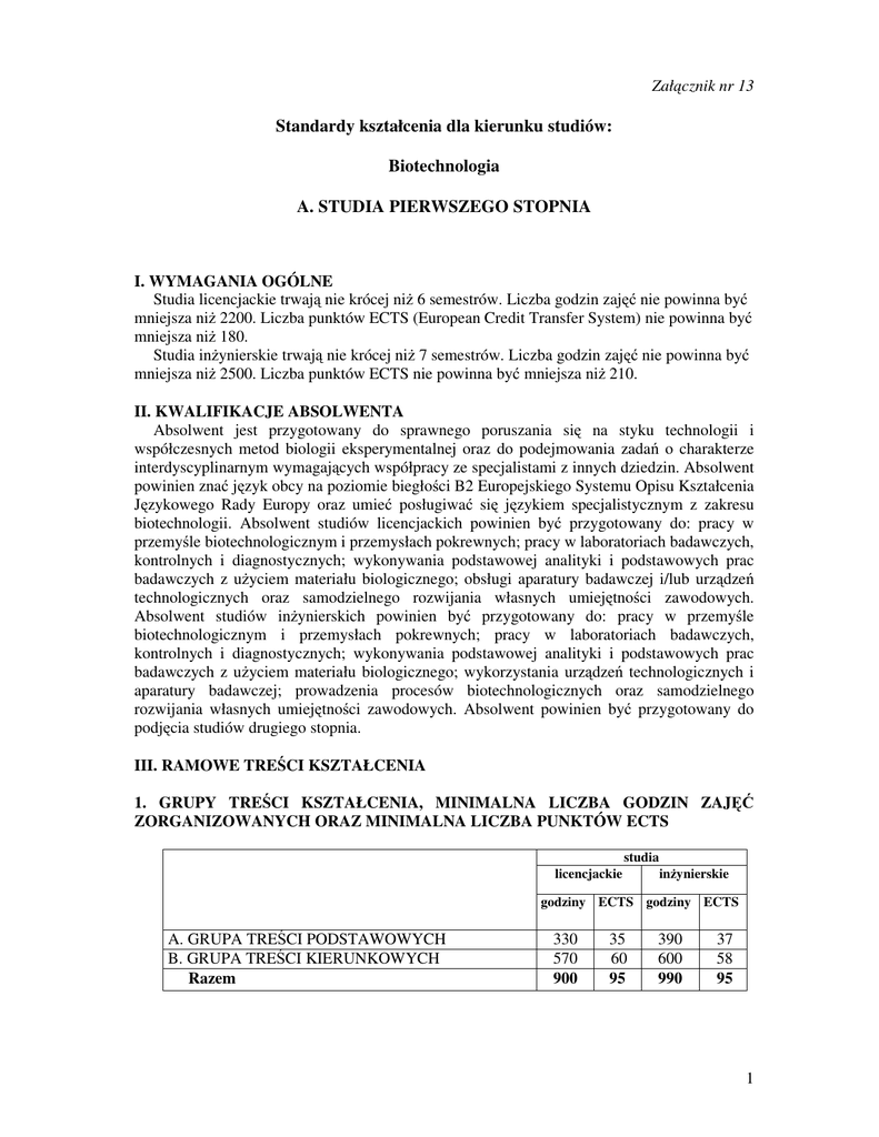 Zał cznik nr 13 Standardy kształcenia dla kierunku studiów: Biotechnologia A. STUDIA PIERWSZEGO STOPNIA I. WYMAGANIA OGÓLNE Studia licencjackie trwaj nie krócej ni 6 semestrów. Liczba godzin zaj nie powinna by mniejsza ni 2200. Liczba punktów ECTS (European Credit Transfer System) nie powinna by mniejsza ni 180. Studia in ynierskie trwaj nie krócej ni 7 semestrów. Liczba godzin zaj nie powinna by mniejsza ni 2500. Liczba punktów ECTS nie powinna by mniejsza ni 210. II. KWALIFIKACJE ABSOLWENTA Absolwent jest przygotowany do sprawnego poruszania si na styku technologii i współczesnych metod biologii eksperymentalnej oraz do podejmowania zada o charakterze interdyscyplinarnym wymagaj cych współpracy ze specjalistami z innych dziedzin. Absolwent powinien zna j zyk obcy na poziomie biegło ci B2 Europejskiego Systemu Opisu Kształcenia J zykowego Rady Europy oraz umie posługiwa si j zykiem specjalistycznym z zakresu biotechnologii. Absolwent studiów licencjackich powinien by przygotowany do: pracy w przemy le biotechnologicznym i przemysłach pokrewnych; pracy w laboratoriach badawczych, kontrolnych i diagnostycznych; wykonywania podstawowej analityki i podstawowych prac badawczych z u yciem materiału biologicznego; obsługi aparatury badawczej i/lub urz dze technologicznych oraz samodzielnego rozwijania własnych umiej tno ci zawodowych. Absolwent studiów in ynierskich powinien by przygotowany do: pracy w przemy le biotechnologicznym i przemysłach pokrewnych; pracy w laboratoriach badawczych, kontrolnych i diagnostycznych; wykonywania podstawowej analityki i podstawowych prac badawczych z u yciem materiału biologicznego; wykorzystania urz dze technologicznych i aparatury badawczej; prowadzenia procesów biotechnologicznych oraz samodzielnego rozwijania własnych umiej tno ci zawodowych. Absolwent powinien by przygotowany do podj cia studiów drugiego stopnia. III. RAMOWE TRE CI KSZTAŁCENIA 1. GRUPY TRE CI KSZTAŁCENIA, MINIMALNA LICZBA GODZIN ZAJ ZORGANIZOWANYCH ORAZ MINIMALNA LICZBA PUNKTÓW ECTS licencjackie studia in ynierskie godziny ECTS godziny ECTS A. GRUPA TRE CI PODSTAWOWYCH B. GRUPA TRE CI KIERUNKOWYCH Razem 330 570 900 35 60 95 390 600 990 37 58 95 1 2. SKŁADNIKI TRE CI KSZTAŁCENIA W GRUPACH, MINIMALNA LICZBA GODZIN ZAJ ZORGANIZOWANYCH ORAZ MINIMALNA LICZBA PUNKTÓW ECTS studia licencjackie in ynierskie godziny ECTS godziny ECTS A. GRUPA TRE CI PODSTAWOWYCH Tre ci kształcenia w zakresie: 1. Matematyki 2. Fizyki i biofizyki 3. Chemii B. GRUPA TRE CI KIERUNKOWYCH Tre ci kształcenia w zakresie: 1. Biologii eksperymentalnej 2. Biologicznych aspektów biotechnologii 3. Technologicznych aspektów biotechnologii 330 90 90 150 570 35 390 37 60 150 90 150 600 58 3. TRE CI I EFEKTY KSZTAŁCENIA A. GRUPA TRE CI PODSTAWOWYCH 1. Kształcenie w zakresie matematyki Tre ci kształcenia: Ci gi i szeregi liczbowe. Funkcje jednej i wielu zmiennych – wła ciwo ci. Funkcje elementarne. Rachunek ró niczkowy i całkowy funkcji jednej i wielu zmiennych. Rozwi zywanie równa ró niczkowych. Rachunek macierzowy – rozwi zywanie układów równa liniowych. Rachunek prawdopodobie stwa i statystyka. Efekty kształcenia – umiej tno ci i kompetencje: wykorzystania narz dzi matematycznych do opisu zjawisk i procesów fizycznych, chemicznych i biologicznych. 2. Kształcenie w zakresie fizyki i biofizyki Tre ci kształcenia: Elementy fizyki i biofizyki niezb dne do zrozumienia i ilo ciowego opisu zjawisk wyst puj cych w organizmach i ich tkankach, komórkach i organellach. Metody fizyczne wykorzystywane w badaniach biologicznych. Mechanika i termodynamika klasyczna. Elektryczne i magnetyczne wła ciwo ci materii. Optyczne wła ciwo ci materii. Fizyczne podstawy procesów biologicznych. Zastosowanie metod fizycznych do badania organizmów i procesów biologicznych. Efekty kształcenia – umiej tno ci i kompetencje: rozumienia zjawisk i procesów fizycznych w przyrodzie; wykonywania pomiarów; okre lania podstawowych wielko ci fizycznych; wykorzystywania praw przyrody w technice i yciu codziennym. 3. Kształcenie w zakresie chemii Tre ci kształcenia: Budowa materii. Rodzaje wi za chemicznych i oddziaływa mi dzycz steczkowych. Termodynamika i kinetyka chemiczna. Równowagi fazowe. Elektrochemia. Zjawiska powierzchniowe. Sorpcja. Elementy chemii analitycznej – klasycznej i instrumentalnej. Budowa, wła ciwo ci i przemiany zwi zków organicznych. Podstawowe techniki laboratoryjne stosowane w syntezie organicznej. Efekty kształcenia – umiej tno ci i kompetencje: opisu okresowych wła ciwo ci pierwiastków i prostych poł cze chemicznych; opisu wła ciwo ci i reaktywno ci zwi zków nieorganicznych; pomiaru lub wyznaczania wielko ci fizykochemicznych; interpretacji i opisu fenomenologicznego wła ciwo ci fizykochemicznych; wykonywania analiz ilo ciowych i 2 jako ciowych w zakresie niezb dnym w biotechnologii; posługiwania si metodami racjonalnej syntezy organicznej; korzystania z metod instrumentalnych w ustalaniu budowy i zachowania zwi zków organicznych. B. GRUPA TRE CI KIERUNKOWYCH 1. Kształcenie w zakresie biologii eksperymentalnej Tre ci kształcenia: Podstawy biochemiczne, molekularne i komórkowe funkcjonowania organizmów. Integracja danych dostarczanych z poszczególnych obszarów biologii eksperymentalnej w zakresie hierarchicznej organizacji procesów biologicznych, w tym zale no ci struktura-funkcja na ró nych poziomach organizacyjnych: makrocz steczek (kwasów nukleinowych, białek, polisacharydów, lipidów), komórek (organizacji strukturalnej komórek i ich funkcji), tkanek i organizmów. Zasady przekazywania i wyra ania (ekspresji) informacji genetycznej i jej przekształcania w układ trójwymiarowych, współpracuj cych ze sob cz steczek. Analiza porównawcza. Analiza procesów molekularnych w organizmach prokariotycznych i eukariotycznych. Podstawowe mechanizmy regulacji procesów rozwojowych i fizjologicznych organizmów ywych. Efekty kształcenia – umiej t