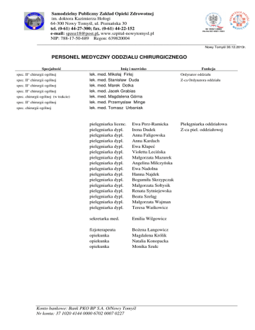 Samodzielny Publiczny Zakład Opieki Zdrowotnej im. doktora Kazimierza Hołogi 64-300 Nowy Tomyśl, ul. Poznańska 30 tel. (0-61) 44-27-300; fax. (0-61) 44-22-152 e-mail: [email protected], www.szpital-nowytomysl.pl NIP: 788-17-50-689 Regon: 639820004 _____________________________________________________________________________________________ Nowy Tomyśl 30.12.2013r. PERSONEL MEDYCZNY ODDZIAŁU CHIRURGICZNEGO Specjalność spec. II° chirurgii ogólnej spec. II° chirurgii ogólnej spec. II° chirurgii ogólnej spec. II° chirurgii ogólnej spec. chirurgii ogólnej (w trakcie) spec. II° chirurgii ogólnej spec. chirurgii ogólnej Imię i nazwisko Funkcja lek. med. Mikołaj Firlej lek. med. Stanisław Duda lek. med. Marek Dotka lek. med. Jacek Grabias lek. med. Magdalena Górna lek. med. Przemyslaw Minge lek. med. Tomasz Urbaniak Ordynator oddziału pielęgniarka licenc. pielęgniarka dypl. pielęgniarka dypl. pielęgniarka dypl. pielęgniarka dypl. pielęgniarka dypl. pielęgniarka dypl. pielęgniarka dypl. pielęgniarka dypl. pielęgniarka dypl. pielęgniarka dypl. pielęgniarka dypl. pielęgniarka dypl. pielęgniarka dypl. pielęgniarka dypl. pielęgniarka dypl. Ewa Perz-Ramicka Irena Dudek Anna Faligowska Anna Kardach Ewa Kłapeć Violetta Lecińska Małgorzata Mazurek Angelina Milczyńska Ewa Nadolna Hanna Najdek Bogumiła Skrzypczak Małgorzata Sołtysik Renata Sytniejewska Beata Szeląg Małgorzata Wajman Teresa Waśkowicz Pielęgniarka oddziałowa Z-ca piel. oddziałowej sekretarka med. Emilia Wilgowicz fizjoterapeuta opiekunka opiekunka opiekunka Bożena Łangowicz Magdalena Królik Natalia Konopacka Monika Szulc Konto bankowe: Bank PKO BP S.A. O/Nowy Tomyśl Nr konta: 37 1020 4144 0000 6702 0007 0227 Z-ca Ordynatora oddziału