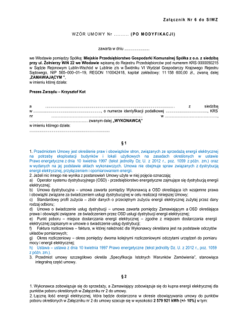 Załącznik Nr 6 do SIWZ WZÓR UMOWY Nr ......... ( PO MODYFIKACJI) zawarta w dniu ........................ we Włodawie pomiędzy Spółką: Miejskie Przedsiębiorstwo Gospodarki Komunalnej Spółka z o.o. z siedzibą przy ul. Żołnierzy WiN 22 we Włodawie wpisaną do Rejestru Przedsiębiorców pod numerem KRS 0000050215 w Sądzie Rejonowym Lublin-Wschód w Lublinie z/s w Świdniku VI Wydział Gospodarczy Krajowego Rejestru Sądowego, NIP 565–000–01–19, REGON 110042418, kapitał zakładowy: 11 158 600,00 zł., zwaną dalej „ZAMAWIAJĄCYM ”, w imieniu której działa: Prezes Zarządu – Krzysztof Kot a ........................................................................................................................... . z siedzibą w ................................................................., o numerze identyfikacji podatkowej ........................................, KRS nr ………………………………………………………………. w ……………………………………, …………………..…………………… zwanym dalej „WYKONAWCĄ” w imieniu którego działa: ............................................................................. §1 1. Przedmiotem Umowy jest określenie praw i obowiązków stron, związanych ze sprzedażą energii elektrycznej na potrzeby eksploatacji budynków i lokali użytkowych na zasadach określonych w ustawie Prawo energetyczne z dnia 10 kwietnia 1997 (tekst jednolity Dz. U. z 2012 r., poz. 1059 z późn. zm.) oraz w wydanych na jej podstawie aktach wykonawczych. Umowa nie obejmuje spraw związanych z dystrybucją energii elektrycznej, przyłączeniem i opomiarowaniem energii. 2. Jeżeli nic innego nie wynika z postanowień Umowy użyte w niej pojęcia oznaczają: a) Operator systemu dystrybucyjnego (OSD) - przedsiębiorstwo energetyczne zajmujące się dystrybucją energii elektrycznej; b) Umowa dystrybucyjna – umowa zawarta pomiędzy Wykonawcą a OSD określająca ich wzajemne prawa i obowiązki związane za świadczeniem usługi dystrybucyjnej w celu realizacji niniejszej Umowy; c) Standardowy profil zużycia – zbiór danych o przeciętnym zużyciu energii elektrycznej zużytej przez dany rodzaj odbioru; d) Umowa o świadczenie usług dystrybucji – umowa zawarta pomiędzy Zamawiającym a OSD określająca prawa i obowiązki związane ze świadczeniem przez OSD usługi dystrybucji energii elektrycznej; e) Punkt poboru – miejsce dostarczania energii elektrycznej – zgodne z miejscem dostarczania energii elektrycznej zapisanym w umowie o świadczenie usług dystrybucji; f) Faktura rozliczeniowa – faktura, w której należność dla Wykonawcy określana jest na podstawie odczytów układów pomiarowych; g) Okres rozliczeniowy – okres pomiędzy dwoma kolejnymi rozliczeniowymi odczytami urządzeń do pomiaru mocy i energii elektrycznej; h) Ustawa – ustawa z dnia 10 kwietnia 1997 Prawo energetyczne (tekst jednolity Dz. U. z 2012 r., poz. 1059 z późn. zm.). 3. Przedmiot umowy szczegółowo określa „Specyfikacja Istotnych Warunków Zamówienia”, stanowiąca integralną część umowy. §2 1. Wykonawca zobowiązuje się do sprzedaży, a Zamawiający zobowiązuje się do kupna energii elektrycznej dla punktów poboru określonych w Załączniku nr 2 do umowy. 2. Łączną ilość energii elektrycznej, która będzie dostarczona w okresie obowiązywania umowy do punktów poboru określonych w Załączniku nr 2 do umowy szacuje się w wysokości 2 579 921 kWh (+/- 10%) w tym: • energia rozliczana całodobowo 789 121 kWh • energia rozliczana w strefie szczytowej 432 316 kWh • energia rozliczana w strefie pozaszczytowej 1 358 484 kWh 3. Moc umowna, grupa taryfowa i warunki ich zmian oraz miejsce dostarczenia energii elektrycznej dla punktów poboru wymienionych w Załączniku nr 2 określane są każdorazowo w Umowie o świadczenie usług dystrybucji zawartej pomiędzy Zamawiającym a OSD. 4. Wykonawca zobowiązuje się również do pełnienia funkcji podmiotu odpowiedzialnego za bilansowanie handlowe dla energii elektrycznej sprzedanej w ramach tej Umowy. Wykonawca dokonywać będzie bilansowania handlowego energii zakupionej przez Klienta na podstawie standardowego profilu zużycia odpowiedniego dla odbiorców w grupach taryfowych i przy mocach umownych określonych w Załączniku nr 2 lub wskazań układów pomiarowych. 5. Koszty wynikające z dokonania bilansowania uwzględnione są w cenie energii elektrycznej określonej w § 5 ust. 3. 6. Energia elektryczna kupowana na podstawie niniejszej umowy zużywana będzie na potrzeby odbiorcy końcowego. §3 Standardy jakości obsługi 1. Standardy jakości obsługi Zamawiającego zostały określone w obowiązujących przepisach wykonawczych wydanych na podstawie Ustawy. 2. W przypadku niedotrzymania standardów jakościowych obsługi dotyczącej sprzedaży energii dla Zamawiającego na jego pisemny wniosek przysługuje mu prawo do bonifikaty – zgodnie z zasadami określonymi w §42 Rozporządzenia Ministra Gospodarki z dnia 18 sierpnia 2011 r. w sprawie szczegółowych zasad kształtowania i kalkulacji taryf oraz rozliczeń w obrocie energią elektryczną (Dz. U. Nr 189, poz. 1126) lub w każdym później wydanym akcie prawnym dotyczącym jakościowych standardów obsługi. §4 1. Do obowiązków Zamawiającego należy: a) pobieranie energii elektrycznej zgodnie z warunkami Umowy oraz obowiązującymi przepisami prawa. b) terminowe regulowanie należności za zakupioną energię elektryczną. c) powiadamianie Wykonawcy o zmianie planowanej wielkości zużycia energii elektrycznej w przypadku zmian w sposobie wykorzystania urządzeń i instalacji elektrycznych w poszczególnych punktach poboru. 2. Do obowiązków Wykonawcy należy: a) przestrzeganie standardów jakościowych obsługi odbiorców. b) przyjmowanie od Zamawiającego w uzgodnionym czasie zgłoszeń i reklamacji, dotyczących dostarczanej energii elektrycznej i jej r