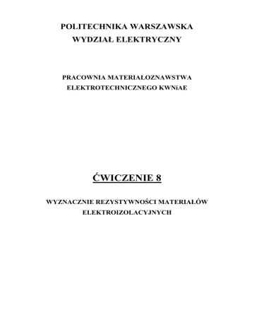 POLITECHNIKA WARSZAWSKA WYDZIAŁ ELEKTRYCZNY PRACOWNIA MATERIAŁOZNAWSTWA ELEKTROTECHNICZNEGO KWNiAE ĆWICZENIE 8 WYZNACZNIE REZYSTYWNOŚCI MATERIAŁÓW ELEKTROIZOLACYJNYCH 1. Zachowanie dielektryka w polu elektrycznym Materiałami elektroizolacyjnymi, czyli dielektrykami są materiały praktycznie nie zawierające swobodnych ładunków. Brak swobodnych ładunków powoduje, że stawiają one bardzo wysoki opór przepływowi prądu elektrycznego. Z pośród tej grupy materiałów największe zastosowanie mają dielektryki stałe. Na zachowanie się dielektryka w polu elektrycznym wpływają trzy główne czynniki: • polaryzacja, • przewodność, • jonizacja. Polaryzacja jest to zjawisko zależne od budowy dielektryka. Rozróżniamy budowę polarną (dipolową) i niepolarną. Polaryzacja dielektryka jest wypadkową polaryzacji poszczególnych elementów struktury dielektryka takich jak atomy, jony, cząsteczki. Dla dielektryków niepolarnych ich polaryzacja polega na powstaniu nietrwałych, indukowanych dipoli z poszczególnych atomów. Po usunięciu pola elektrycznego następuje szybki zanik polaryzacji. Dielektryki polarne charakteryzują się posiadaniem trwałych dipoli, które istnieją niezależnie od dipoli indukowanych polem. Pod wpływem pola elektrycznego następuje uporządkowanie przestrzenne dipoli trwałych i trwa dłużej po usunięciu pola. Polaryzacja powoduje, więc większe straty energii na skutek utrzymywania się uporządkowania dipoli. Przenikalność elektryczna wzgledna ε jest miarą polaryzacji dielektryka i zdefiniowana jest jako stosunek pojemności kondensatora o określonych wymiarach z danym dielektrykiem, do pojemności kondensatora o identycznych wymiarach ale wypełnionego próżnią. ε= Cd C0 Cd – pojemność kondensatora wypełnionego danym dielektrykiem C0 – pojemność kondensatora wypełnionego próżnią Zjawisku polaryzacji towarzyszą straty energii, związane z pokonywaniem oporów przy zmianie położenia dipoli. W przypadku dielektryków niepolarnych straty mają znaczenie przy wyższych częstotliwościach. Dla dielektryków polarnych straty te mogą osiągnąć znaczne wartości już przy częstotliwościach sieciowych. Kąt δ jest miarą strat mocy w dielektryku przy napięciu sinusoidalnie zmiennym. Stąd często nazywa się go kątem stratności. Na wykresie wektorowym prądu płynącego w dielektryku kąt ten jest zawarty pomiędzy wektorem prądu i jego składową bierną. W praktyce posługujemy się tgδ jako współczynnikiem stratności dielektrycznej. Jest on zależny od temperatury, częstotliwości oraz napięcia przyłożonego, gdy jego wartość zbliżona jest do napięcia jonizacji. Rysunek 1 przedstawia schemat zastępczy dielektryka rzeczywistego oraz wykres wektorowy prądów w takim dielektryku. W rzeczywistości żaden dielektryk nie jest pozbawiony jakichkolwiek ładunków gdyż występują w nim jony pochodzące z zanieczyszczeń i defektów budowy oraz oddziaływania wody, związków chemicznych, promieniowania UV i promieniowania γ. Wobec istnienia takich ładunków po umieszczeniu dielektryka w polu elektrycznym ustala się w nim uporządkowany ruch ładunków noszący nazwę prądu upływu. Dla dielektryków stałych składa się on z prądu skrośnego płynącego przez dielektryk oraz prądu powierzchniowego płynącego po cienkiej warstwie powierzchni dielektryka. Rys. 1 Schemat zastępczy dielektryka rzeczywistego i jego wykres wektorowy 2. Rezystywność skrośna i powierzchniowa W związku ze zjawiskami prądu upływu i jego podziału na powierzchniowy i skrośny możemy zdefiniować dwa parametry określające stan dielektryka i jego przydatność do celów technicznych. Rezystywność skrośna ρv – jest to stosunek napięcia stałego przyłożonego do elektrod, do wartości ustalonej natężenia prądu płynącego między elektrodami na skroś próbki, z wyłączeniem tej części prądu, która płynie po powierzchni próbki, odniesiony do 1m2 powierzchni elektrody pomiarowej i 1 m grubości próbki. Wyraża się w jednostkach Ω ⋅ m2 m lub [Ω ⋅ m] Rezystywność powierzchniowa ρs – jest to stosunek napięcia stałego przyłożonego do elektrod, do wartości ustalonej natężenia prądu płynącego przez warstwę zaadsorbowanej na powierzchni próbki wilgoci, zanieczyszczeń i sadzy, odniesiony do 1m długości elektrod i do 1m odległości między elektrodami. Wyraża się w jednostkach Ω ⋅ m2 m lub [Ω] Dla dielektryków gazowych i ciekłych określa się tylko rezystancję skrośną! Rezystywność skrośna zależy głównie od rodzaju cząsteczek wchodzących w skład dielektryka, ilości jego defektów struktury oraz zanieczyszczeń. Najwyższe wartości rezystywności skrośnej wykazują dielektryki niepolarne. Ze wzrostem temperatury rezystancja skrośna maleje. Rezystywność powierzchniowa zależy głównie od stanu powierzchni dielektryka i obecnych na niej zanieczyszczeń, a zwłaszcza wilgoci. Największe wartości rezystywności skrośnej wykazują dielektryki niepolarne o własnościach hydrofobowych. Cechy niektórych dielektryków podano w tabeli poniżej. Gęstość Materiał g cm 3 Rezystywność skrośna Wytrzymałość dielektryczna [Ω ⋅ m] Przenikalność dielektryczna względna f = 50Hz kV mm Mika krystaliczna 2,6 - 3,5 1010 - 1015 5-9 15 - 200 Mikanity 1,2 - 2,6 1010 - 1013 3-6 10 - 40 Mikoleksy 2,6 - 3,9 1011 - 1015 6-9 10 - 22 Samika 1,2 - 2,5 1011 - 1015 5-6 20 - 70 Porcelana 2,3 - 2,5 1011 - 1012 6-7 20 - 30 Stestyt 2,6 - 2,9 1011 - 1012 6-8 15 - 20 Ceramika alundowa 3,6 - 3,9 1011 - 1013 9 10 - 15 2,45 1010 - 1012 6-8 15 - 30 Szkło borowo krzemianowe 2,2 - 2,3 1013 - 1014 4,5 - 8,5 15 - 45 Szkło kwarcowe 2,18 1015 - 1018 3,2 - 4,2 12 - 40 Polietylen 0,92 - 0,96 1012 - 1017 2,2 - 2,4 15 - 25 Polipropylen 0,90 - 0,91 1014 - 1016 2,0 - 2,1 15 - 75 1,0 - 1,1 1011 - 1017 2,4 - 3,4 18 - 30 1,25 - 1,40 1010 - 1014 3,0 - 5,0 10 - 30 Teflon 2,1 - 2,3 1011 - 1