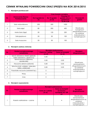 CENNIK WYNAJMU POWIERZCHNI ORAZ SPRZĘTU NA ROK 2014/2015 1. Wynajem pomieszczeń Czas trwania wynajmu Powyżej 12 Do 12 godzin godzin oraz w (w zł) godzinach 22.00-6.00 Lp. Oznaczenie/Nazwa Pomieszczenia 1 Sala widowiskowa 200 500 1000 2 Sala zajęć 80 200 400 3 Mała Sala Zajęć 50 125 250 4 Sala językowa 20 50 100 5 Sala muzyczna 20 50 100 Do 3 godzin (w zł) Powyżej 24 godzin Stawki przy wynajmach długookresowych są ustalane indywidualne z wynajmującym 2. Wynajem zastawy stołowej Lp. Rodzaj wynajmowanego przedmiotu Serwis obiadowy (talerz głęboki, talerz obiadowy, deserowy) Serwis kawowy (filiżanka, spodeczek) 1 2 Wynajem jednorazowy Cena za 1 sztukę Cena za komplet (w zł) (w zł) 0,40 1 0,30 0,50 3 Naczynia szklane (szklanki) 0,30 0,50 4 Sztućce (nóż, widelec, łyżeczka, łyżka, widelczyk) 0,20 0,50 5 Pozostałe naczynia (salaterki itp.) 2 - 6 Wazy 5 - 7 Inne 5 - Wynajem długookresowy Stawki przy zamówieniach długookresowych są ustalane indywidualnie z wynajmującym 3. Wynajem wyposażenia Lp. 1 Rodzaj wynajmowanego przedmiotu Krzesło rozkładane – czarne Wynajem jednorazowy Cena za komplet Cena za 1 sztukę (w zł) przy (w zł) wynajmie do 100 szt. 5 4 Wynajem długookresowy Stawki przy zamówieniach długookresowych są ustalane indywidualnie z wynajmującym