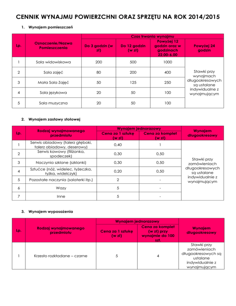 cennik wynajmu powierzchni oraz sprzętu na rok