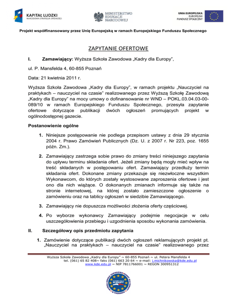 Projekt współfinansowany przez Unię Europejską w ramach Europejskiego Funduszu Społecznego ZAPYTANIE OFERTOWE I. Zamawiający: Wyższa Szkoła Zawodowa „Kadry dla Europy”, ul. P. Mansfelda 4, 60-855 Poznań Data: 21 kwietnia 2011 r. Wyższa Szkoła Zawodowa „Kadry dla Europy”, w ramach projektu „Nauczyciel na praktykach – nauczyciel na czasie” realizowanego przez Wyższą Szkołę Zawodową „Kadry dla Europy” na mocy umowy o dofinansowanie nr WND – POKL.03.04.03-00089/10 w ramach Europejskiego Funduszu Społecznego, przesyła zapytanie ofertowe dotyczące publikacji dwóch ogłoszeń promujących projekt w ogólnodostępnej gazecie. Postanowienie ogólne 1. Niniejsze postępowanie nie podlega przepisom ustawy z dnia 29 stycznia 2004 r. Prawo Zamówień Publicznych (Dz. U. z 2007 r. Nr 223, poz. 1655 późn. Zm.). 2. Zamawiający zastrzega sobie prawo do zmiany treści niniejszego zapytania do upływu terminu składania ofert. Jeżeli zmiany będą mogły mieć wpływ na treść składanych w postępowaniu ofert. Zamawiający przedłuży termin składania ofert. Dokonane zmiany przekazuje się niezwłoczne wszystkim Wykonawcom, do których zostały wystosowane zaproszenia ofertowe i jest ono dla nich wiążące. O dokonanych zmianach informuje się także na stronie internetowej, na której zostało zamieszczone ogłoszenie o zamówieniu oraz na tablicy ogłoszeń w siedzibie Zamawiającego. 3. Zamawiający nie dopuszcza możliwości złożenia oferty częściowej. 4. Po wyborze wykonawcy Zamawiający podejmie negocjacje w celu uszczegółowienia przebiegu i uzgodnienia sposobu wykonania zamówienia. II. Szczegółowy opis przedmiotu zapytania 1. Zamówienie dotyczące publikacji dwóch ogłoszeń reklamujących projekt pt. „Nauczyciel na praktykach – nauczyciel na czasie” realizowanego przez Wyższa Szkoła Zawodowa „Kadry dla Europy” ~ 60-855 Poznań ~ ul. Petera Mansfelda 4 tel. (061) 65 82 408~ faks (061) 663 20 64 ~ e-mail: [email protected] www.kde.edu.pl ~ NIP 7811766001 ~ REGON 300951312 Projekt współfinansowany przez Unię Europejską w ramach Europejskiego Funduszu Społecznego Wyższą Szkołę Zawodową „Kadry dla Europy” współfinansowanego przez Unię Europejską w ramach Europejskiego Funduszu Społecznego. 2. Opublikowanie ogłoszenia w ogólnodostępnej gazecie Prosimy o podanie kosztorysu na umieszczenie dwóch ogłoszeń prasowych reklamujących projekt w terminie ustalonym w harmonogramie wynikającym z umowy w sześciu województwach. 3. Rozmiar artykułu: 1/2 strony, format A4, kolor 4. Zawartość: tekst, pełny kolor, znaki graficzne, logo programu Kapitał Ludzki Narodowa Strategia Spójności, flaga UE, logo Ministerstwa Edukacji Narodowej, logo Wyższej Szkoły Zawodowej „Kadry dla Europy”, hasło: ”Człowiek najlepsza inwestycja!”, fotografia. 5. Treść i wzór artykułu będą każdorazowo uzgadniane z Zamawiającym z wyprzedzeniem pozwalającym na jego emisję. 6. Ogłoszenie reklamowe musi ukazać się w sześciu województwach: wielkopolskie, zachodniopomorskie, lubuskie, kujawsko- pomorskie, dolnośląskie i łódzkie. 7. Oferty należy składać w odniesieniu do dwóch części. III. Oferta musi zawierać: 1.Kosztorys (w kwotach netto oraz brutto) opublikowania dwóch ogłoszeń. 2.Informację o nakładzie ilościowym gazety. UWAGA: Każdy z wykonawców biorących udział w postępowaniu może złożyć tylko jedną ofertę. Oferta powinna zostać podpisana przez osoby upoważnione do reprezentowania oferenta zgodnie z aktami statutowymi wykonawcy. IV. Wykonanie przedmiotu zamówienia zostanie zlecone podmiotowi, którego oferta uzyska największą liczbę zgodnie z kryteriami oceny ofert. V. Kryteria oceny ofert: a) Cena : 80 % Wyższa Szkoła Zawodowa „Kadry dla Europy” ~ 60-855 Poznań ~ ul. Petera Mansfelda 4 tel. (061) 65 82 408~ faks (061) 663 20 64 ~ e-mail: [email protected] www.kde.edu.pl ~ NIP 7811766001 ~ REGON 300951312 Projekt współfinansowany przez Unię Europejską w ramach Europejskiego Funduszu Społecznego b) Ilość nakładu : 20 % VI. Termin i miejsce składania ofert: Zamówienie zrealizowane będzie w następujących terminach: pierwszy artykuł zostanie wyemitowany w maju 2011r., drugi w miesiącu listopad 2011r. Oferty w zamkniętych kopertach z dopiskiem „Ogłoszenie prasowe” w projekcie „Nauczyciel na praktykach – nauczyciel na czasie” należy składać w terminie do dnia 28 kwietnia 2011 r. do godz. 15.00 w siedzibie Wyższej Szkoły Zawodowej „Kadry dla Europy”, Poznań 60-855, ul. P. Mansfelda 4, Biuro Projektów, pok. 102a (p. Natalia Kuśmierczyk) O wynikach postępowania jego uczestnicy zostaną poinformowani osobiście, poprzez faks lub droga mailową najpóźniej w dniu 04 maja do godz. 15.00. Do 05 maja 2011 r. do podmiotu wybranego w wyniku rozstrzygnięcia postępowanie ofertowego zostanie skierowane zlecenie realizacji zamówienia. Koszty związane z przygotowaniem i złożeniem oferty ponosi podmiot ubiegający się o zamówienie. VII. Osoba do kontaktów Wyjaśnień udziela p. Joanna Michnikowska – Tel. (061) 658 24 08, e-mail: [email protected] lub Natalia Kuśmierczyk – Tel. (061) 658 24 08, e-mail: [email protected] ZATWIERDZAM _______________________________________________________ Wyższa Szkoła Zawodowa „Kadry dla Europy” ~ 60-855 Poznań ~ ul. Petera Mansfelda 4 tel. (061) 65 82 408~ faks (061) 663 20 64 ~ e-mail: [email protected] www.kde.edu.pl ~ NIP 7811766001 ~ REGON 300951312